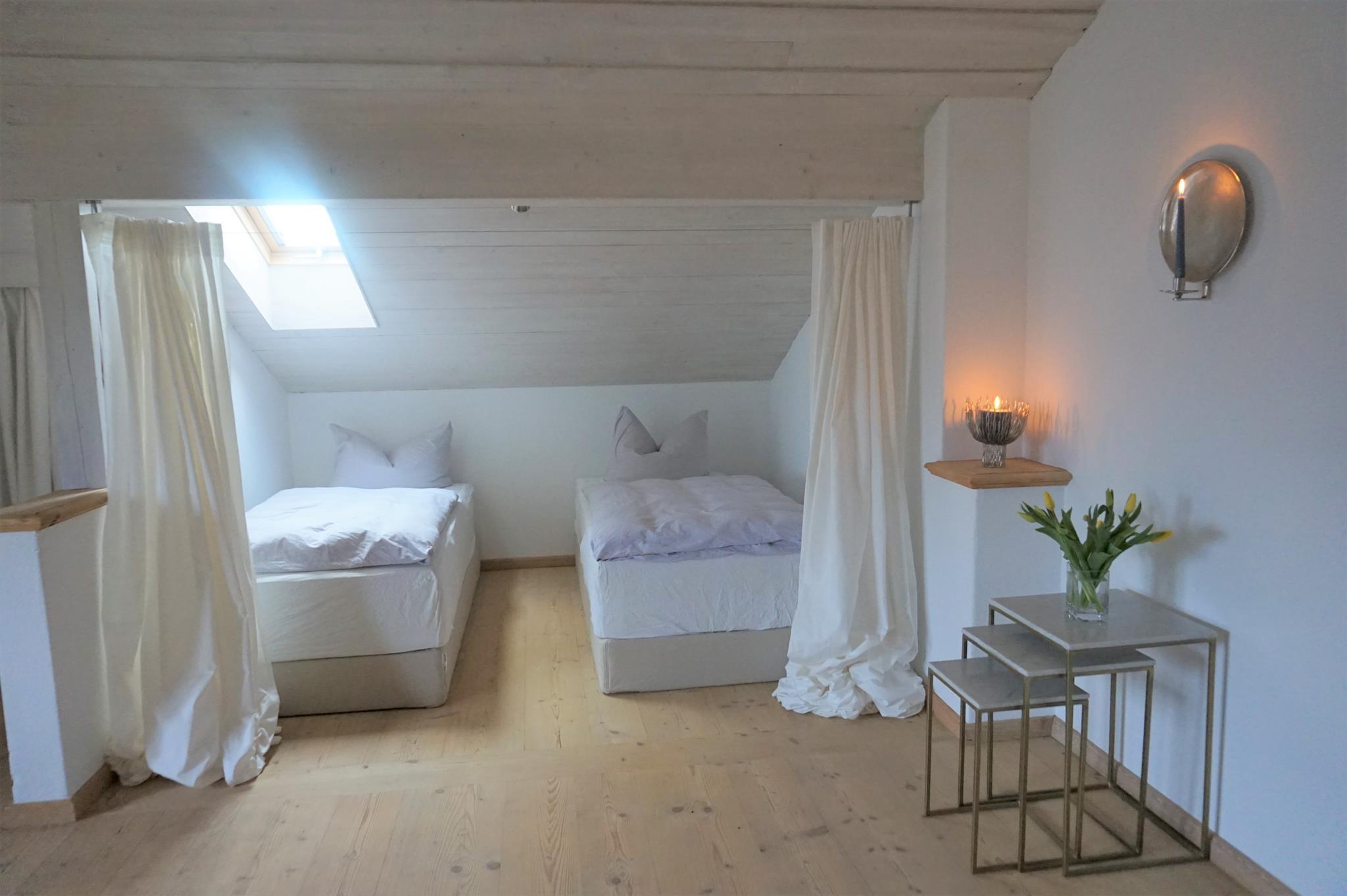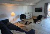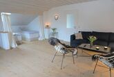 Wohn-Schlafzimmer: Gemütliche Sitzecke mit Schlafcouch; 2 Boxspringbetteen (90x200); SAT-SMART-TV, WLAN