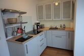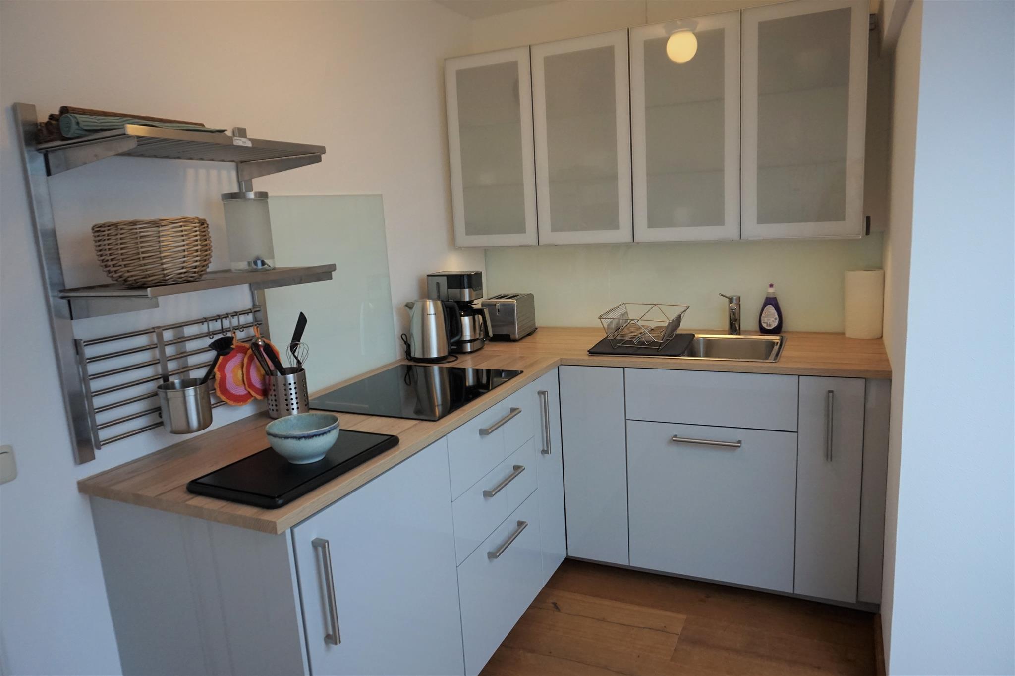 Küche: Spülmaschine, Herd mit 3er-Ceranfeld, Kühlschrank mit Gefrierfach, Kaffeemaschine, Wasserkocher, Essplatz mit Panoramafenster
