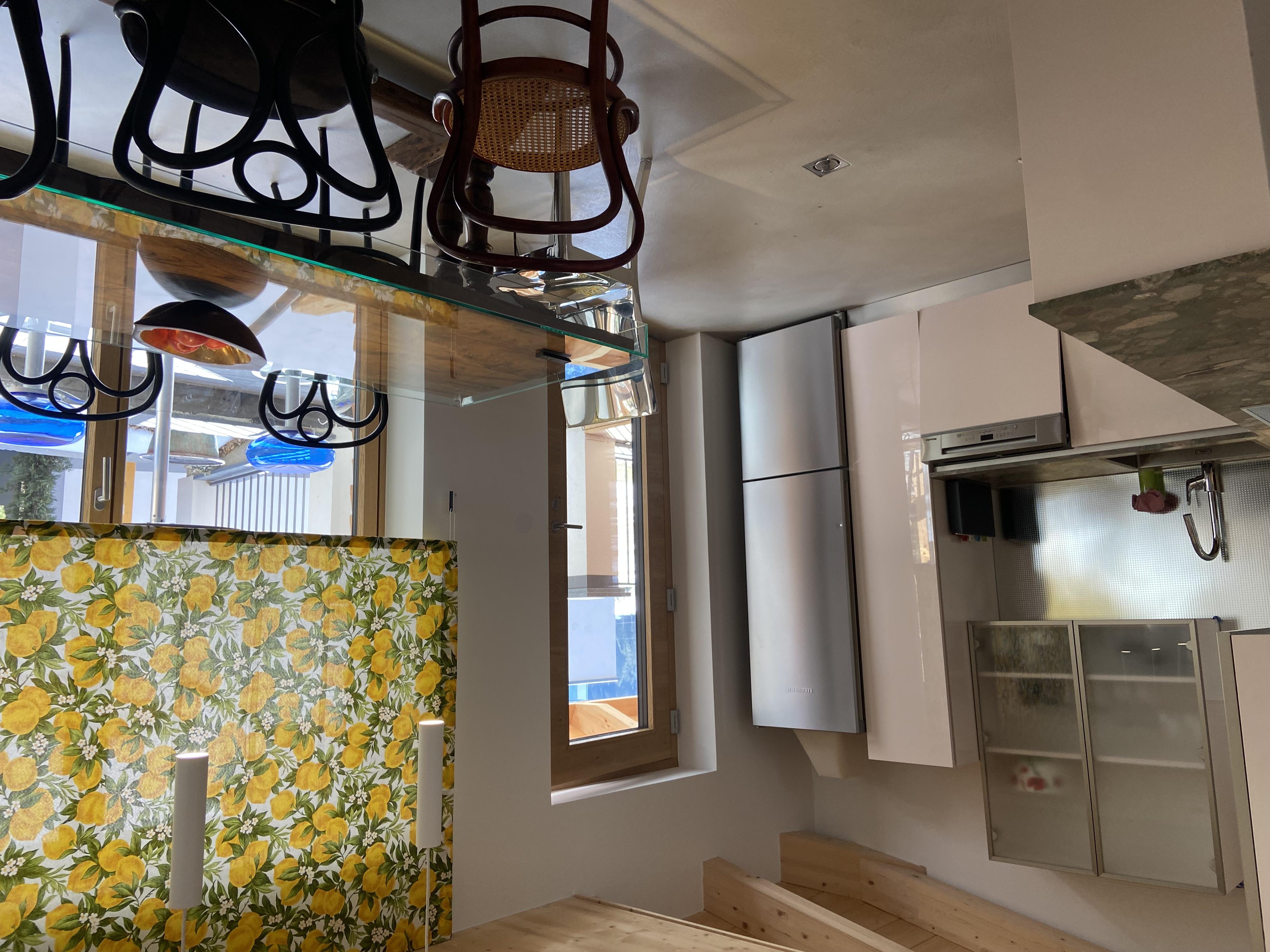 Wohnzimmer mit offenem Kamin - Balkon; Internet - kein TV - Küche voll ausgestattet mit Essplatz, Induktionskochfeld, Geschrirspüler.