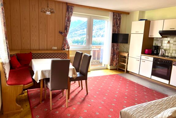 Das Appartement 2 Ost ist sehr sonnig und ruhig und verfügt über einen Balkon mit Blick auf das Tal. Die Wohnfläche beträgt 65m2 und ist mit zwei Zweibettzimmern mit zusätzlich jeweils einer Klappcouch, einer Wohnküche, einem Badezimmer mit Dusche und Waschmaschine sowie einem separaten WC ausgestattet. Die großzügige Wohnküche verfügt über eine Küchenzeile (Kühlschrank, 4-Platten Herd, Backrohr, Geschirrspüler, Spüle, Dunstabzug, Kaffeemaschine, Wasserkocher, Toaster,  Geschirr und Besteck), eine Sitzecke, ein Sofa und SAT-TV.