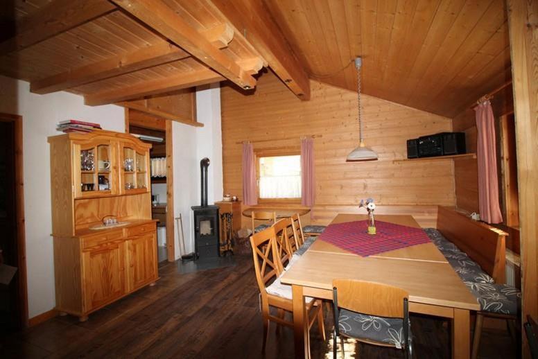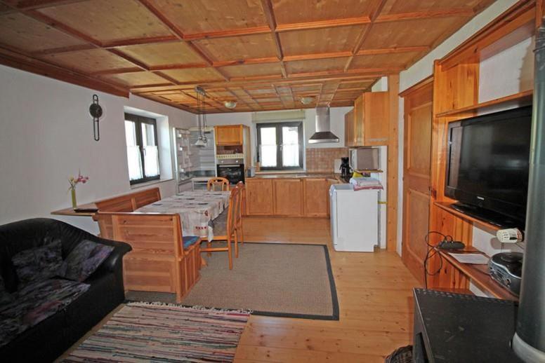 Die Ausstattung beinhaltet eine Wohnküche mit Küchenzeile, Mikrowelle, Essbereich mit Eckbank sowie bequemer Couch, Fernseher und Holzofen für die Gemütlichkeit. Eine Kaffeemaschine, Geschirr, Töpfe, Teller und Besteck sind vorhanden.