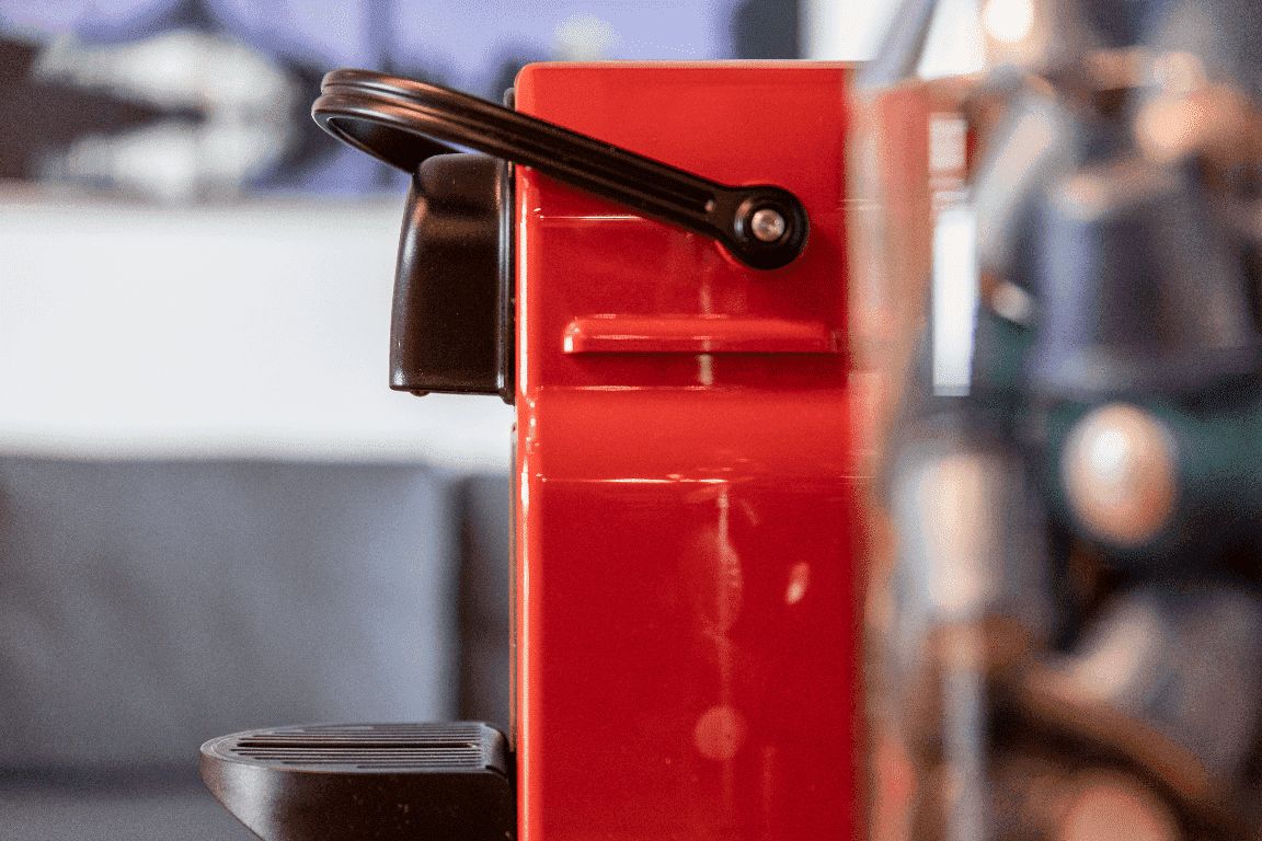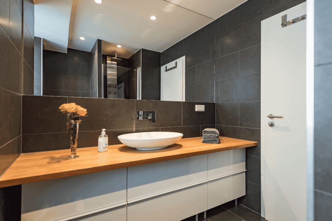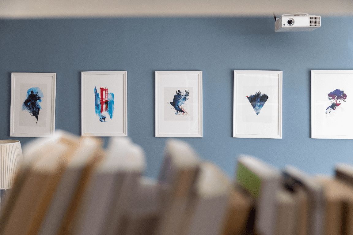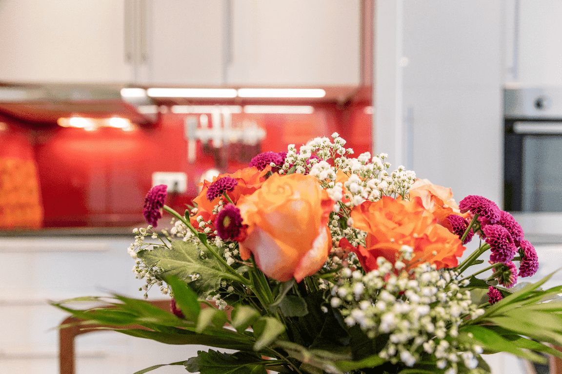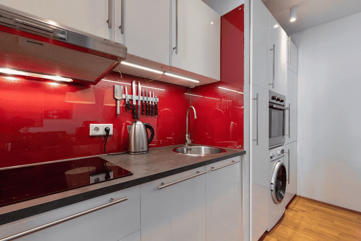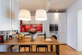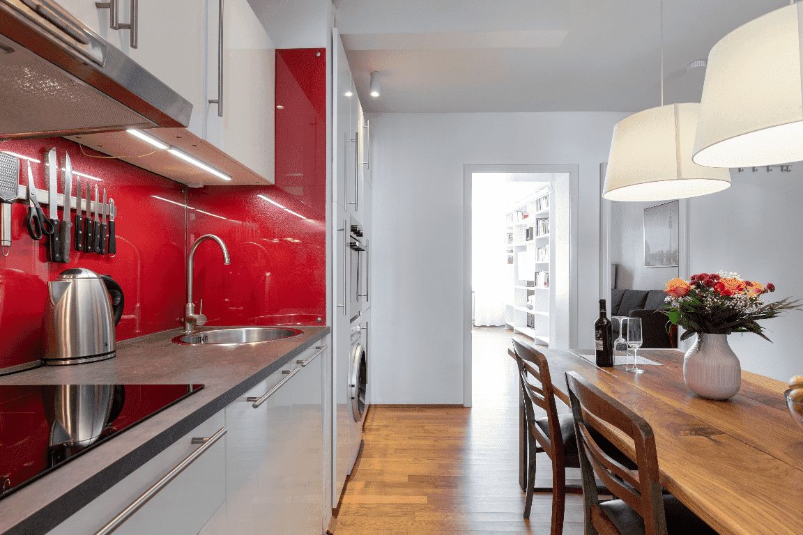 Klare Linien, ganz in Weiß gehaltenes Dekor und glänzende Hartholzböden bilden den Hintergrund für eine tiefblaue Wand und eine rubinrote Küchenrückwand.