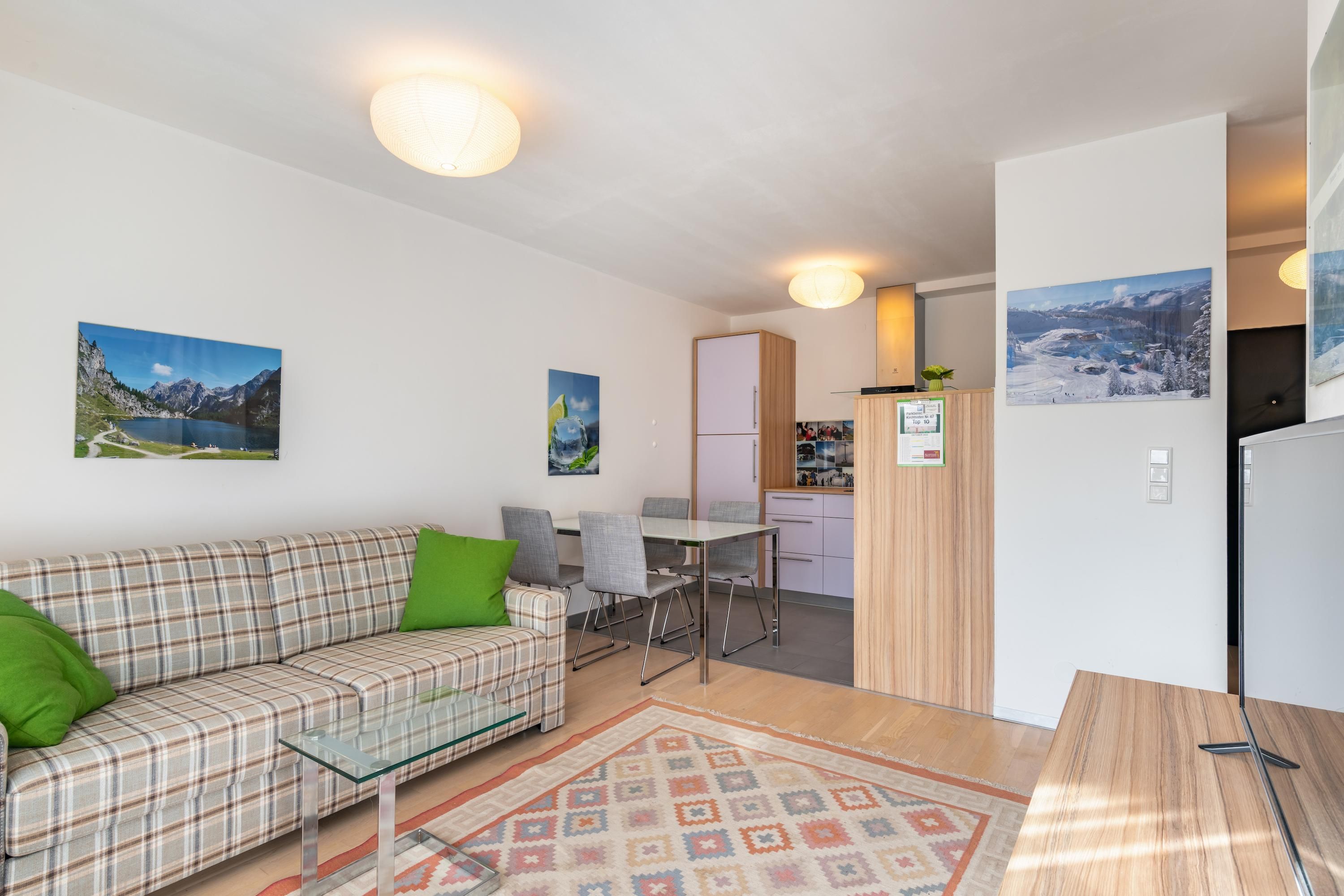 Dich erwartet ein 30 Quadratmeter-Apartment mit Schlafzimmer (Doppelbett), Wohnküche und Badezimmer.