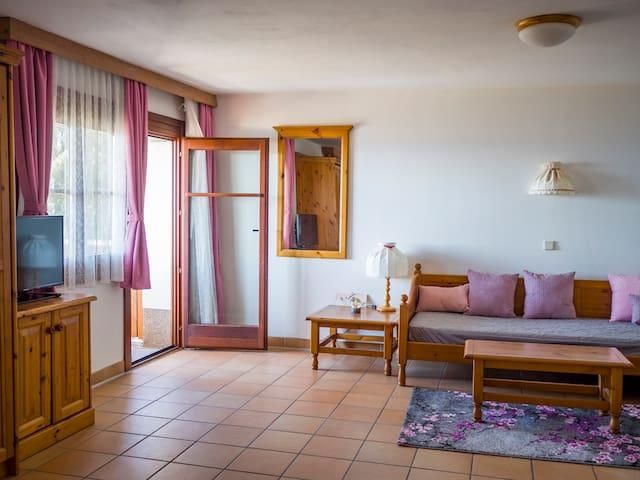 Das 40m² große Apartment im typisch regionalen Stil verfügt über einen Balkon und bietet Platz für 2 Gäste. Diese gemütliche Ferienwohnung bietet alle Annehmlichkeiten für einen erholsamen Aufenthalt und gliedert sich in: einen Wohnbereich mit zwei Einzelbetten sowie ein klassisches Bad mit großzügigem Waschtisch, Dusche und WC. Die integrierte Küche mit Herd, Kühlschrank, Gefrierfach, Wasserkocher und Kaffeemaschine ist bestens ausgestattet, um auch selbst einmal ein paar Köstlichkeiten zuzubereiten. Genießen Sie die Ruhe und frische Luft inmitten der Natur und tanken Sie jeden Tag frische Energie auf.