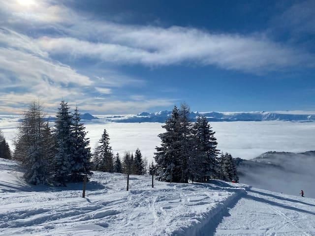 Unsere geräumigen Ferienwohnungen bieten dir den perfekten Rückzugsort nach einem ereignisreichen Tag auf der Piste. Stell dir vor, wie du morgens aus dem Fenster schaust und direkt auf die verschneiten Berge blickst. Diese einzigartige Lage macht uns zu einer Top-Wahl für alle Skibegeisterten.