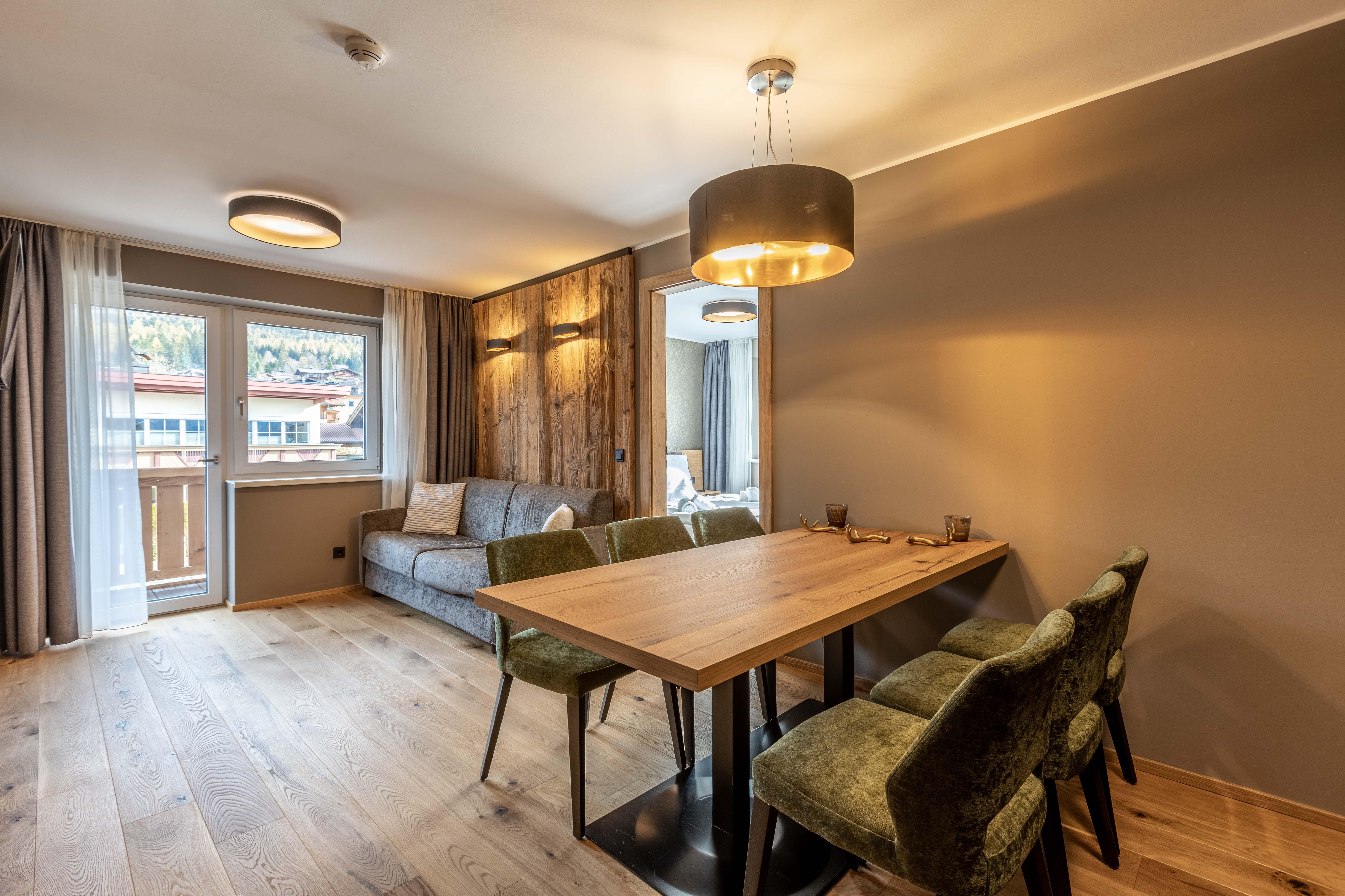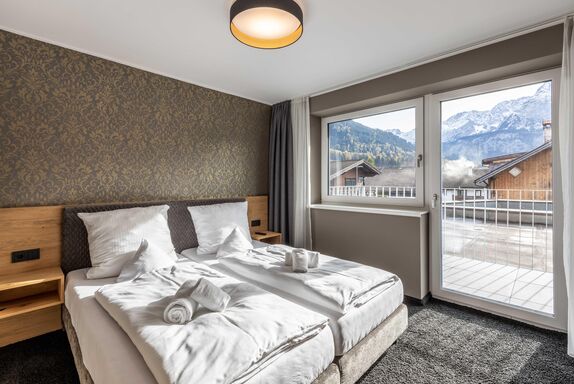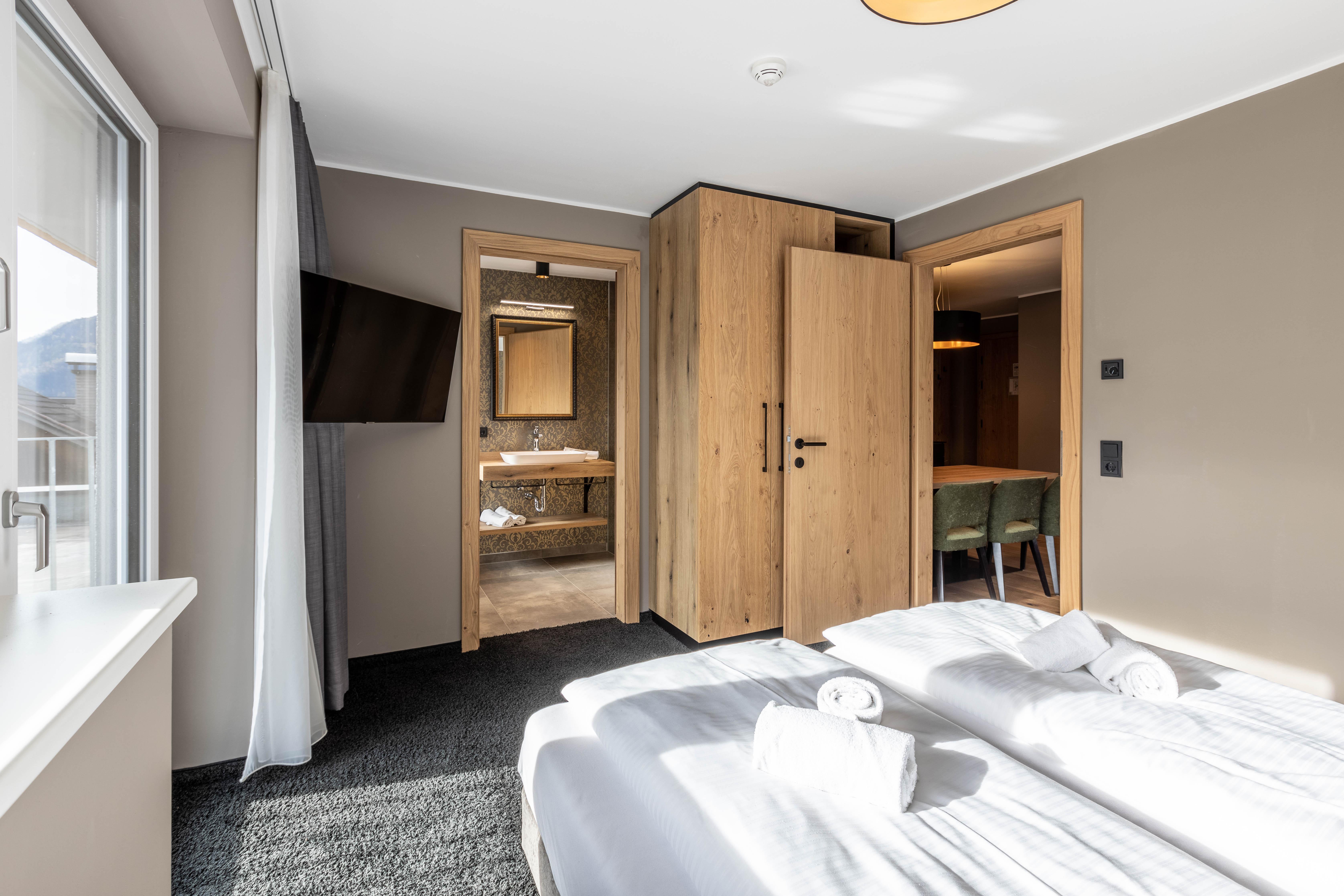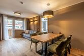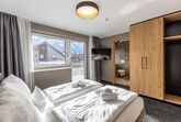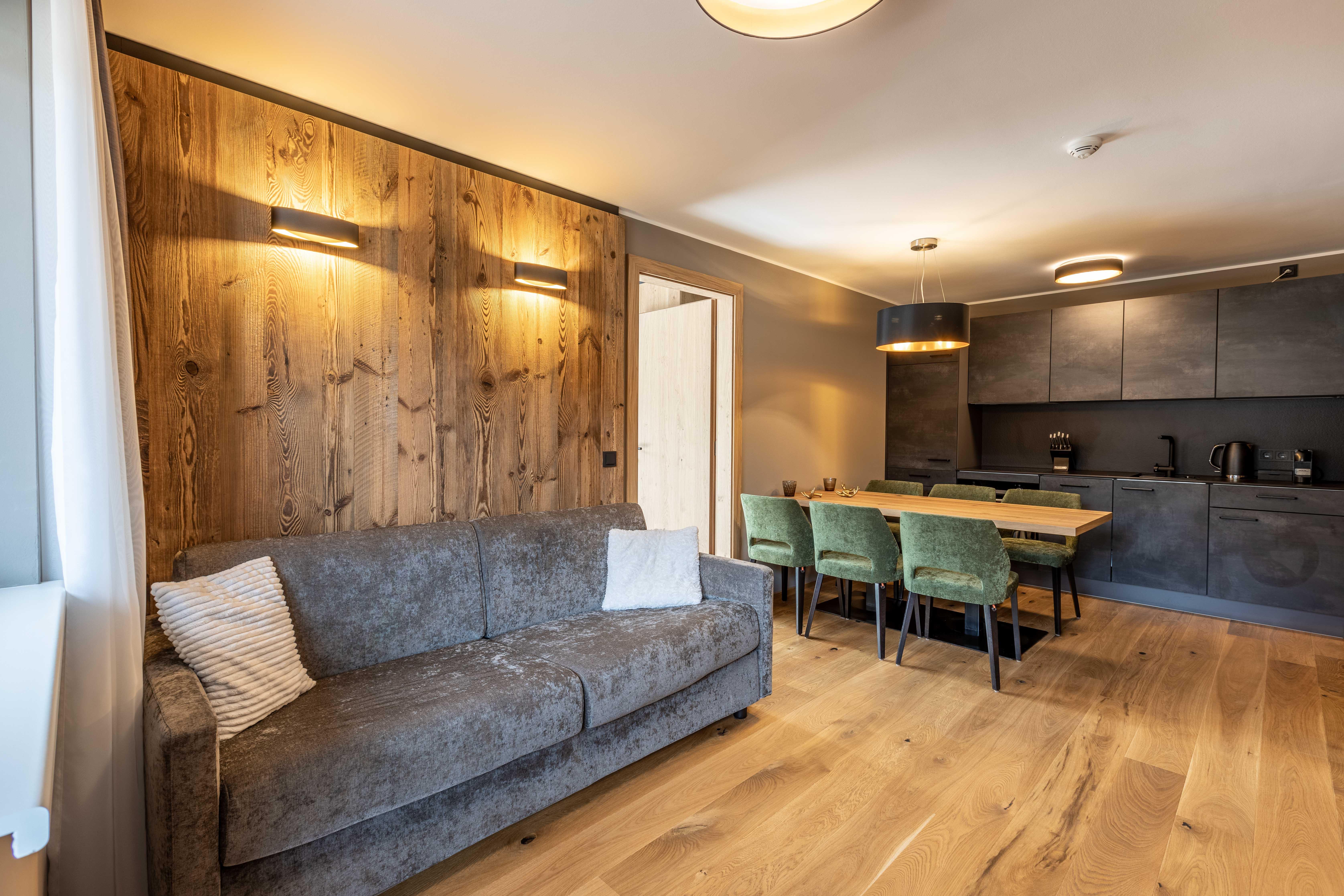 Das Apartment bietet Platz für 6 Personen und bietet Wohnküche, 2 Schlafzimmer (Boxspringbetten - 1x Zugang Balkon/ 1x Terrasse+eigenes Bad), 2 Badezimmer, separates WC + Balkon. Der Eingangsbereich, mit Garderobe, führt direkt in die Wohnküche, welche mit Küchengeräten, Kühl-Gefrierkombi sowie Nespresso Kaffeemaschine ausgestattet ist. Der Esstisch bietet Platz, um gemeinsam ein selbstgekochtes Mahl zu genießen. Im anschließenden Wohnbereich befinden sich TV, Kleiderschrank und Ausziehsofa.
