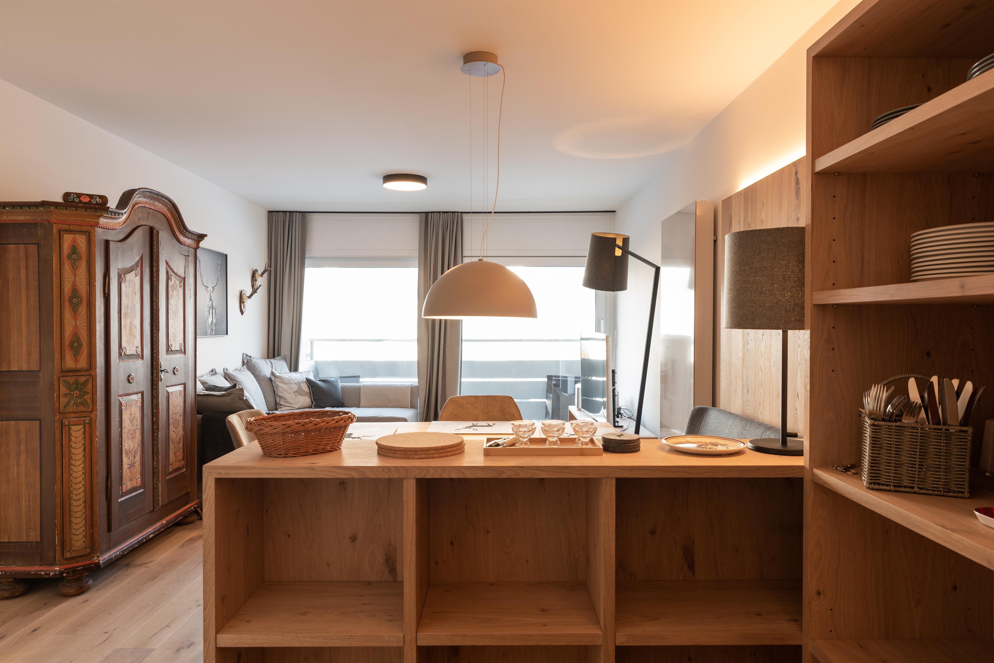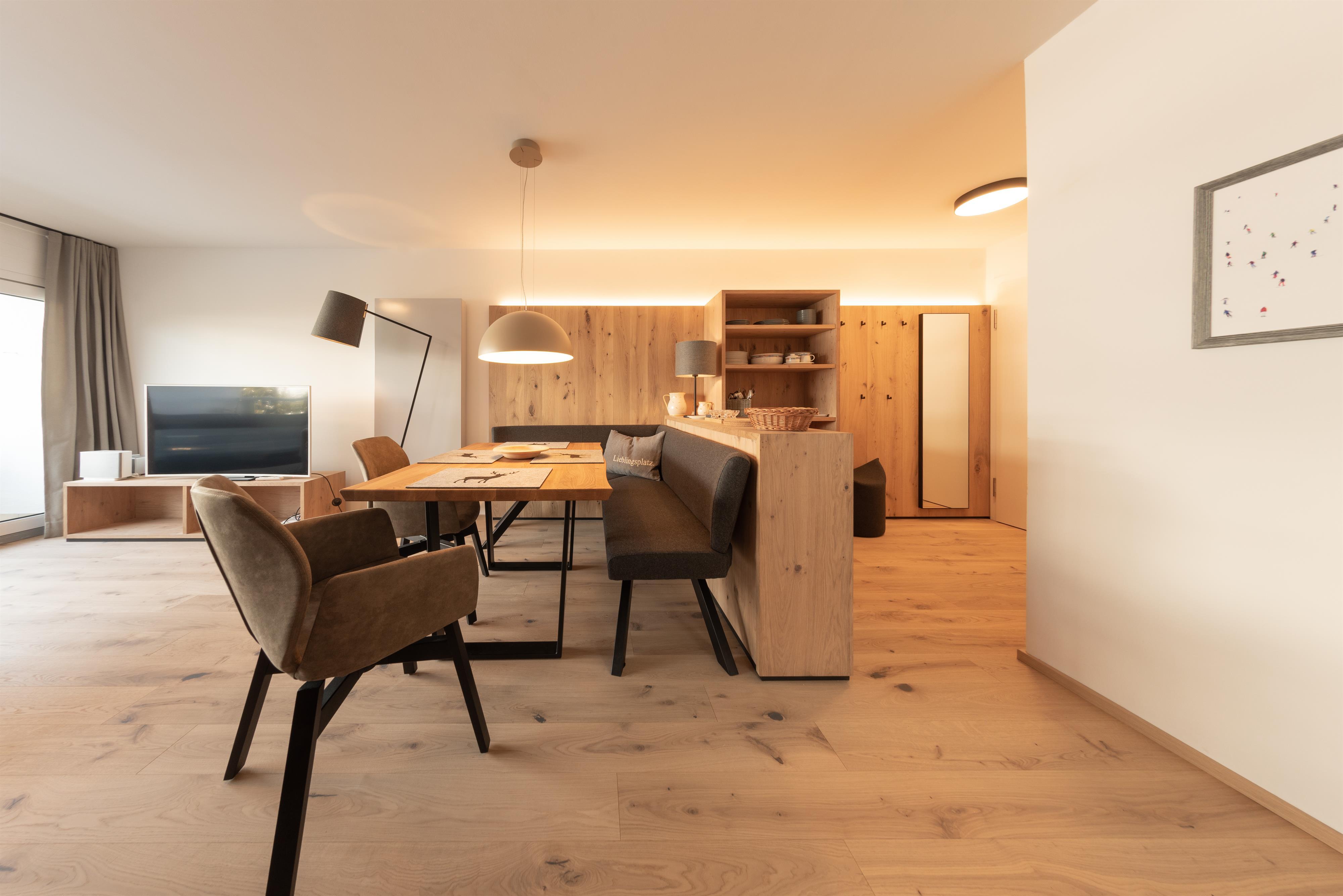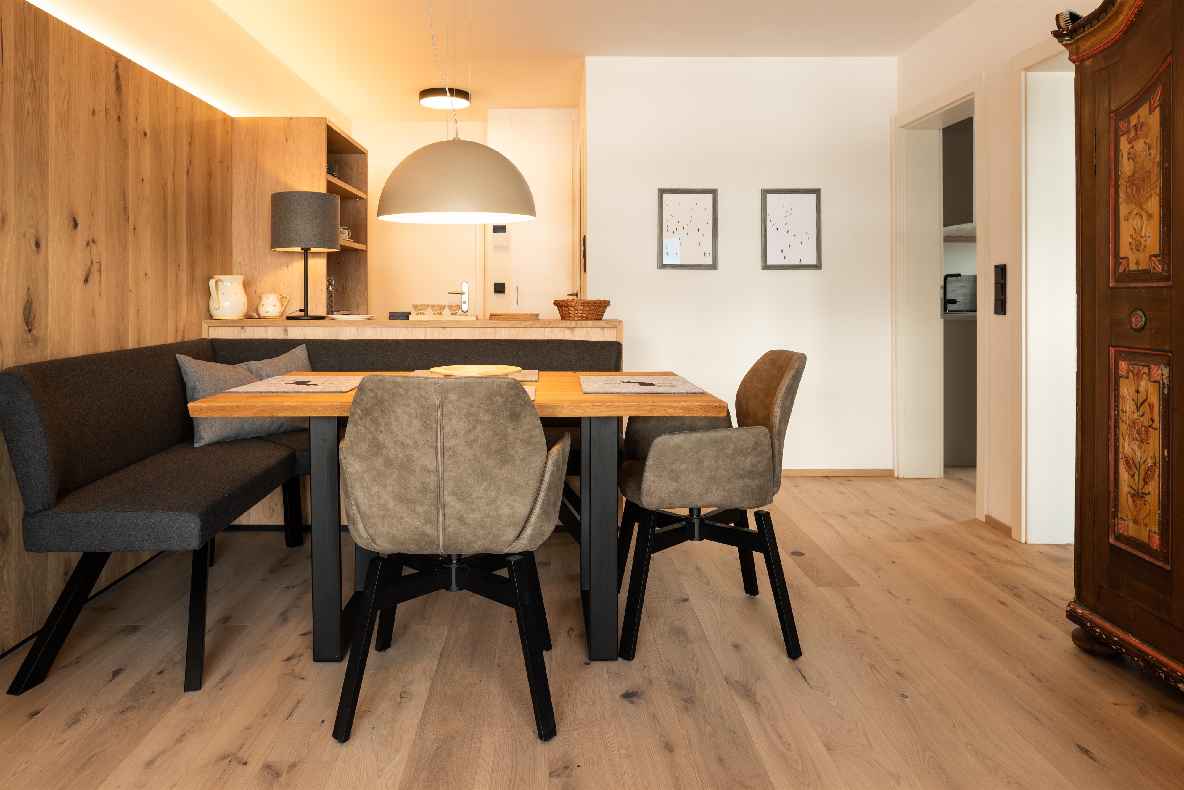 Bis Ende November 22 wurde die Wohnung komplett renoviert, mit Ausnahme vom Bad. Holzdielen wurden überall verlegt. Im Schlafzimmer gibt es jetzt einen Arbeitsplatz, der mit einem Rechner und Tastatur ausgestattet ist fürs Homeoffice; schon beim Aufwachen kann man den super Blick auf den Wilden Kaiser genießen. Im Wohnzimmer steht jetzt eine gemütliche Eckbank. Alle Möbel sind maßgefertigt von einer einheimischen Tischlerei.