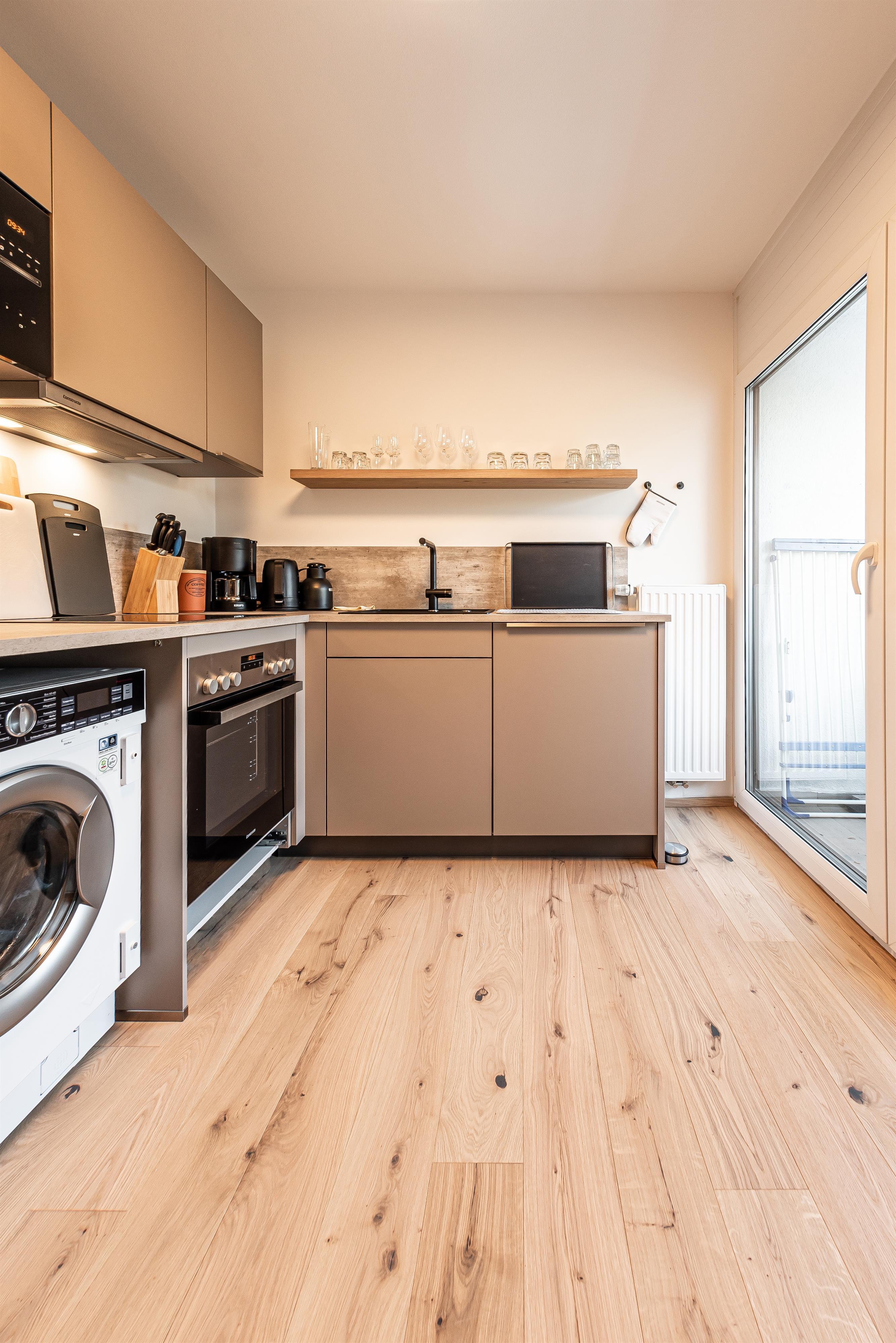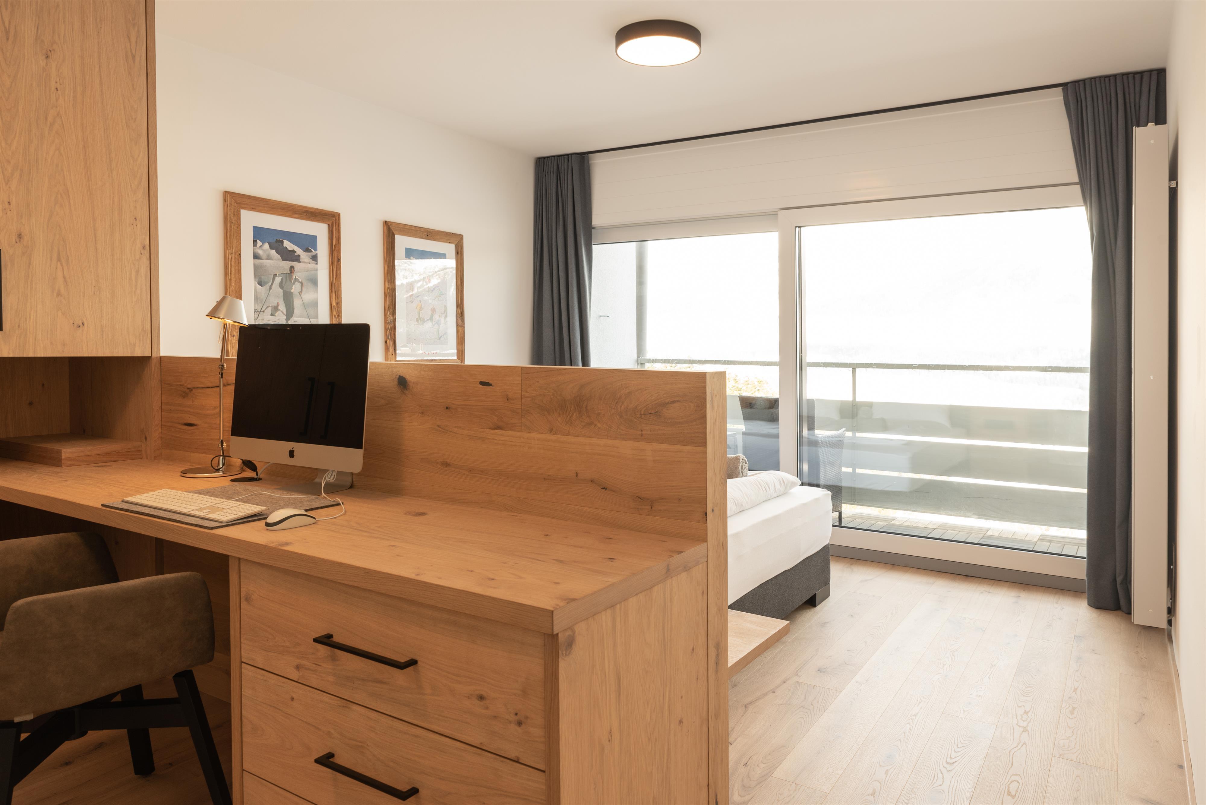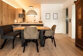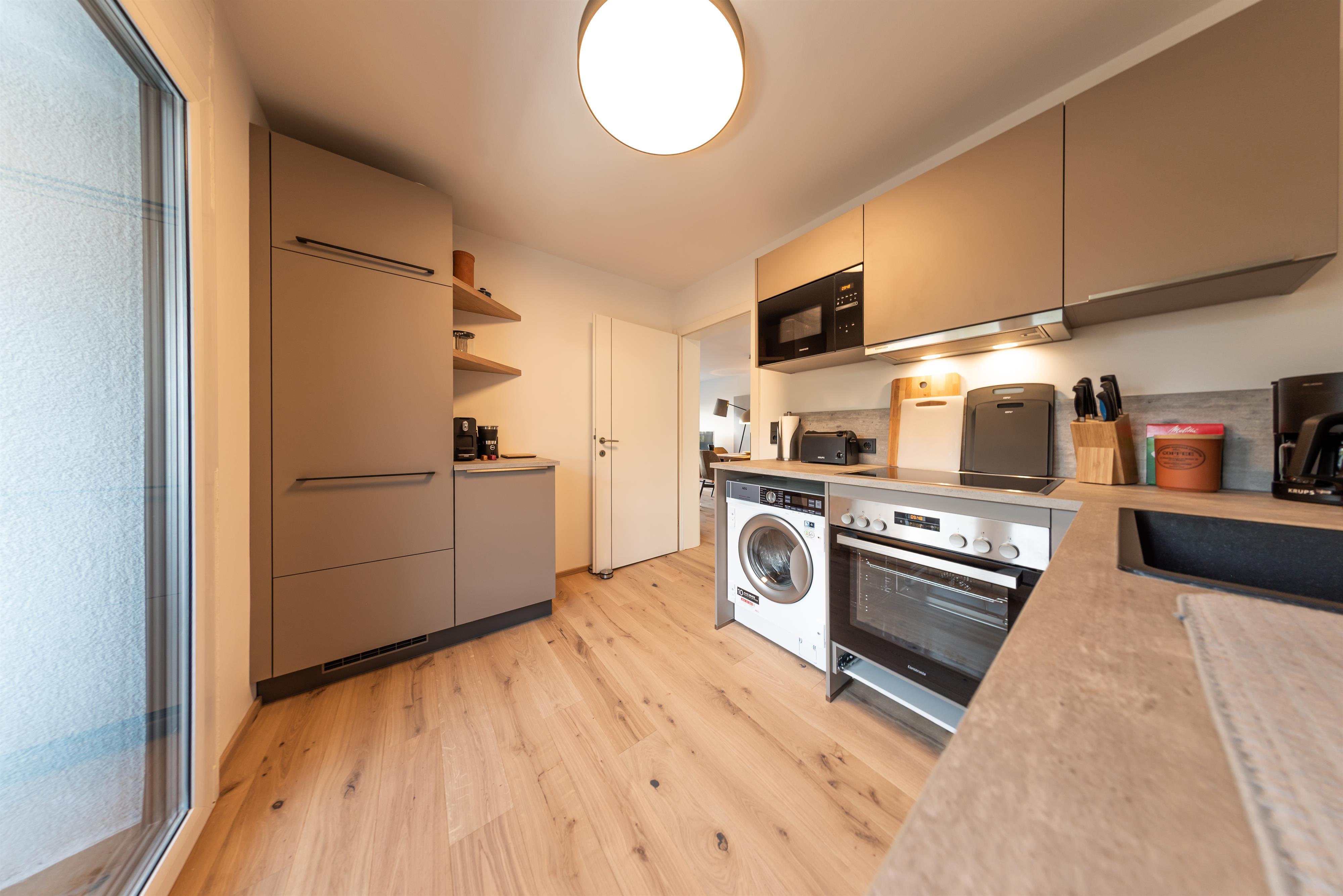 Bis Ende November 22 wurde die Wohnung komplett renoviert, mit Ausnahme vom Bad. Holzdielen wurden überall verlegt. Im Schlafzimmer gibt es jetzt einen Arbeitsplatz, der mit einem Rechner und Tastatur ausgestattet ist fürs Homeoffice; schon beim Aufwachen kann man den super Blick auf den Wilden Kaiser genießen. Im Wohnzimmer steht jetzt eine gemütliche Eckbank. Alle Möbel sind maßgefertigt von einer einheimischen Tischlerei.