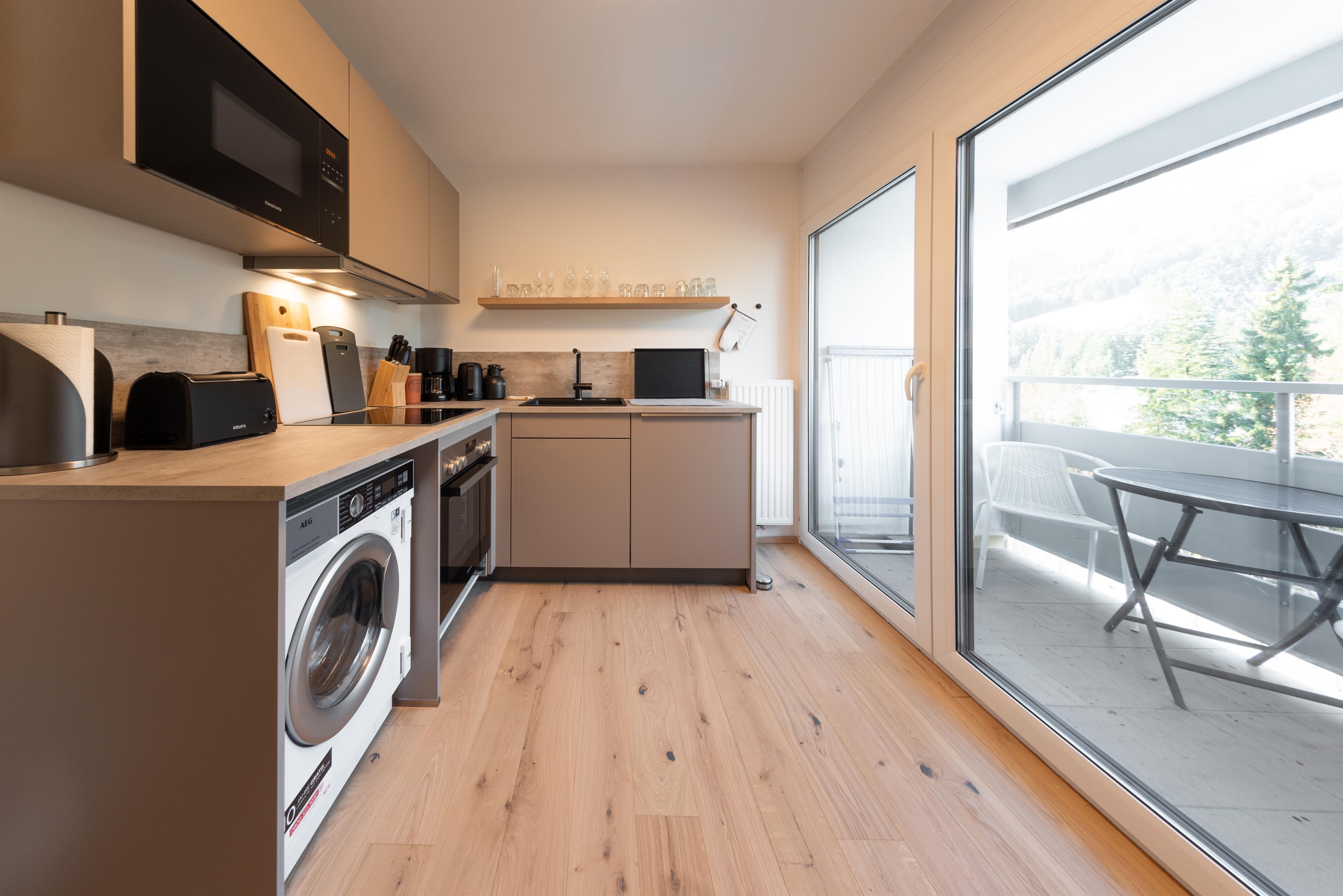 Das Apartment Alpenblick besteht aus einem Schlafzimmer mit neuem Boxspringbett (180x200 cm, 2 getrennte Matratzen), einem Wohnzimmer mit einer Schlafcouch (Liegefläche 1,40m x 2,04 m), einer neuen Küche und einem Badezimmer mit Dusche auf insgesamt 70 qm2. Es liegt im dritten Stock des Berghofes und hat zwei Balkone mit einem phantastischen Blick auf den Wilden Kaiser und das Ellmauer Tor, zusätzlich einen Westbalkon zum Sonnen ab mittags, vor der Küche. Die Küche ist ausgestattet mit einer Spülmaschine, einem Backofen, einer Mikrowelle, einer Cremesso Kapselmaschine, einer normalen Kaffeemaschine und einer Waschmaschine mit Trockner. Ein großer Fernseher lädt im Wohnzimmer bei schlechtem Wetter ein, unbegrenztes WLAN und zusätzlich noch Zugriff auf Netflix und Amazon Prime.