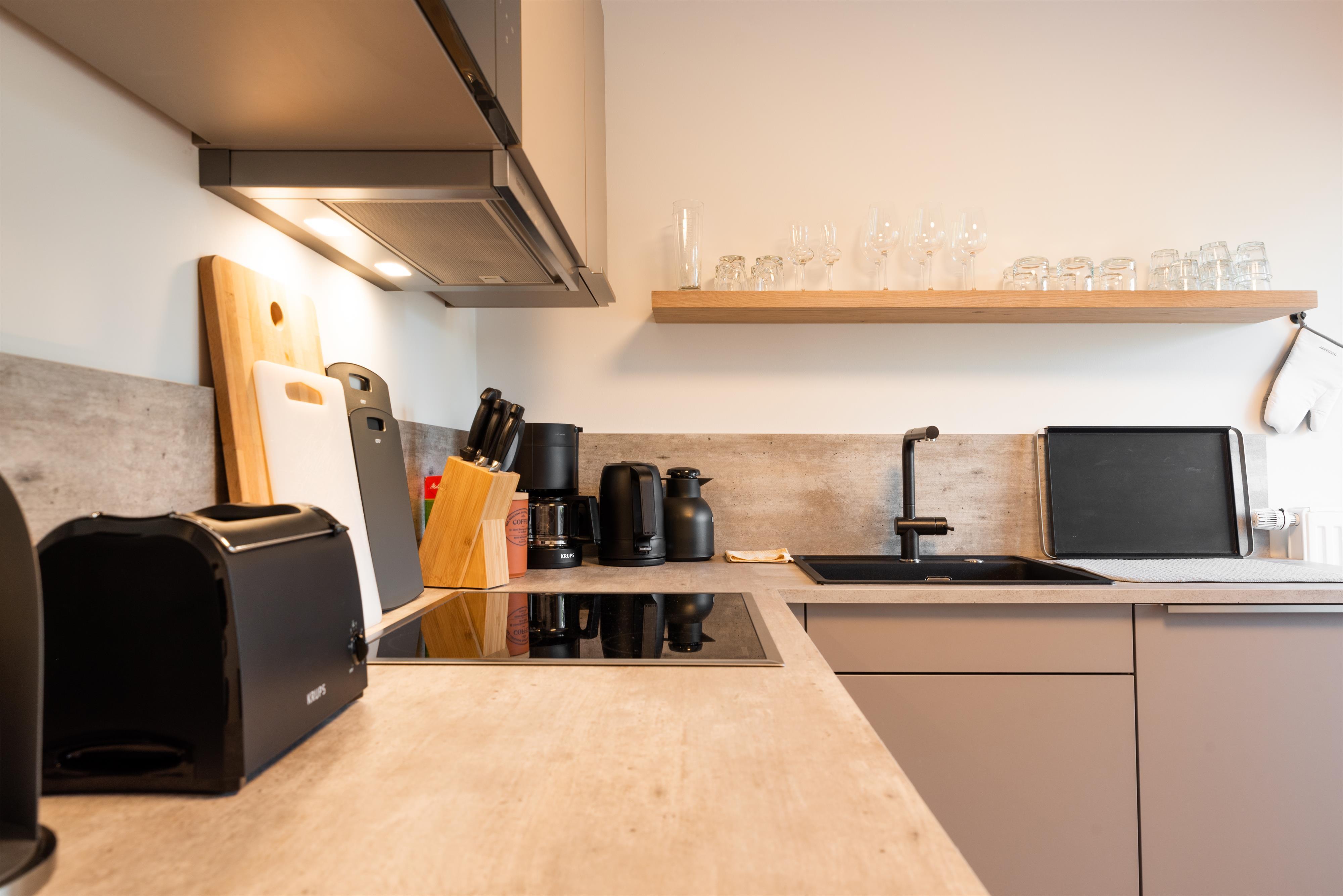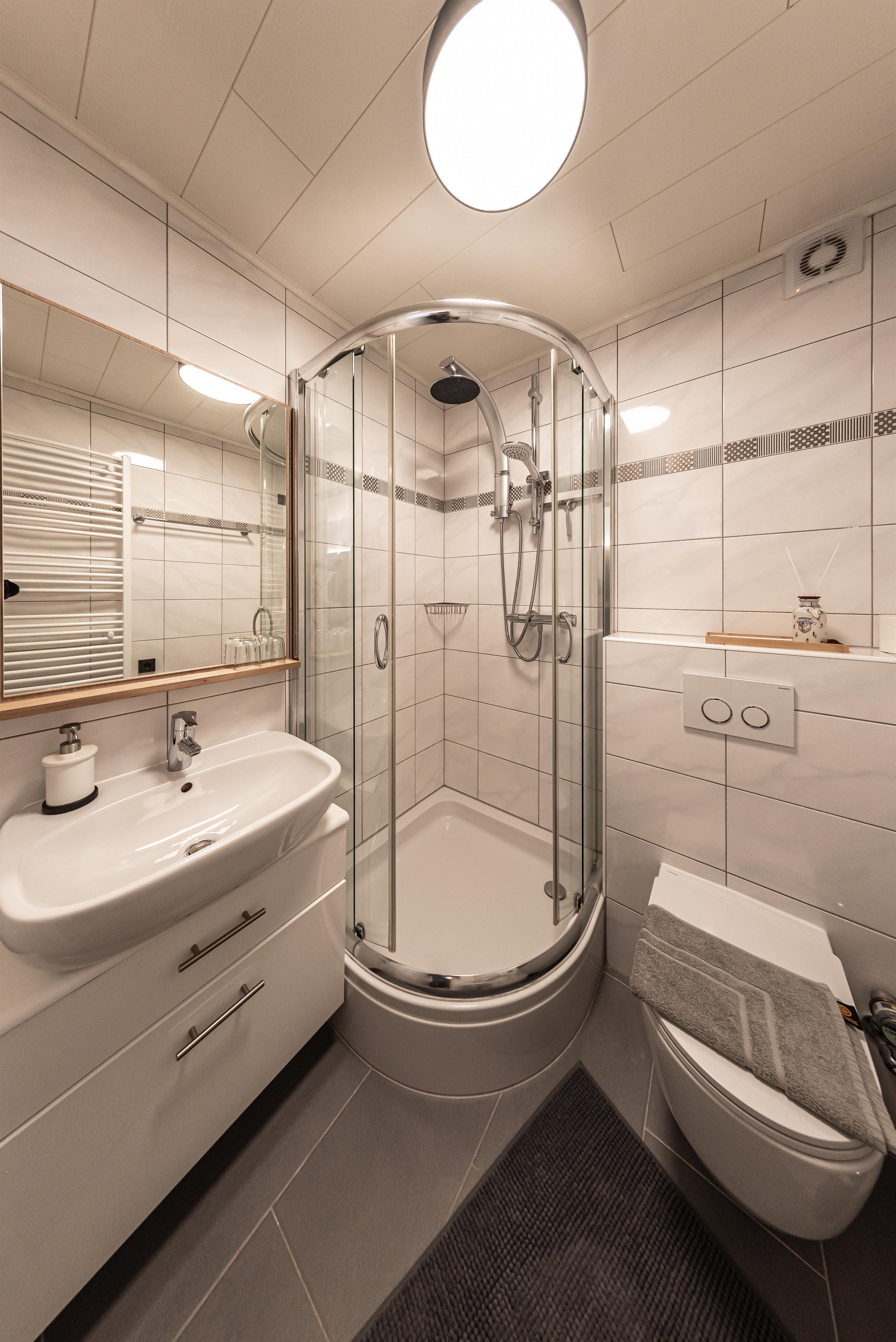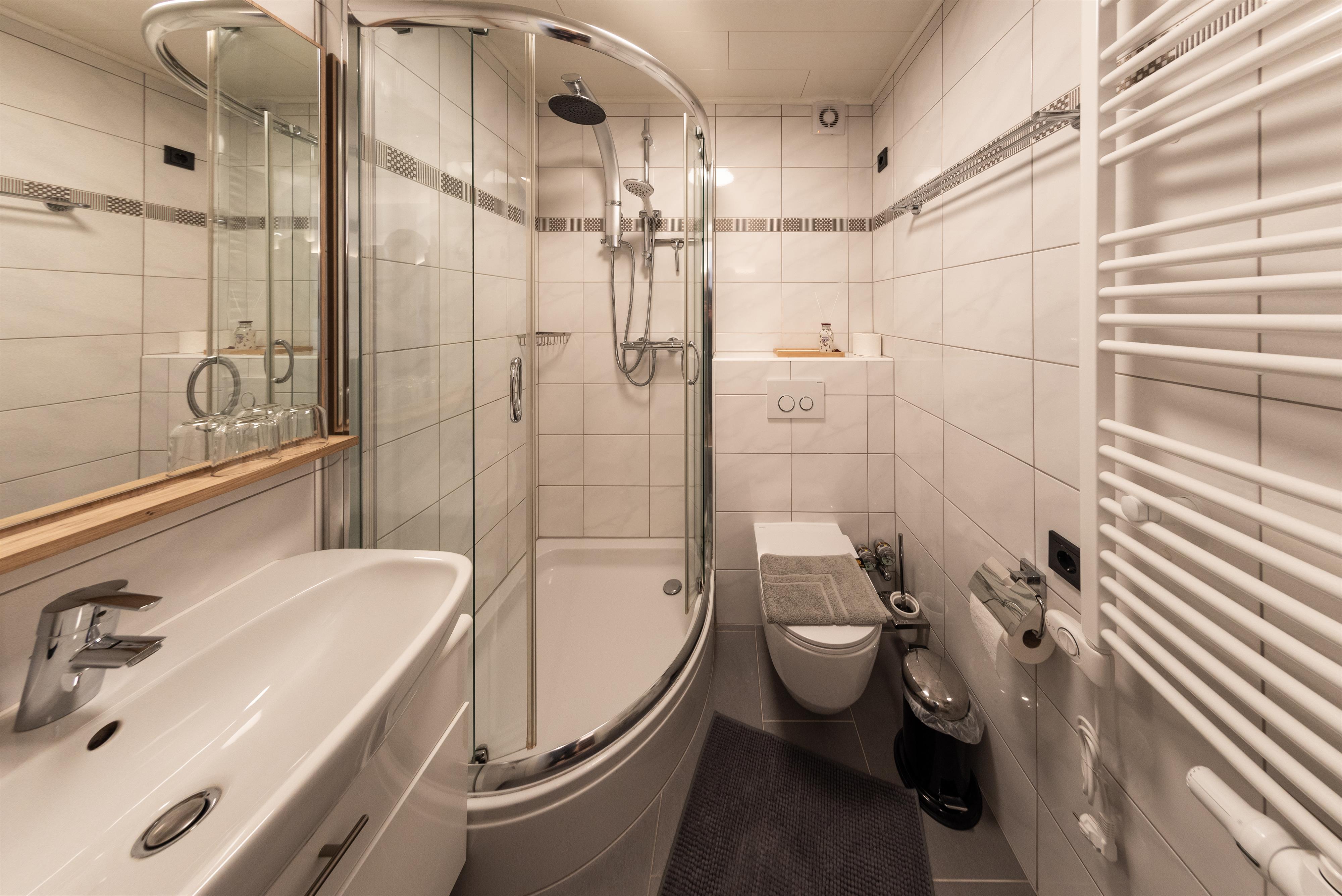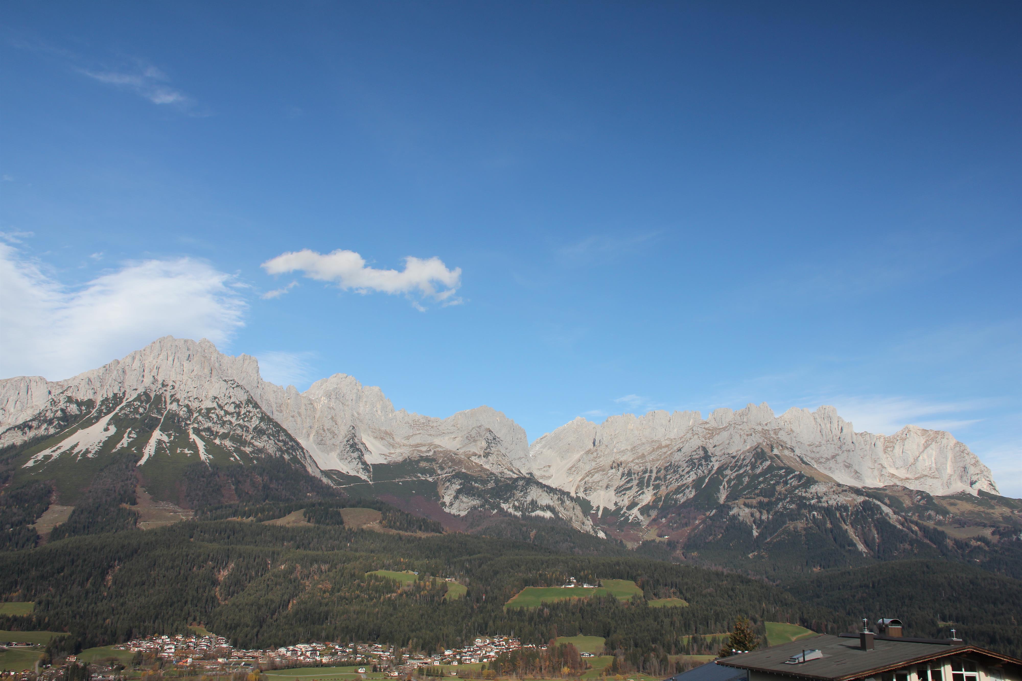 Das Apartment Alpenblick besteht aus einem Schlafzimmer, einem Wohnzimmer mit einer Schlafcouch (Liegefläche 1,40m x 2,04 m), einer Küche und einem Badezimmer mit Dusche auf insgesamt 70 qm2. Das Apartment liegt im dritten Stock des Berghofes und hat zwei Balkone mit einem phantastischen Blick auf den Wilden Kaiser und das Ellmauer Tor. Zusätzlich verfügt das Apartment über einen kleinen Westbalkon, welcher sich vor der Küche befindet und zum Sonnen ab mittags einlädt. Die Küche ist ausgestattet mit einem Backofen, einer Mikrowelle, einer Cremesso Kapselmaschine, einer Waschmaschine und ab Ende September noch zusätzlich mit einer Spülmaschine. Eine gemütliche Couch sowie der von ihr aus zu sehende, große Fernseher lädt im Wohnzimmer auf gemütliche Stunden ein. Doch eines sei im Apartment Alpenblick gesagt: das mit dem Fernsehen ist bei dem herrlichen Ausblick, welchen man auf den Wilden Kaiser hat, gar nicht so einfach - hier ist es eine wirkliche Herausforderung, dass die Augen am Bildschirm bleiben. Aus eigener Erfahrung kann gesagt werden, dass die Augen immer wieder in die malerisch-imposante Tiroler Berglandschaft abschweifen - und das, obwohl man im Apartment Alpenblick sogar Zugriff auf Unterhaltungskünstler wie Netflix und Amazon Prime hat.
