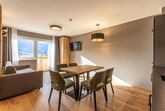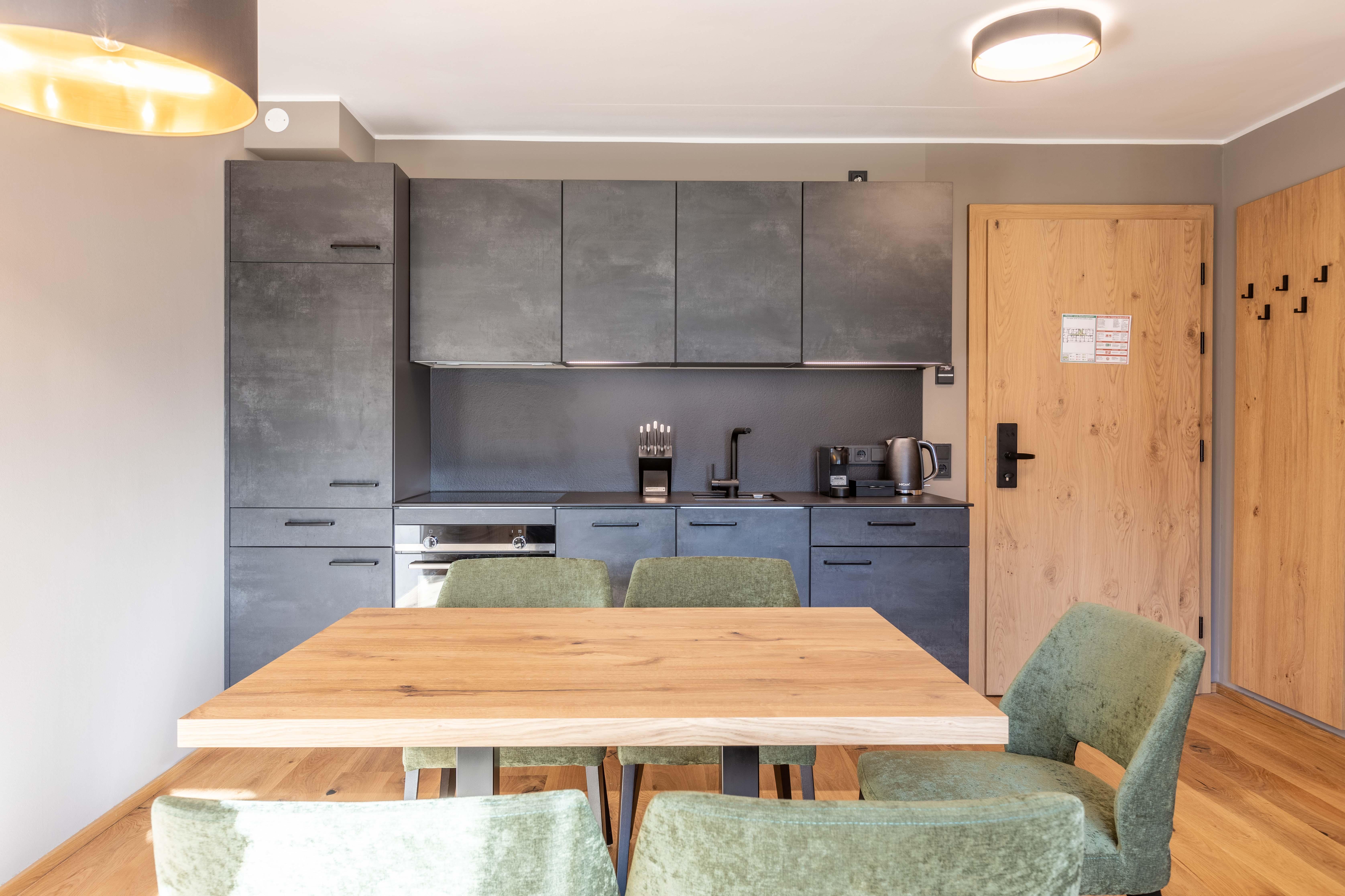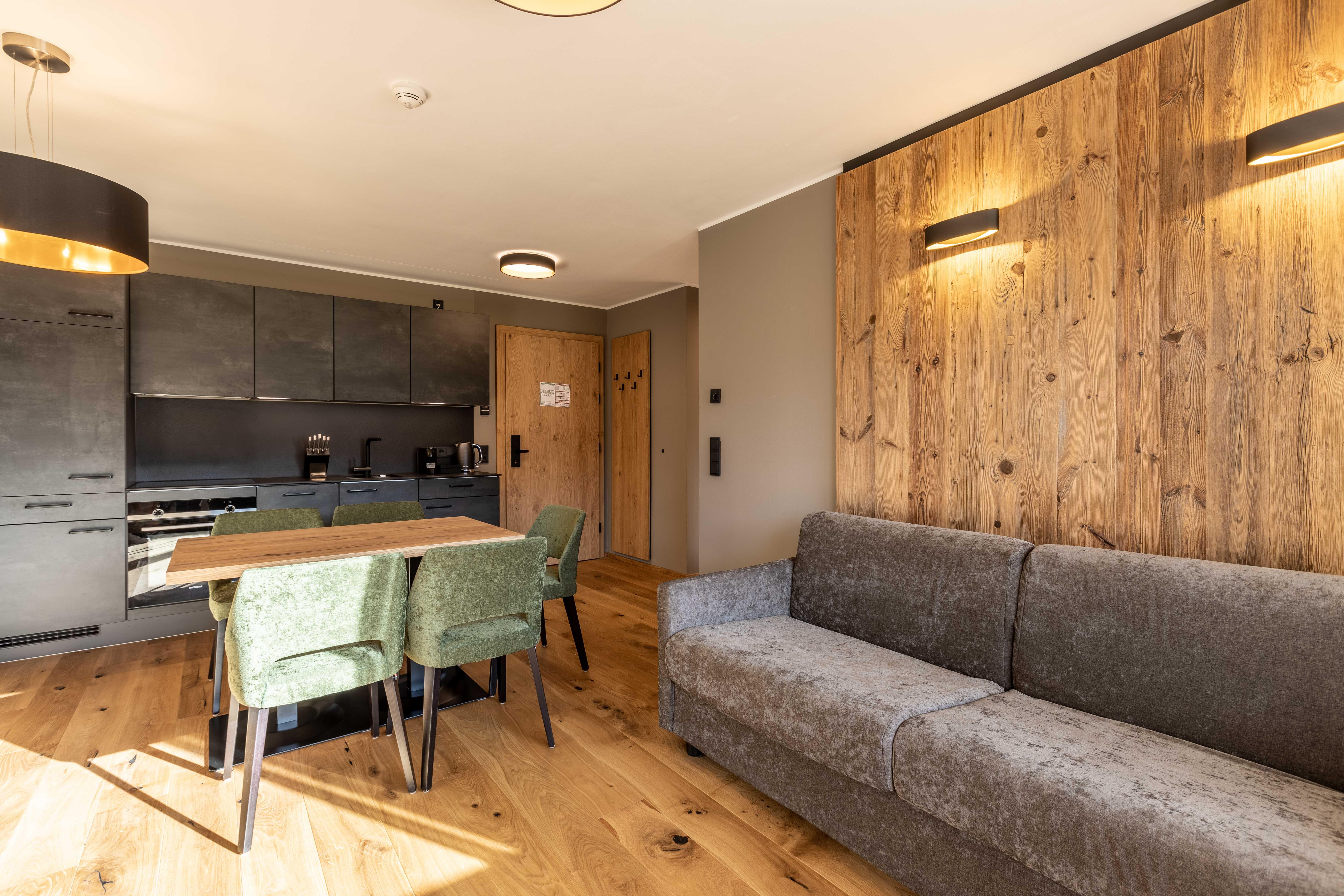 Das Apartment bietet Platz für 5 Personen und bietet Wohnküche, 2 Schlafzimmer (Master mit Balkonzugang + Boxspringbett), Bad, separates WC und Balkon. Der Eingangsbereich, mit Garderobe, führt direkt in den Wohn und Essbereich (Balkonzugang), welcher mit Esstisch, TV, Kleiderschrank und einem Ausziehsofa ausgestattet ist. Die Küche hat Küchengeräte, Kühl-Gefrierkombi sowie Nespresso Kaffeemaschine und verfügt außerdem über Küchengeschirr inklusive Töpfe und Pfannen.