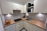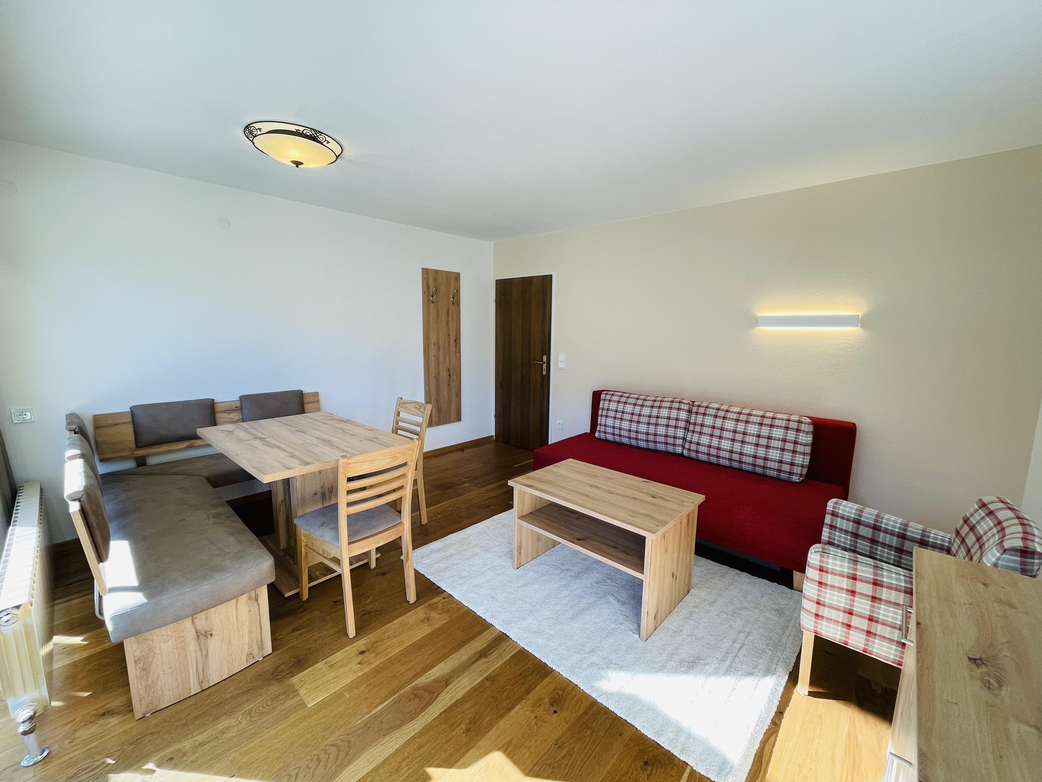 Wohnschlafzimmer mit zwei Couches und Tischchen, gepolsterter Eßecke und Bauernkomode. Dreibettzimmer mit 2 Fauteuils und Tischchen, Wandvertäfelung. Große Schiebetüre zum Liegebalkon bzw. zur Gartenterasse. Vorraum mit Schrank. Badezimmer mit Badewanne, Waschbecken, WC und Heizstrahler. Separate Küche mit 3-Platten-Herd, Kühlschrank, Geschirrspülmaschine, Mikrowellenherd, Dunstabzug, kompl. Geschirr, Kaffeemaschine. Farb-TV, Safe, Internetanschluss. Haustiere sind nicht erlaubt!