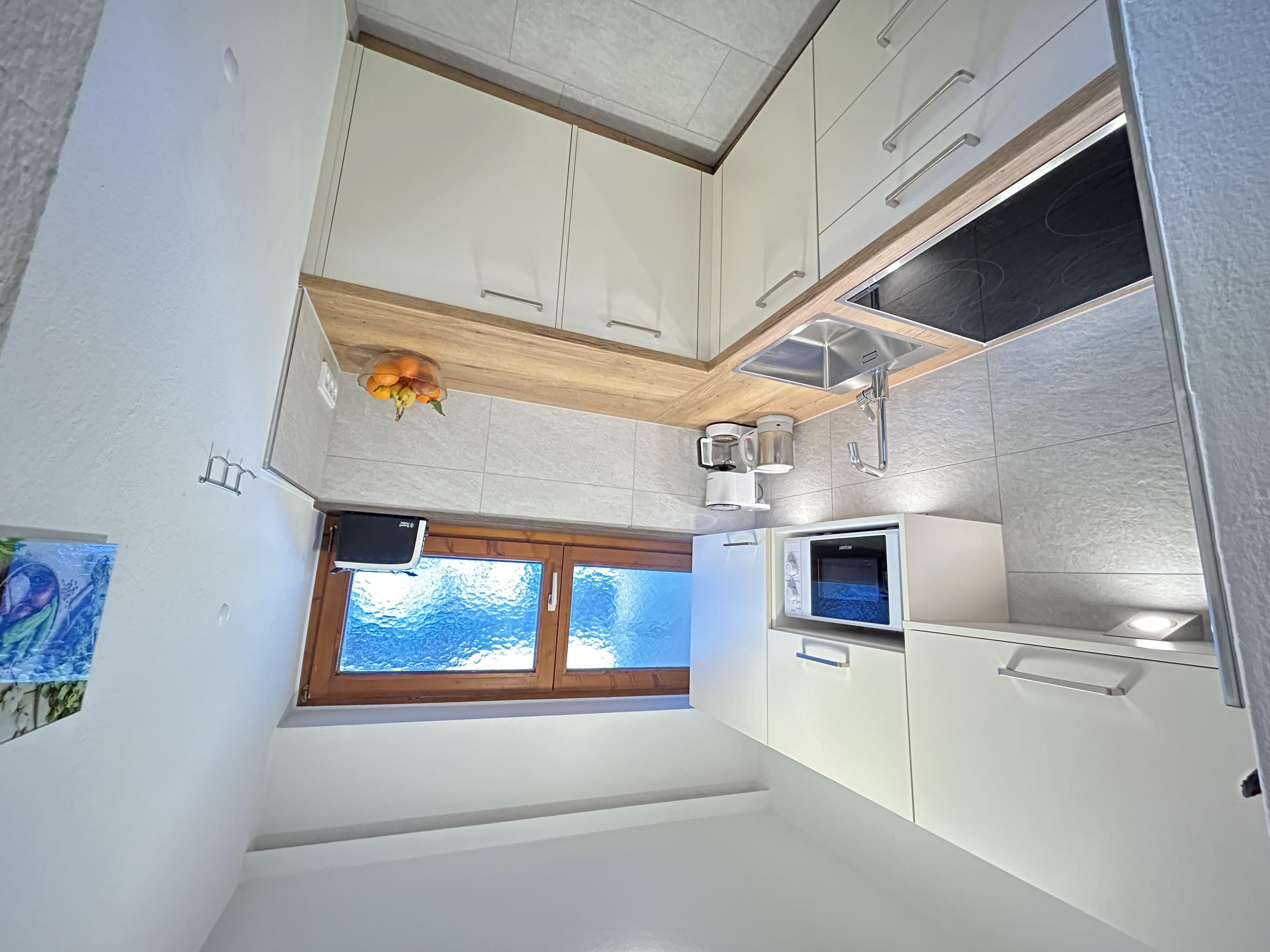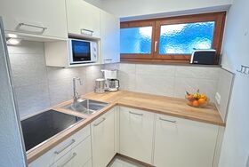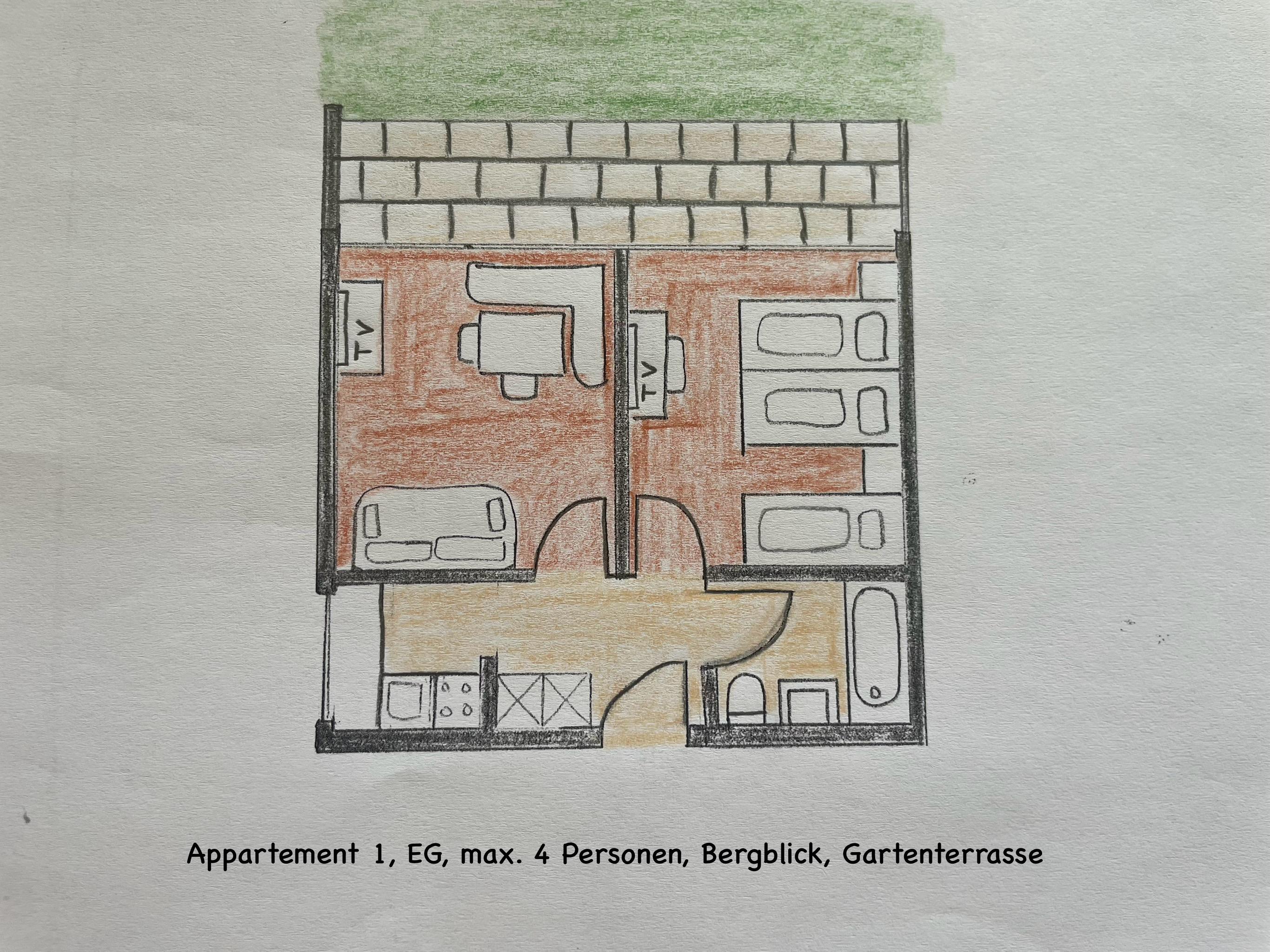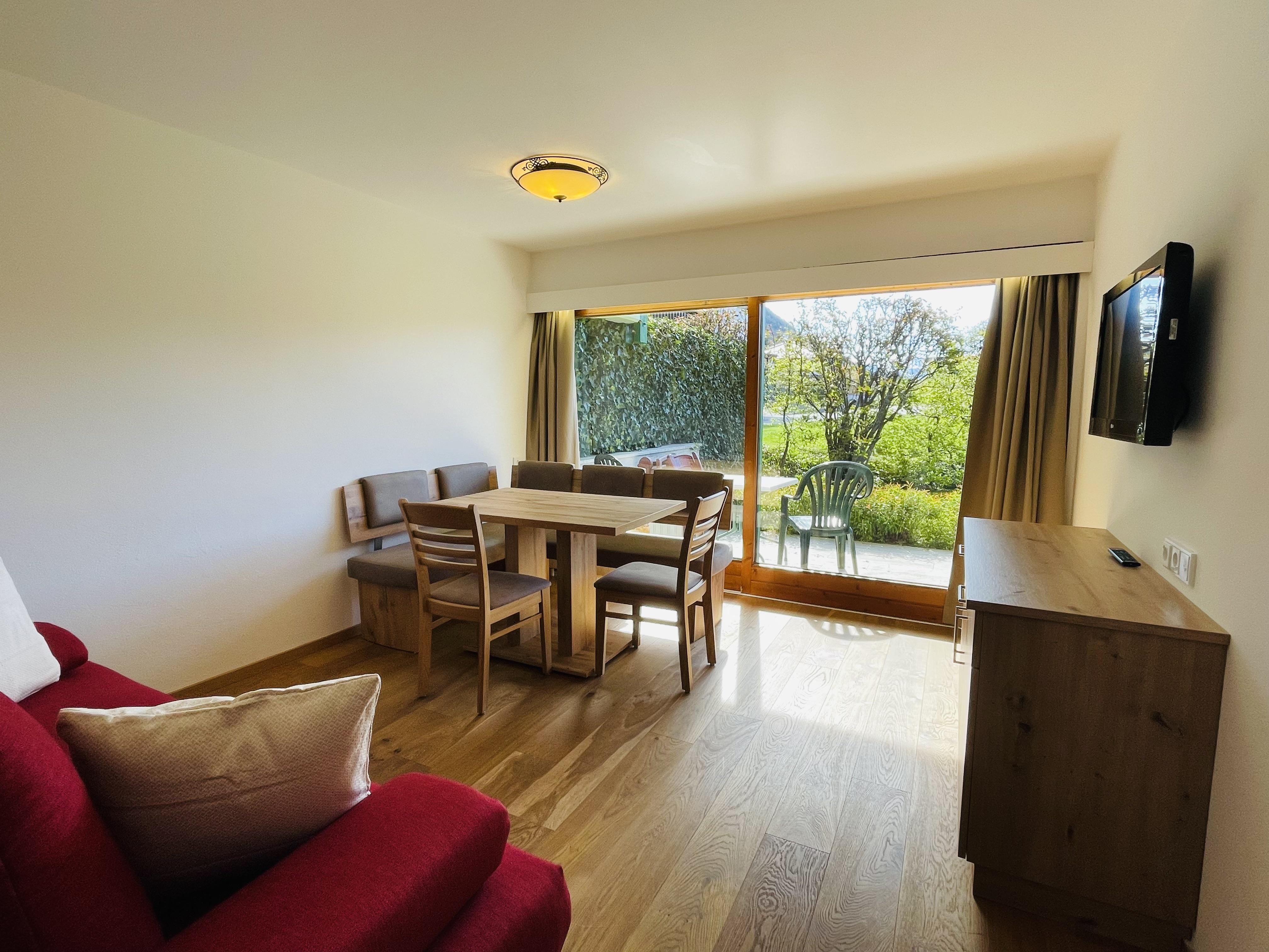 Wohnschlafzimmer mit Doppelcouch, gepolsterter Eßecke und Bauernkomode. Zweibettzimmer mit 2 Fauteuils und Tischchen, Wandvertäfelung. Große Schiebetüre zum Liegebalkon bzw. zur Gartenterasse. Vorraum mit Schrank. Badezimmer mit Badewanne, Waschbecken, WC und Heizstrahler. Seperate Küche mit 3-Platten-Herd, Dunstabzug, kompl. Geschirr, Kühlschrank, Geschirrspülmaschine, Mikrowellenherd, Kaffeemaschine. Farb-TV, Safe, Internetanschluss.