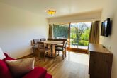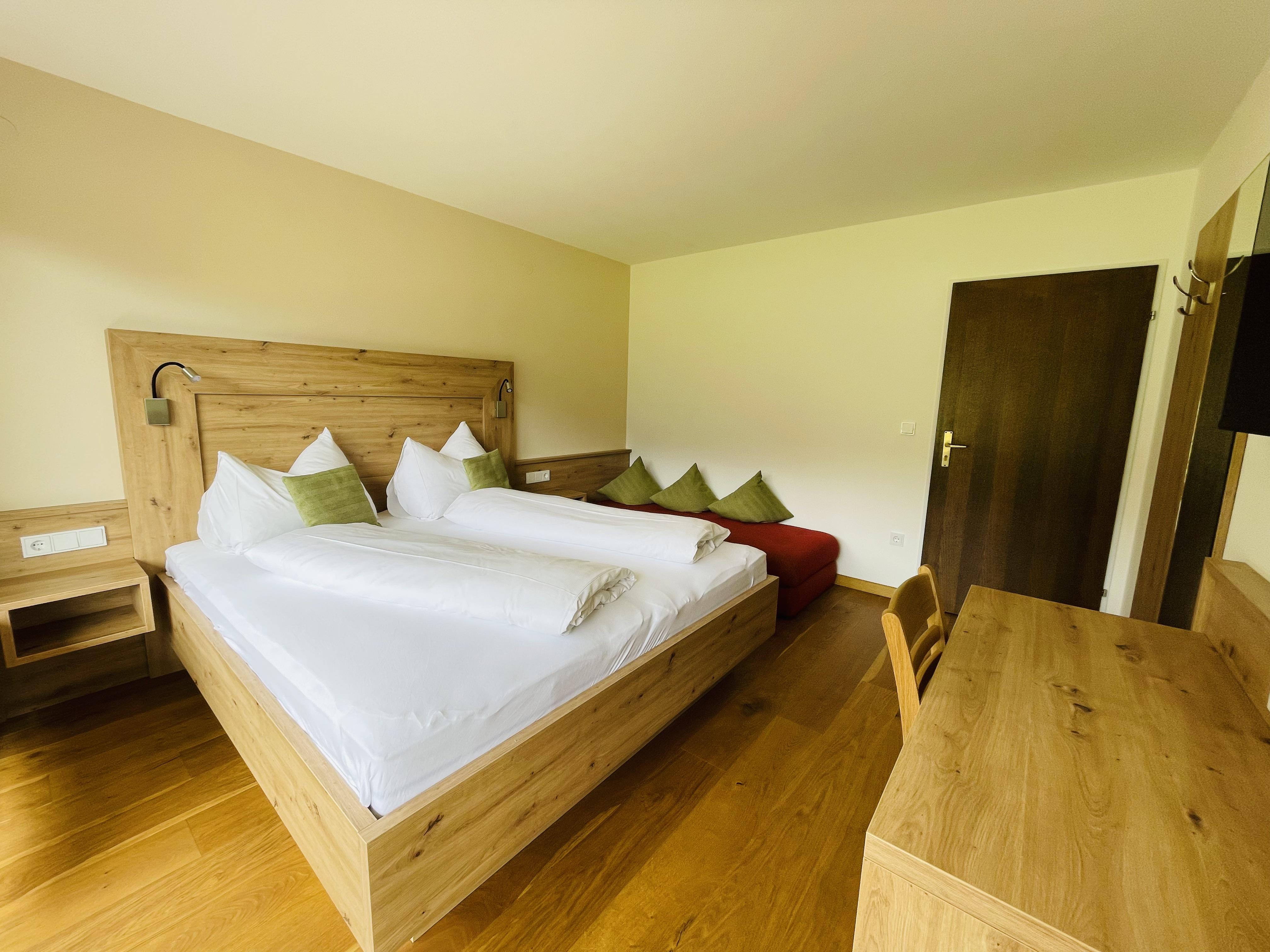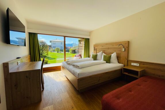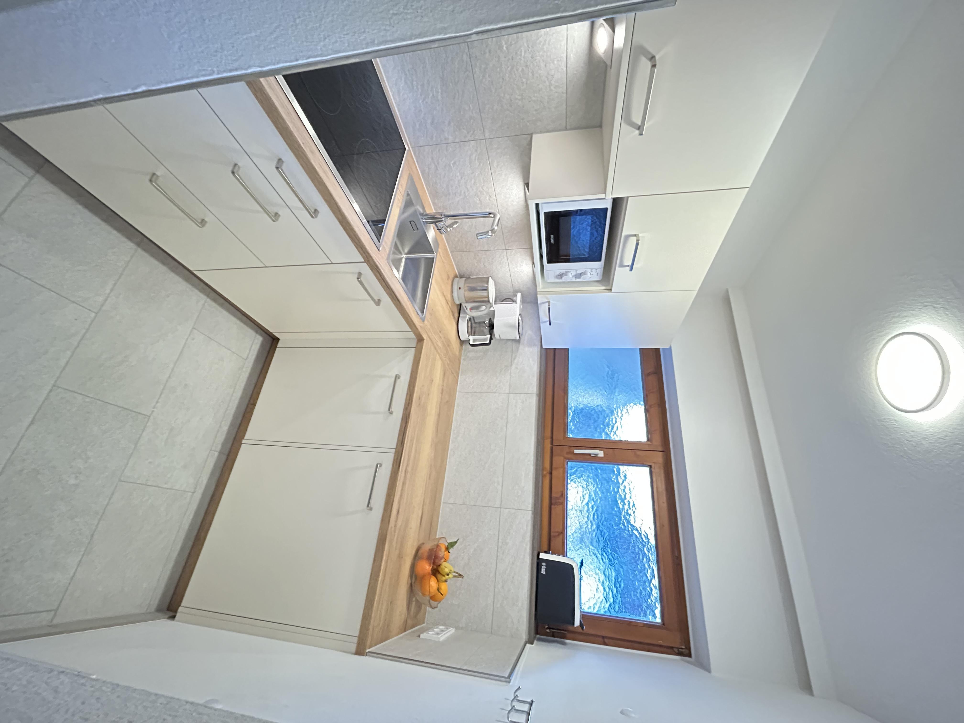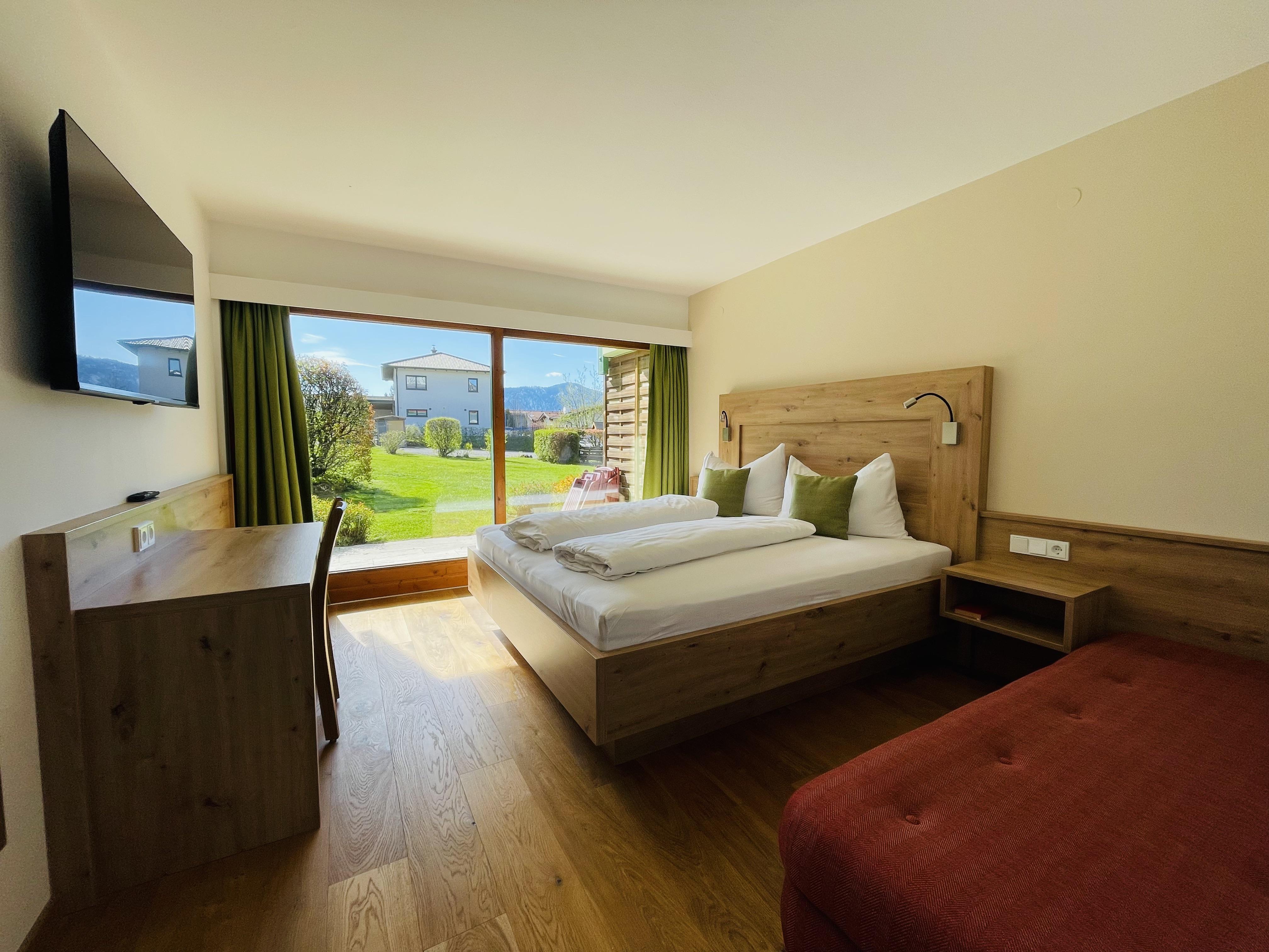 Wohnschlafzimmer mit Doppelcouch, gepolsterter Eßecke und Bauernkomode. Zweibettzimmer mit 2 Fauteuils und Tischchen, Wandvertäfelung. Große Schiebetüre zum Liegebalkon bzw. zur Gartenterasse. Vorraum mit Schrank. Badezimmer mit Badewanne, Waschbecken, WC und Heizstrahler. Seperate Küche mit 3-Platten-Herd, Dunstabzug, kompl. Geschirr, Kühlschrank, Geschirrspülmaschine, Mikrowellenherd, Kaffeemaschine. Farb-TV, Safe, Internetanschluss.