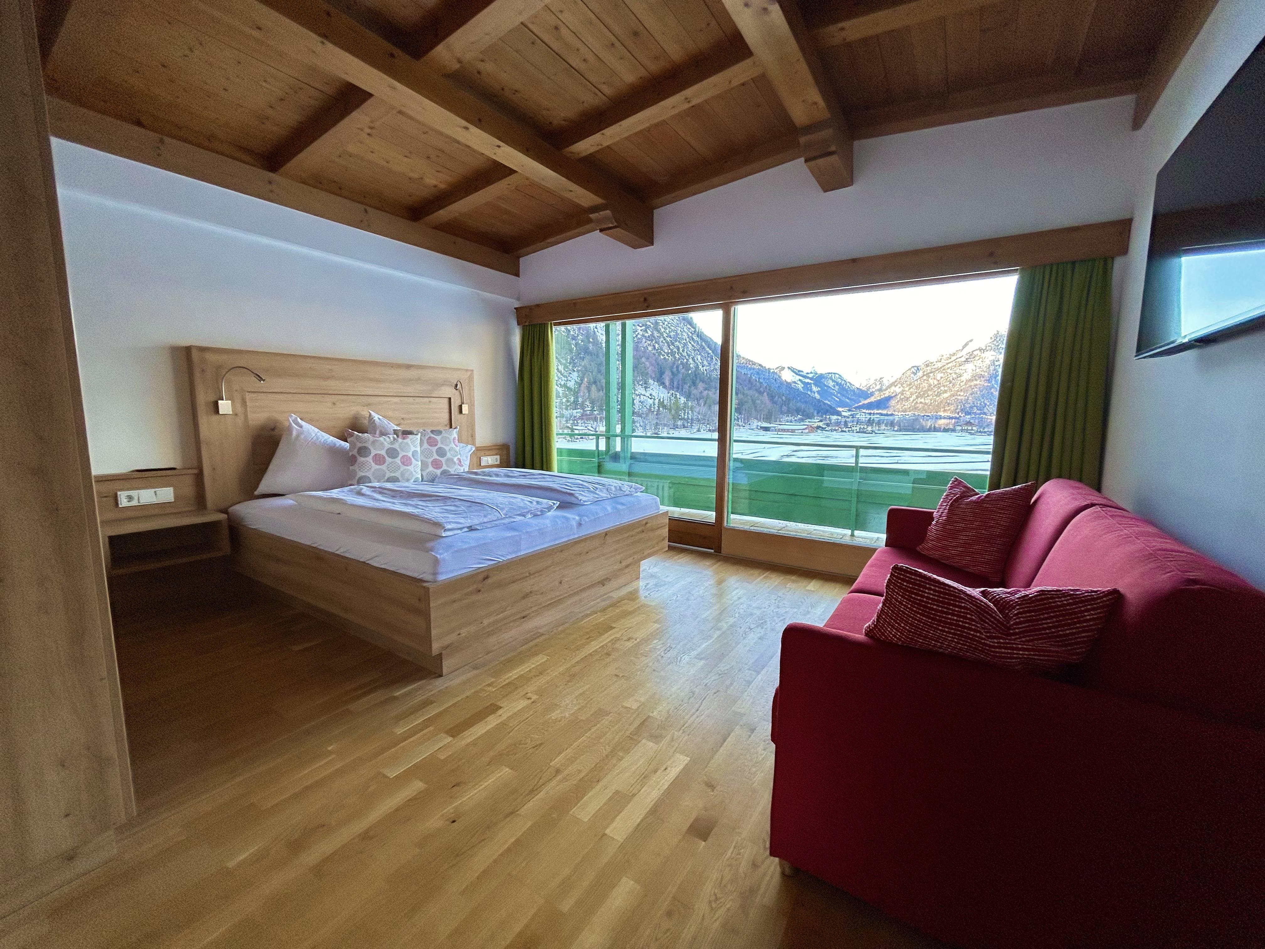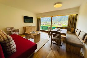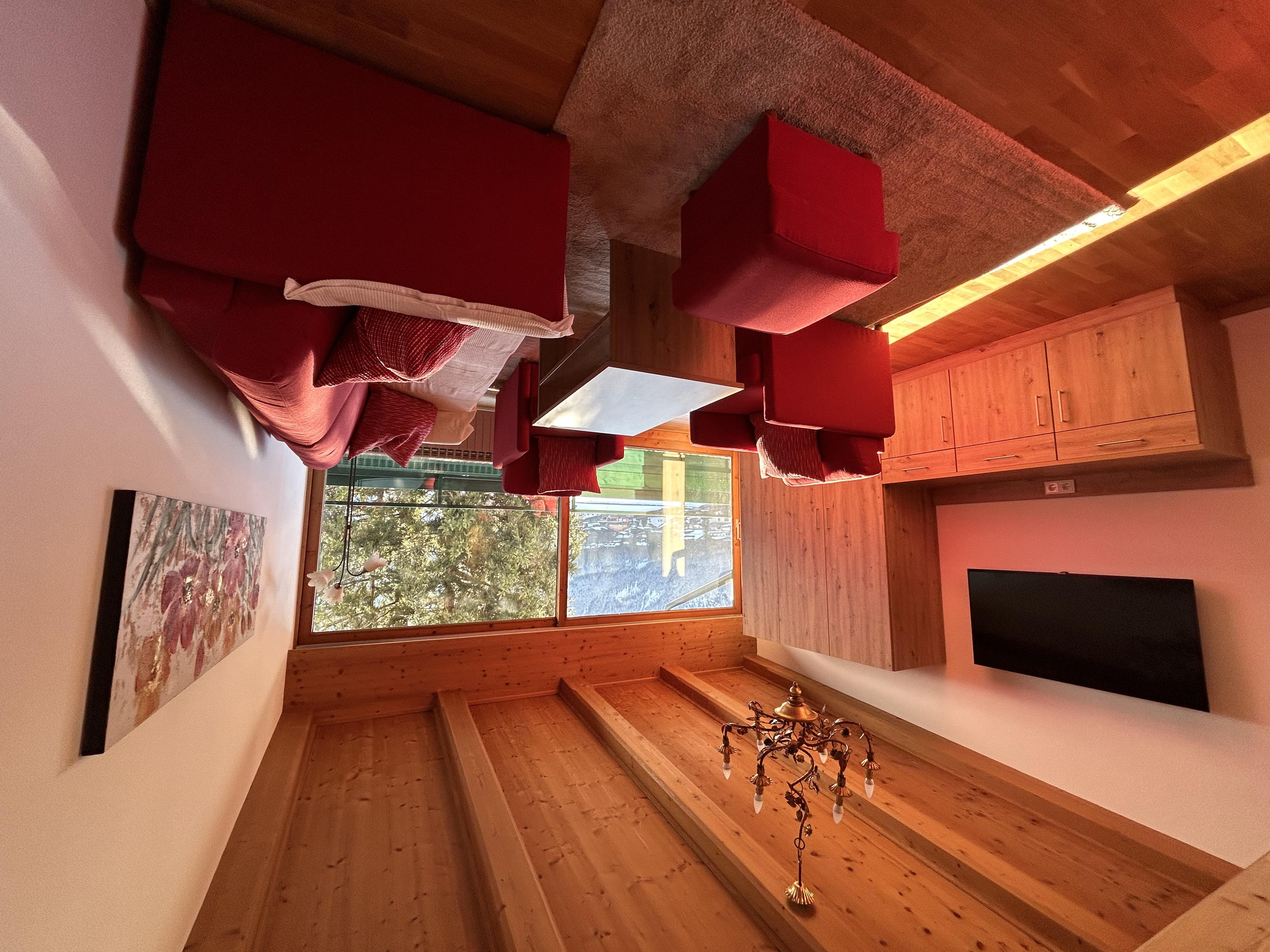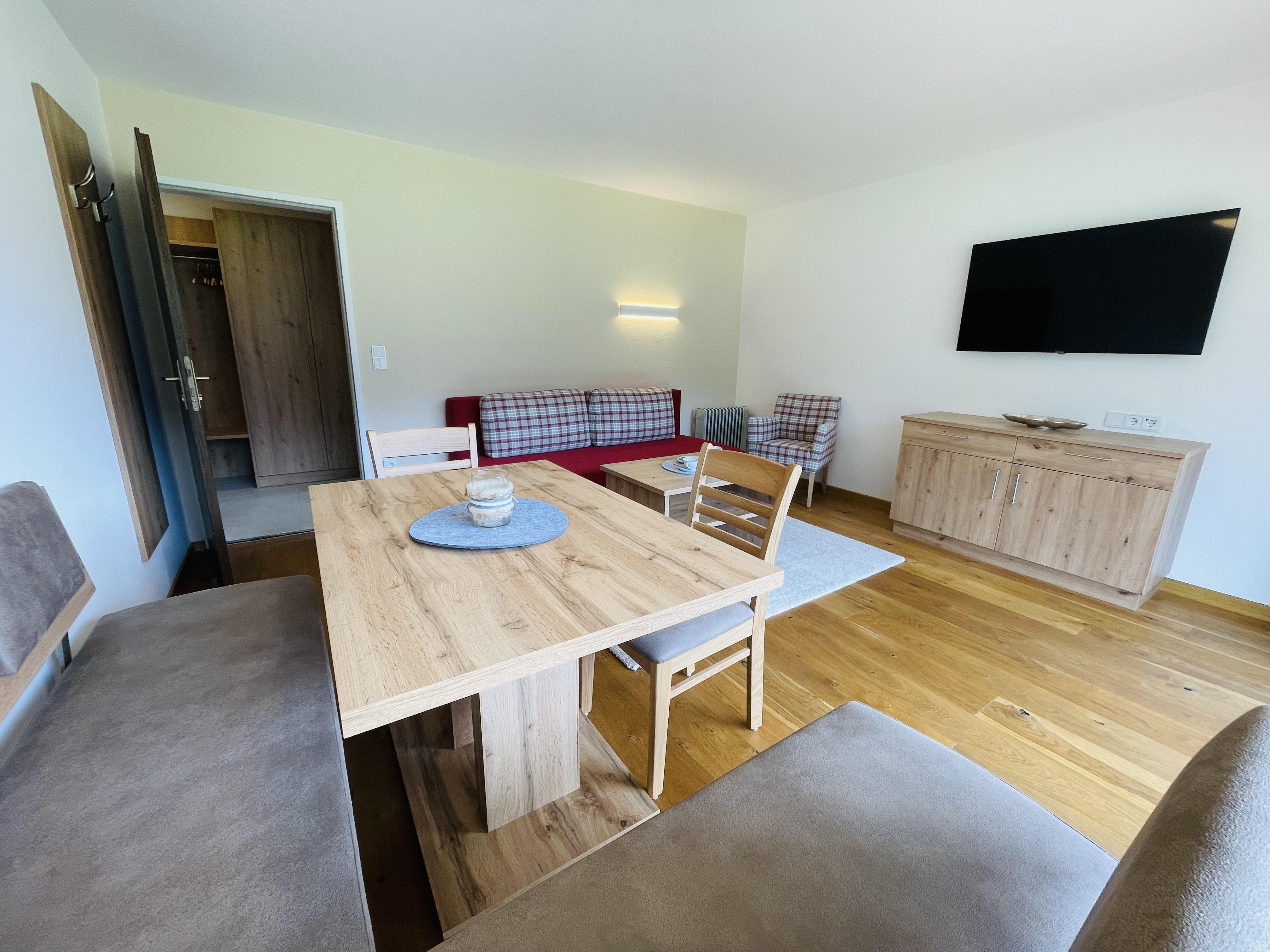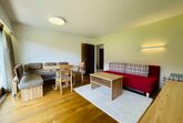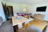 Wohnschlafzimmer mit zwei Couches und Tischchen, gepolsterter Eßecke und Bauernkomode. Dreibettzimmer mit 2 Fauteuils und Tischchen, Wandvertäfelung. Große Schiebetüre zum Liegebalkon bzw. zur Gartenterasse. Vorraum mit Schrank. Badezimmer mit Badewanne, Waschbecken, WC und Heizstrahler. Separate Küche mit 3-Platten-Herd, Kühlschrank, Geschirrspülmaschine, Mikrowellenherd, Dunstabzug, kompl. Geschirr, Kaffeemaschine. Farb-TV, Safe, Internetanschluss. Haustiere sind nicht erlaubt!