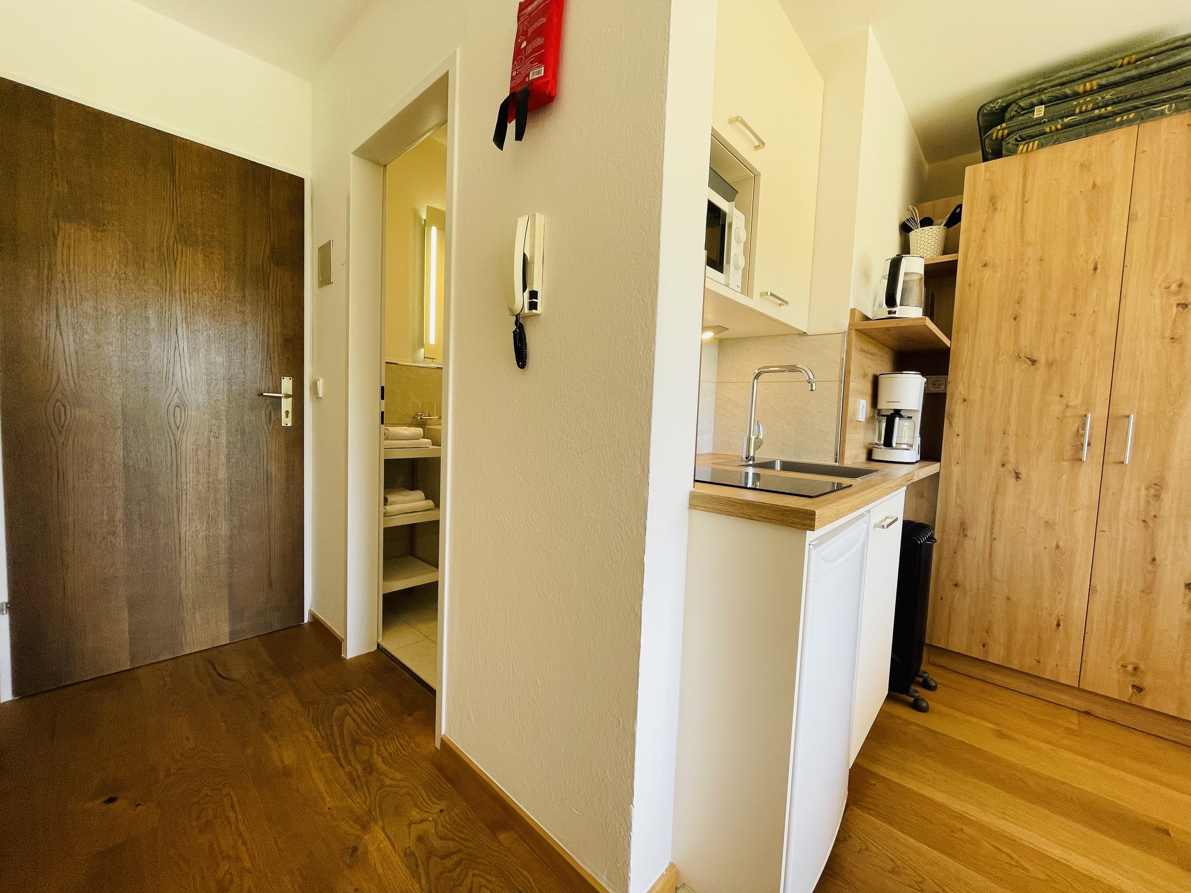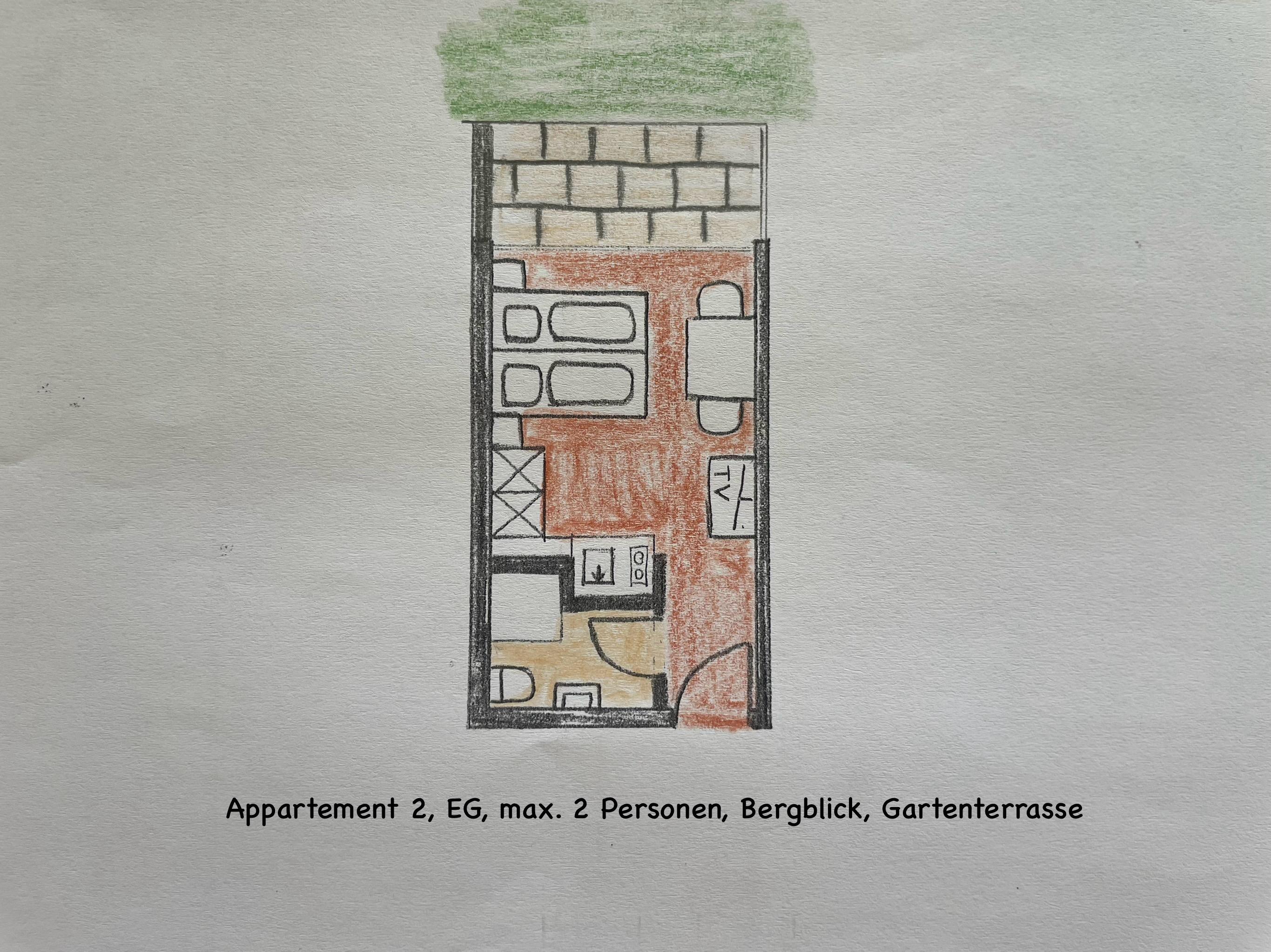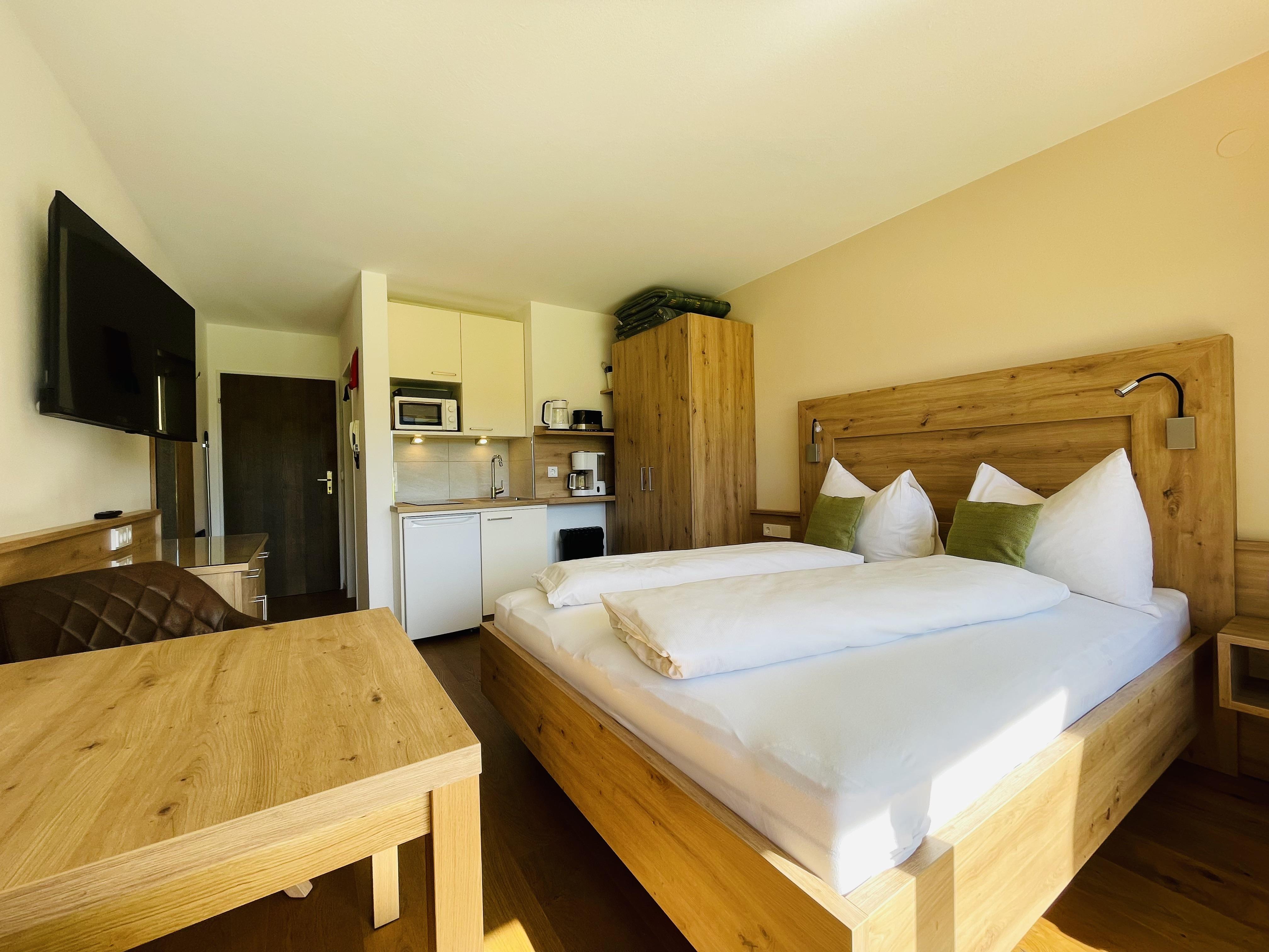 Wohnschlafzimmer mit zwei Einzelbetten, zwei Fauteuils mit Tischchen, Schrank und Bauernkomode, große Schiebetür (3,5 m) zur Gartenterasse, Kochnische mit Kühlschrank, 2-Platten-Herd, Dunstabzug, Kaffeemaschine; Geschirr ist komplett vorhanden. Badezimmer: Dusche, Waschbecken und WC, Heizstrahler, Farb-TV, Safe, Internetanschluss. Haustiere sind nicht erlaubt!