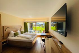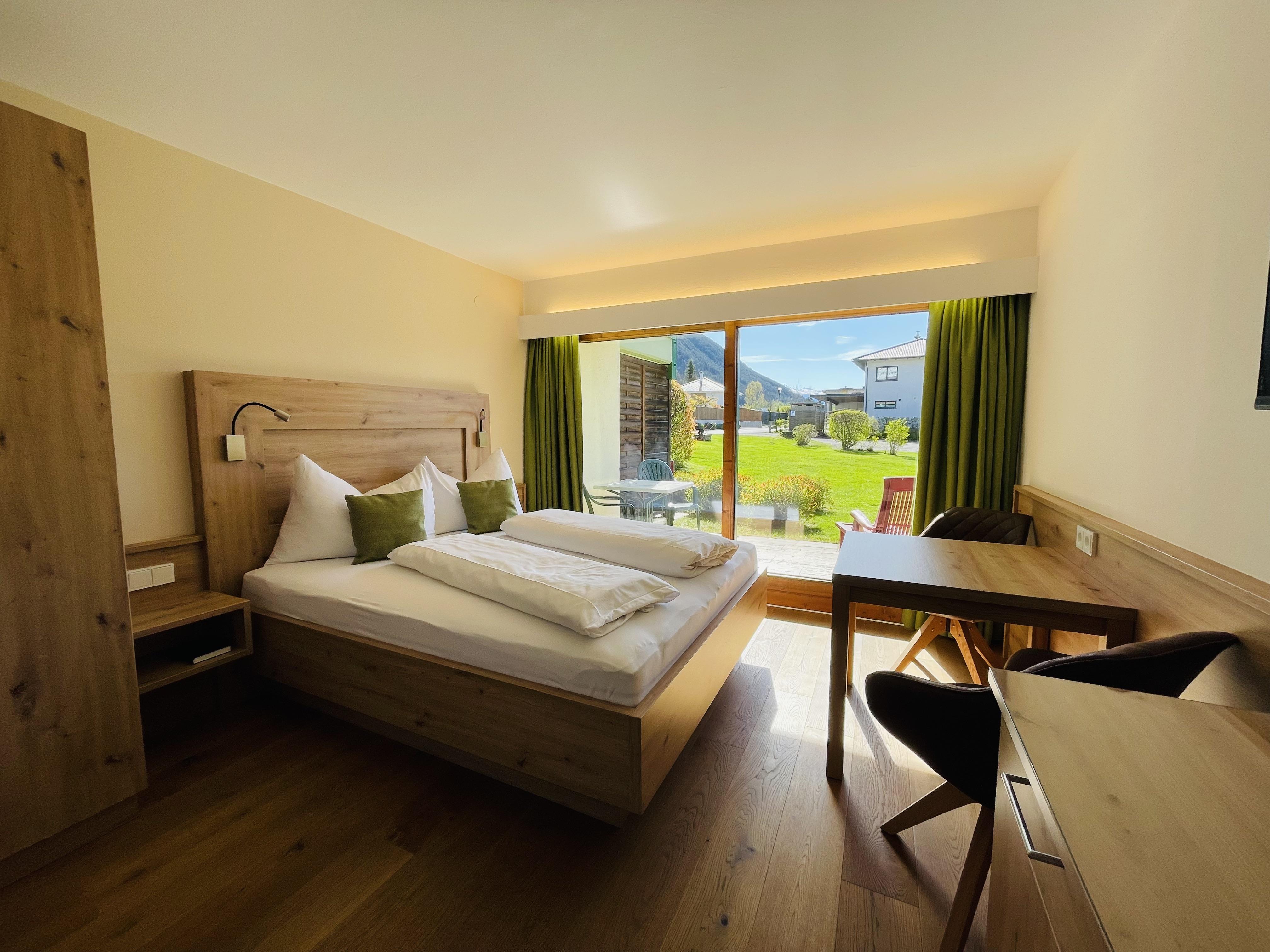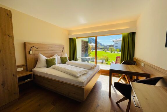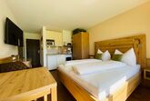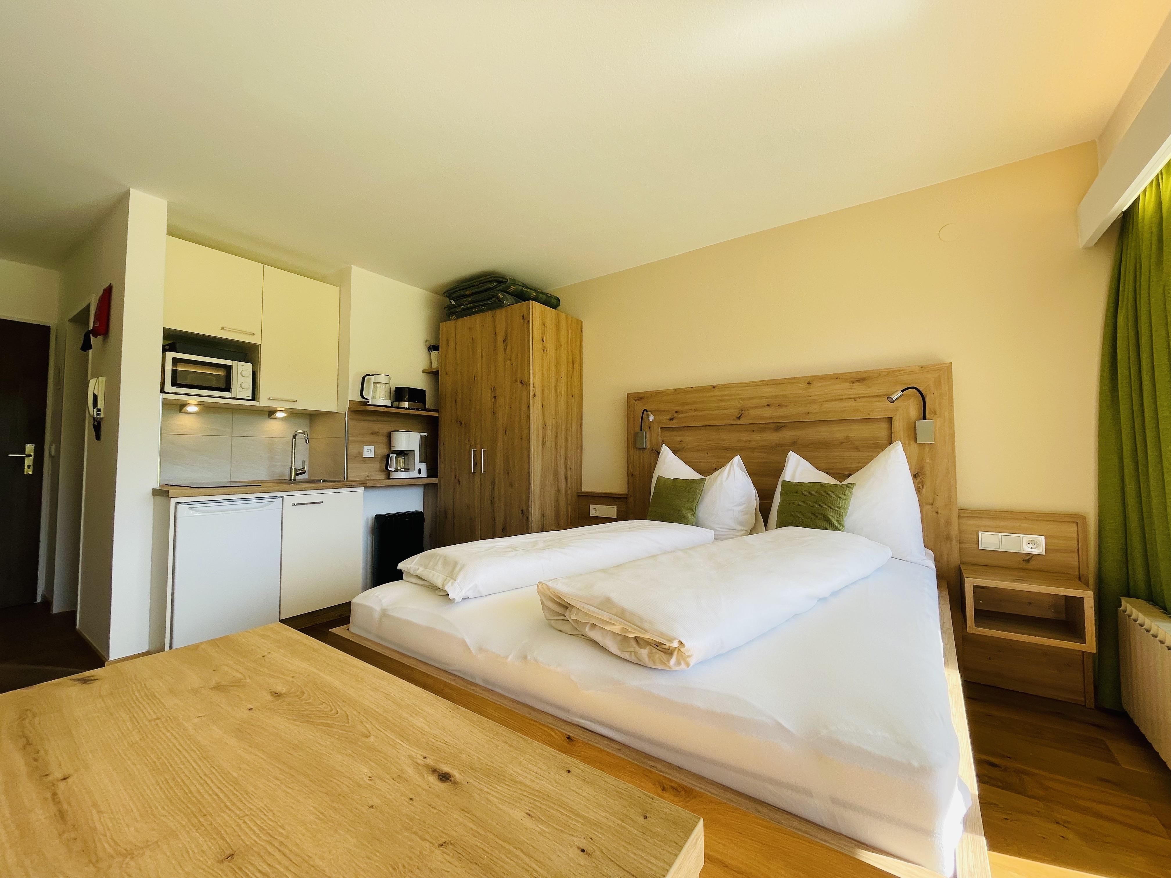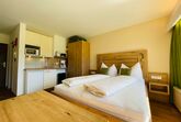 Wohnschlafzimmer mit zwei Einzelbetten, zwei Fauteuils mit Tischchen, Schrank und Bauernkomode, große Schiebetür (3,5 m) zur Gartenterasse, Kochnische mit Kühlschrank, 2-Platten-Herd, Dunstabzug, Kaffeemaschine; Geschirr ist komplett vorhanden. Badezimmer: Dusche, Waschbecken und WC, Heizstrahler, Farb-TV, Safe, Internetanschluss. Haustiere sind nicht erlaubt!
