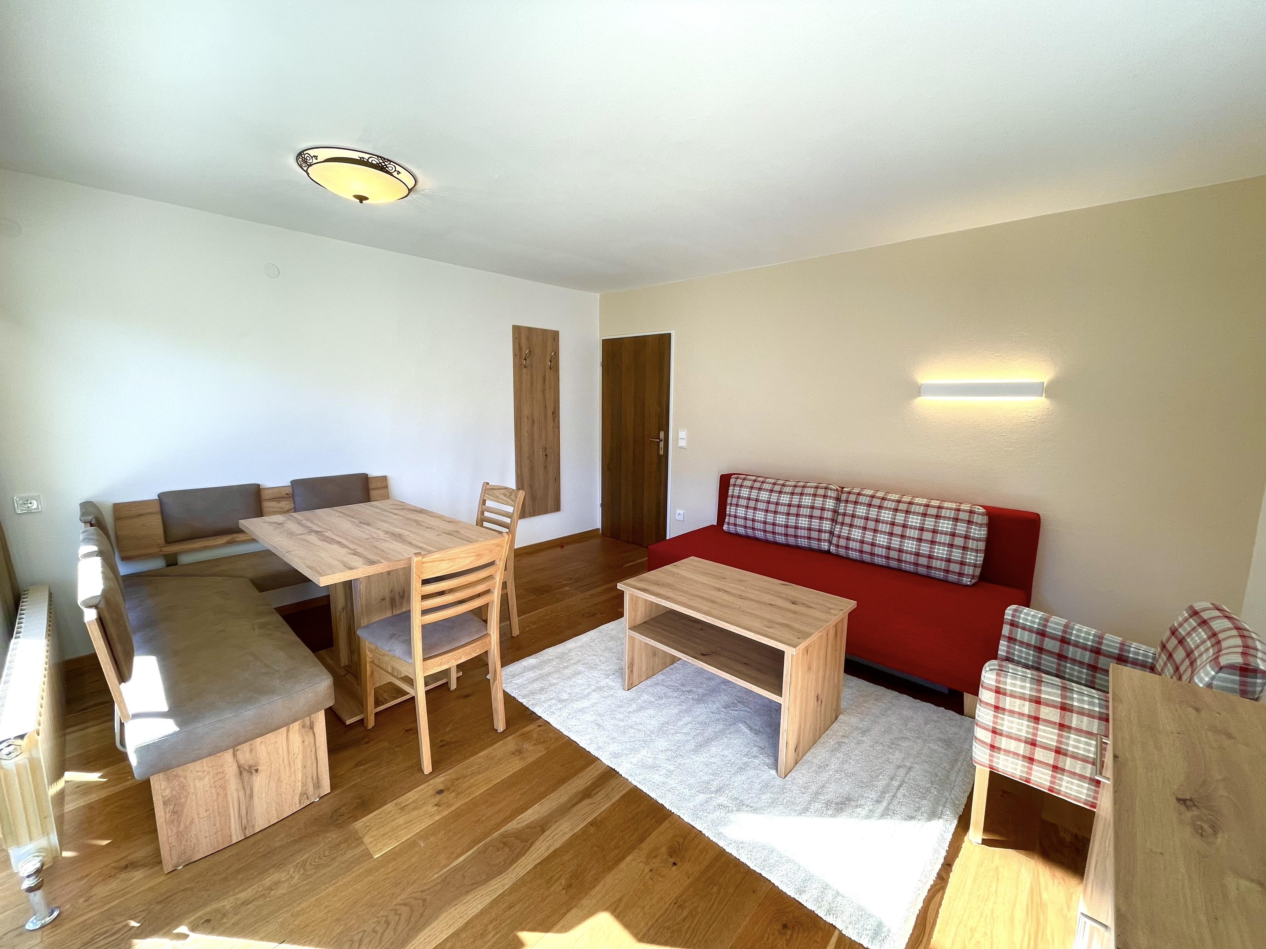 Wohnschlafzimmer mit zwei Couches und Tischchen, gepolsterter Eßecke und Bauernkomode. Dreibettzimmer mit 2 Fauteuils und Tischchen, Wandvertäfelung. Große Schiebetüre zum Liegebalkon bzw. zur Gartenterasse. Vorraum mit Schrank. Badezimmer mit Badewanne, Waschbecken, WC und Heizstrahler. Separate Küche mit 3-Platten-Herd, Kühlschrank, Geschirrspülmaschine, Mikrowellenherd, Dunstabzug, kompl. Geschirr, Kaffeemaschine. Farb-TV, Safe, Internetanschluss. Haustiere sind nicht erlaubt!