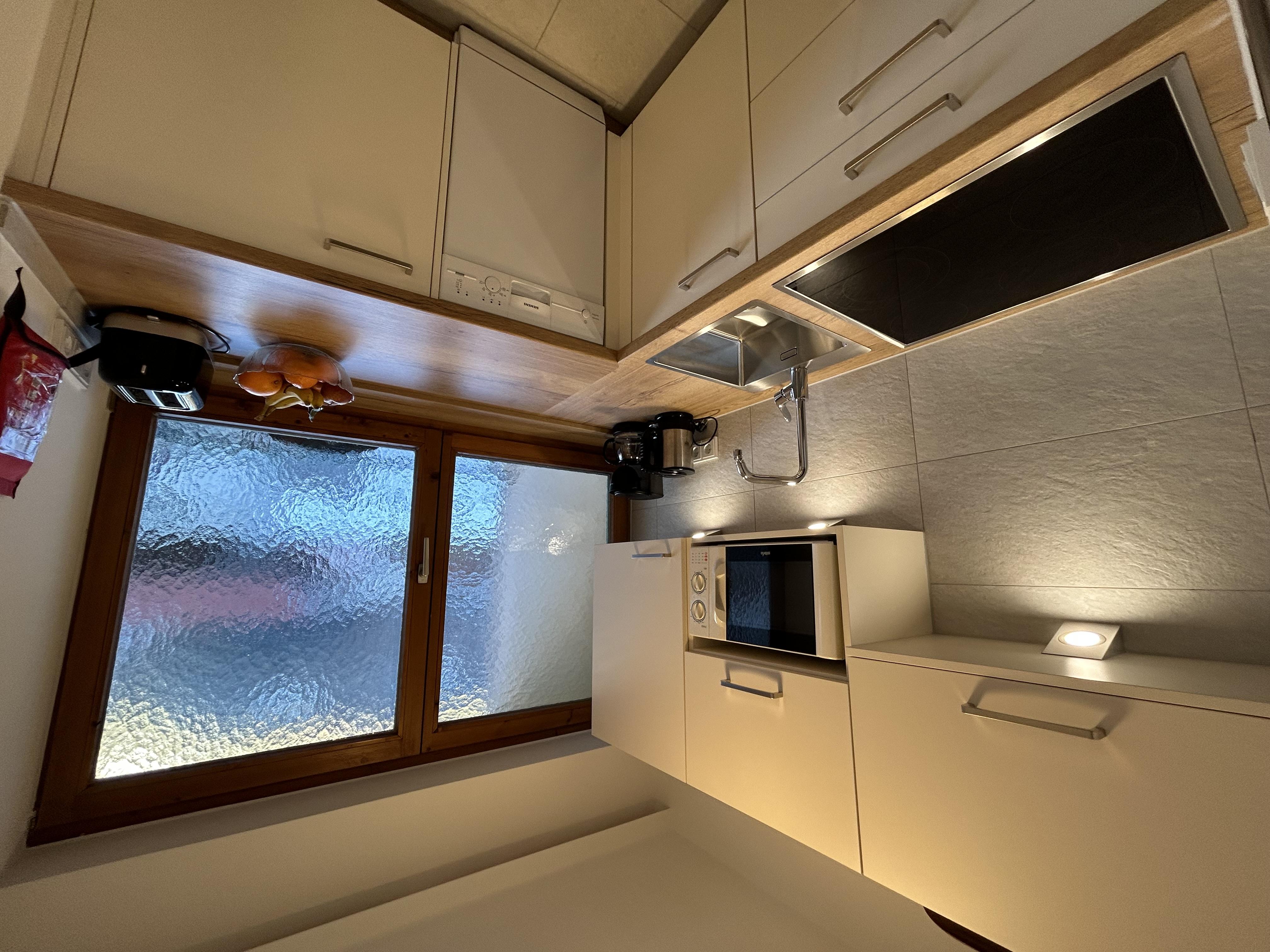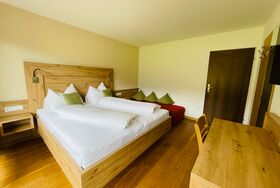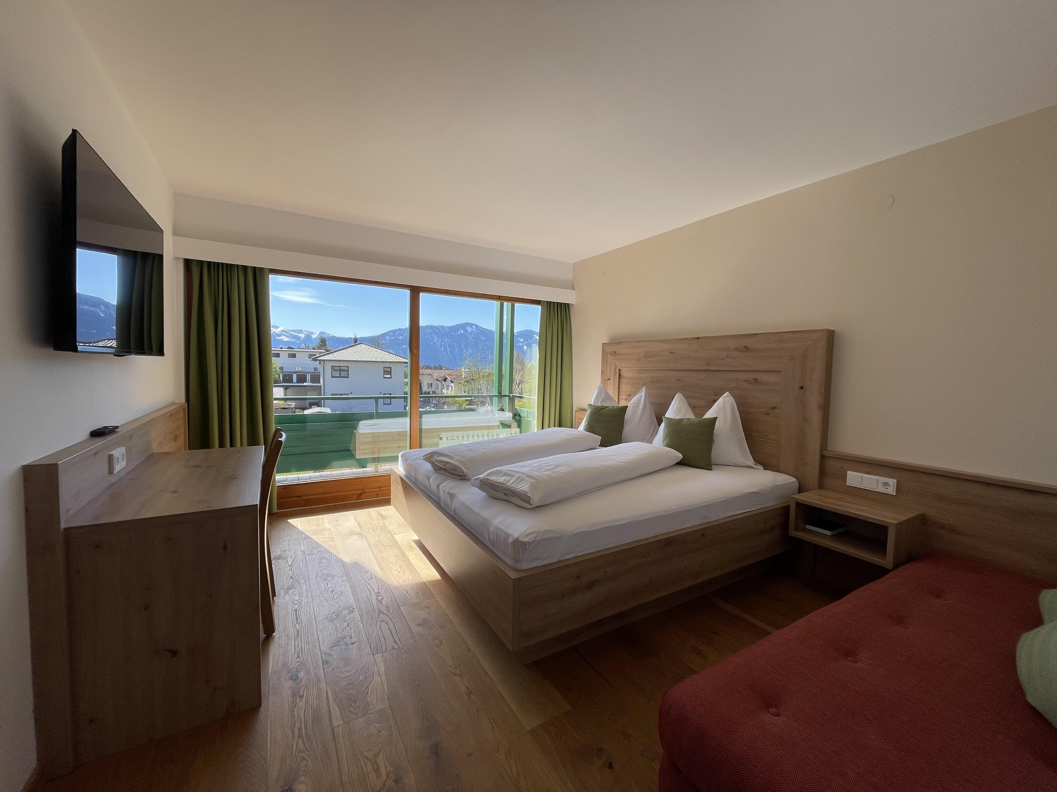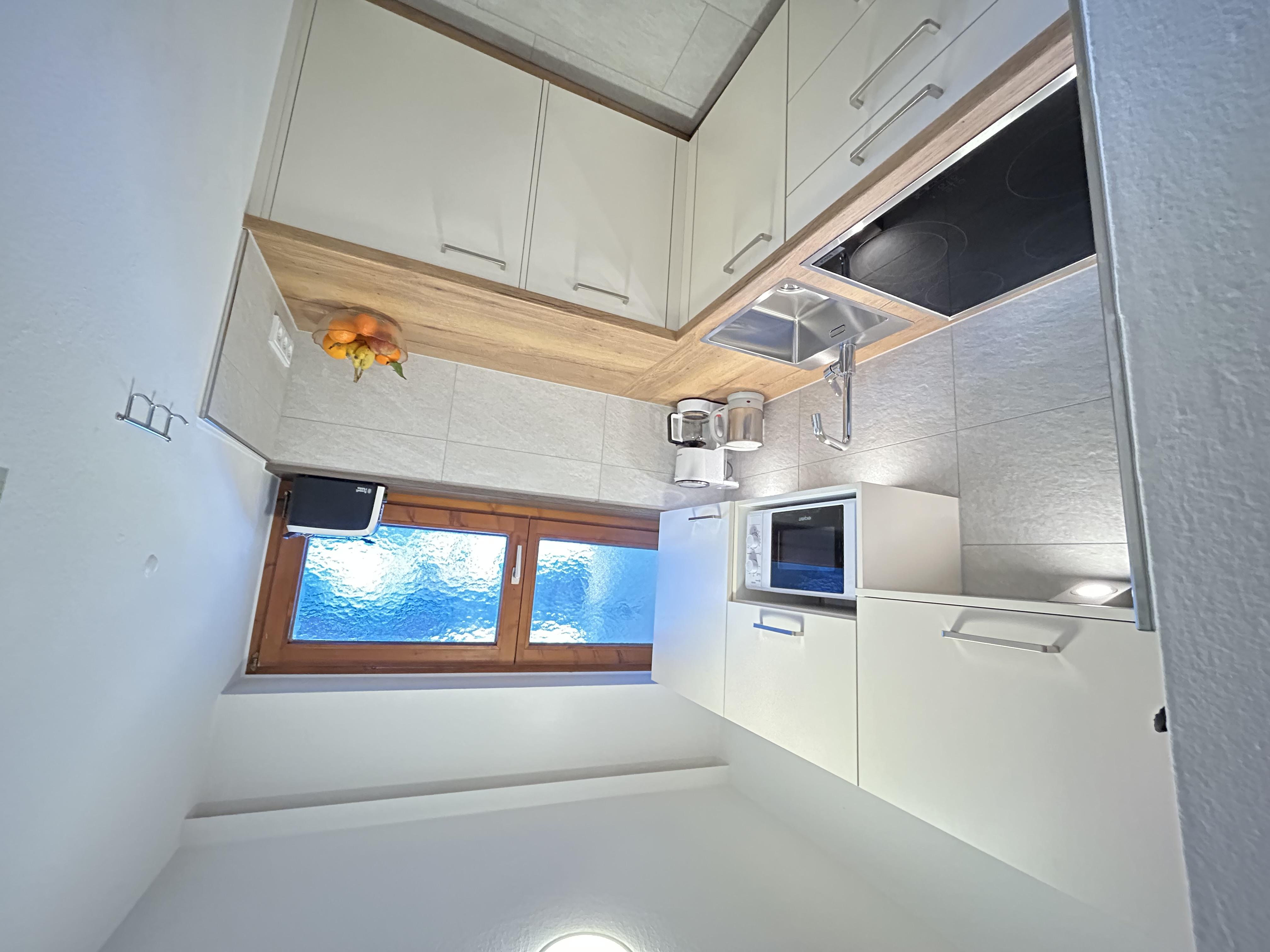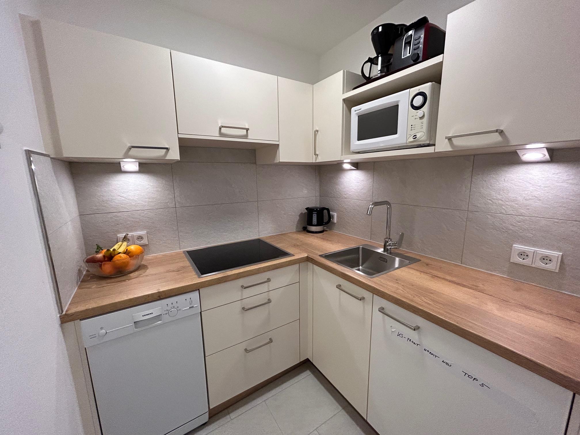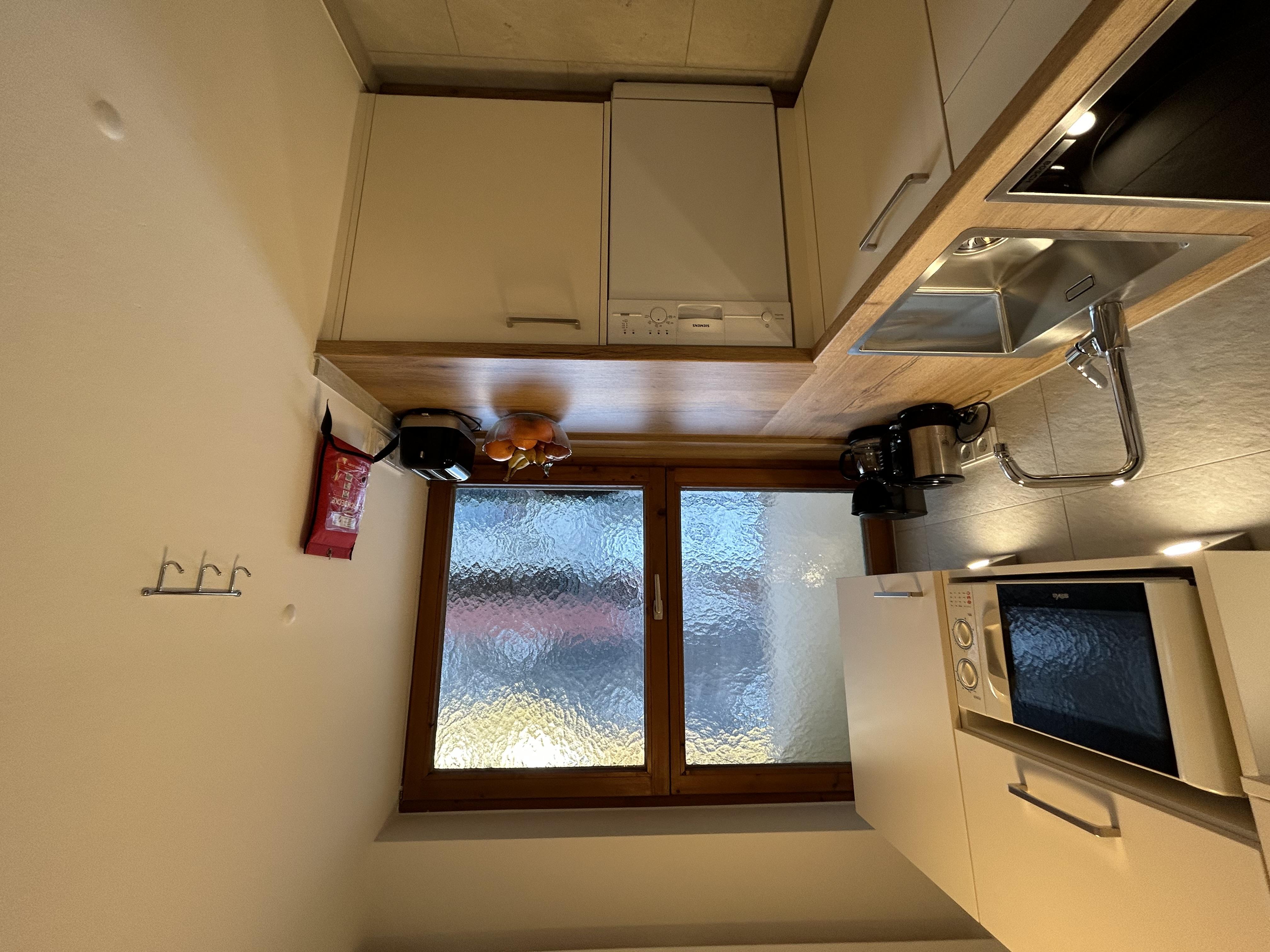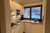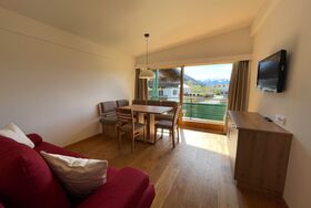Wohnschlafzimmer mit Doppelcouch, gepolsterter Eßecke und Bauernkomode. Zweibettzimmer mit 2 Fauteuils und Tischchen, Wandvertäfelung. Große Schiebetüre zum Liegebalkon bzw. zur Gartenterasse. Vorraum mit Schrank. Badezimmer mit Badewanne, Waschbecken, WC und Heizstrahler. Seperate Küche mit 3-Platten-Herd, Dunstabzug, kompl. Geschirr, Kühlschrank, Geschirrspülmaschine, Mikrowellenherd, Kaffeemaschine. Farb-TV, Safe, Internetanschluss.