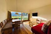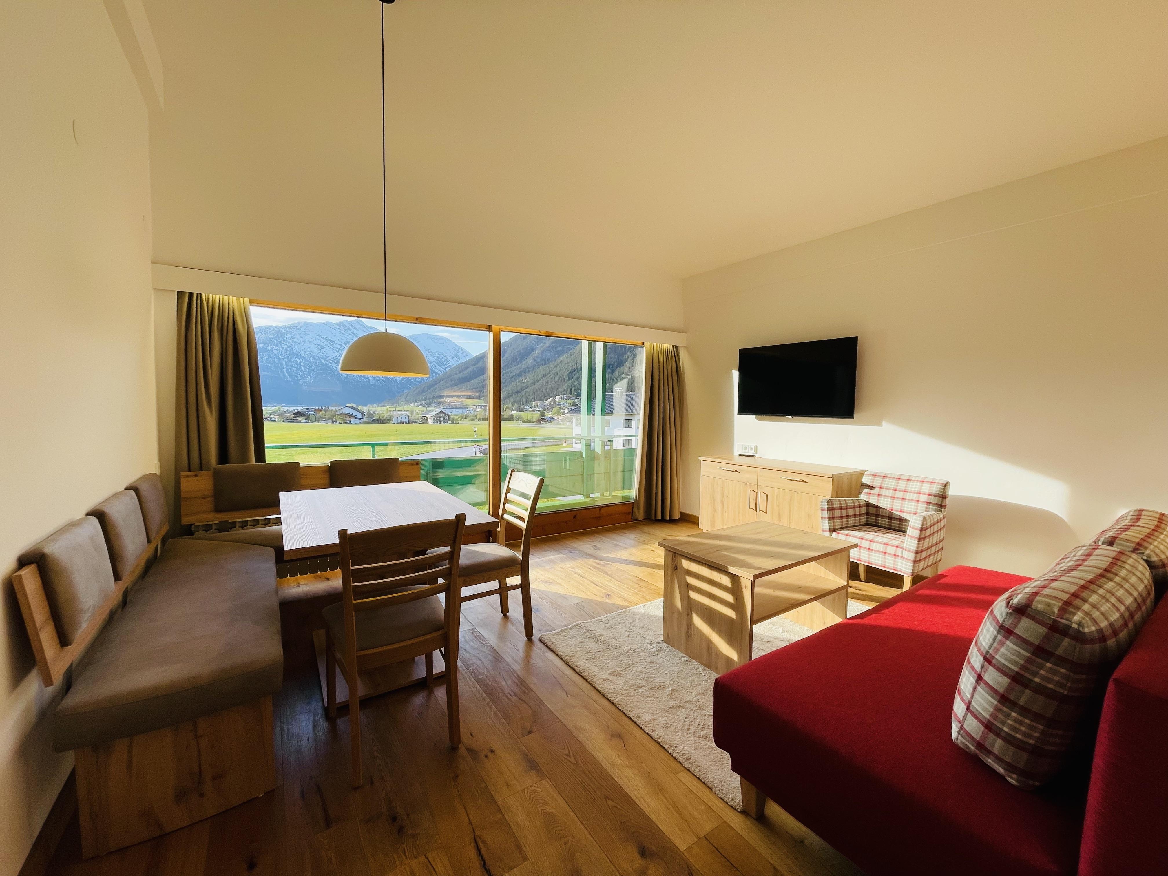 Wohnschlafzimmer mit zwei Couches und Tischchen, gepolsterter Eßecke und Bauernkomode. Dreibettzimmer mit 2 Fauteuils und Tischchen, Wandvertäfelung. Große Schiebetüre zum Liegebalkon bzw. zur Gartenterasse. Vorraum mit Schrank. Badezimmer mit Badewanne, Waschbecken, WC und Heizstrahler. Separate Küche mit 3-Platten-Herd, Kühlschrank, Geschirrspülmaschine, Mikrowellenherd, Dunstabzug, kompl. Geschirr, Kaffeemaschine. Farb-TV, Safe, Internetanschluss. Haustiere sind nicht erlaubt!