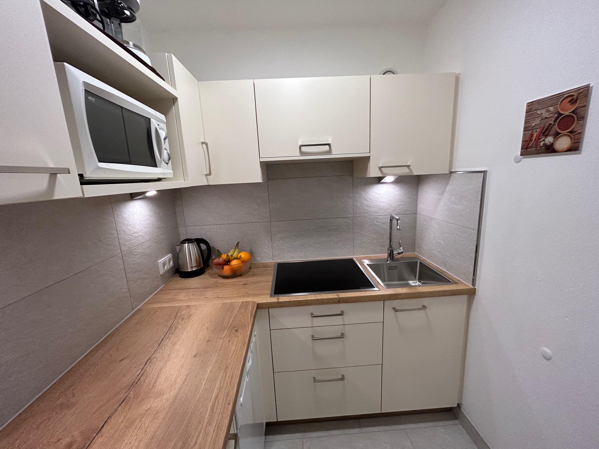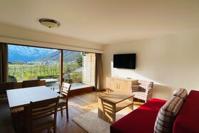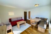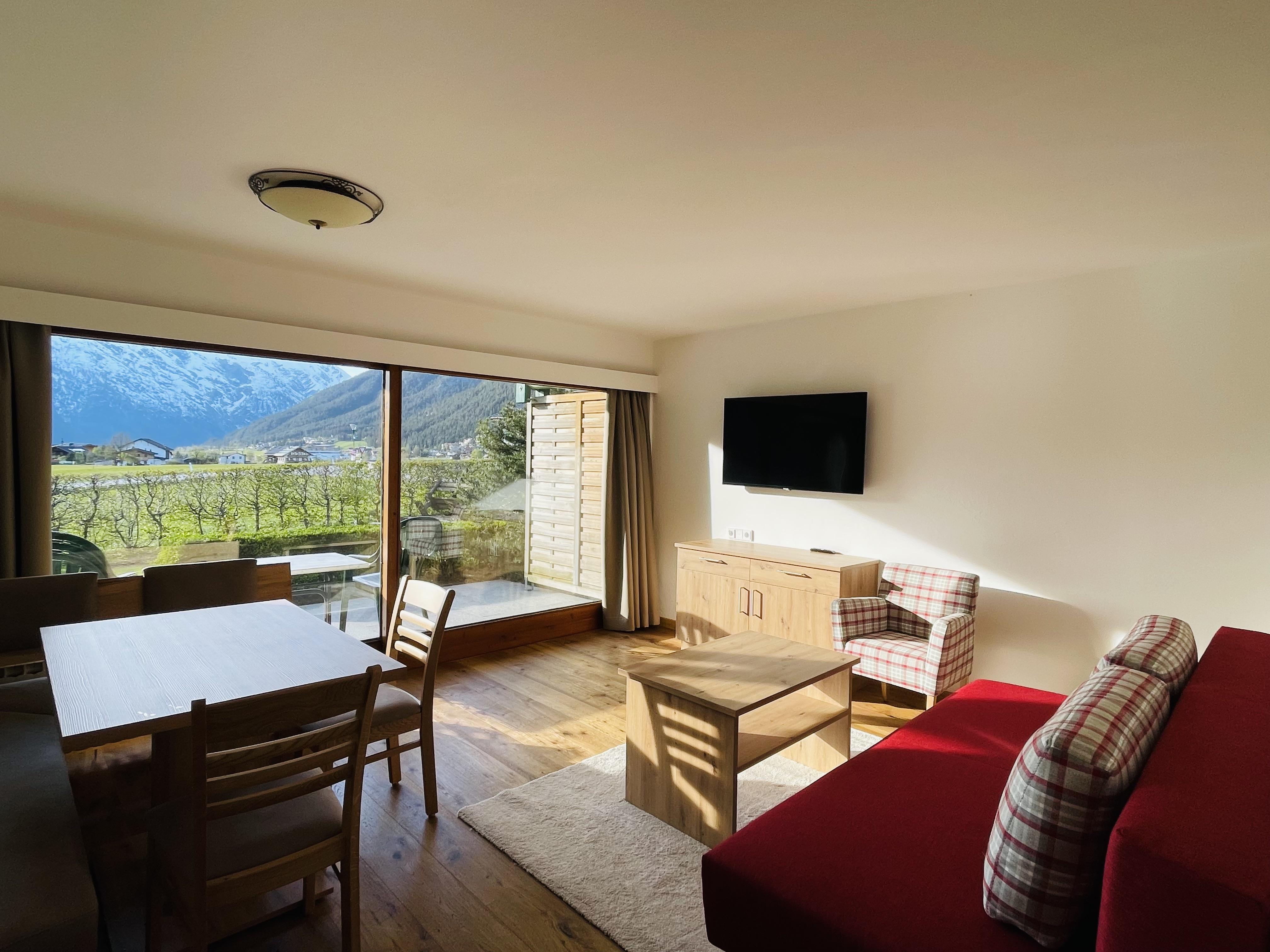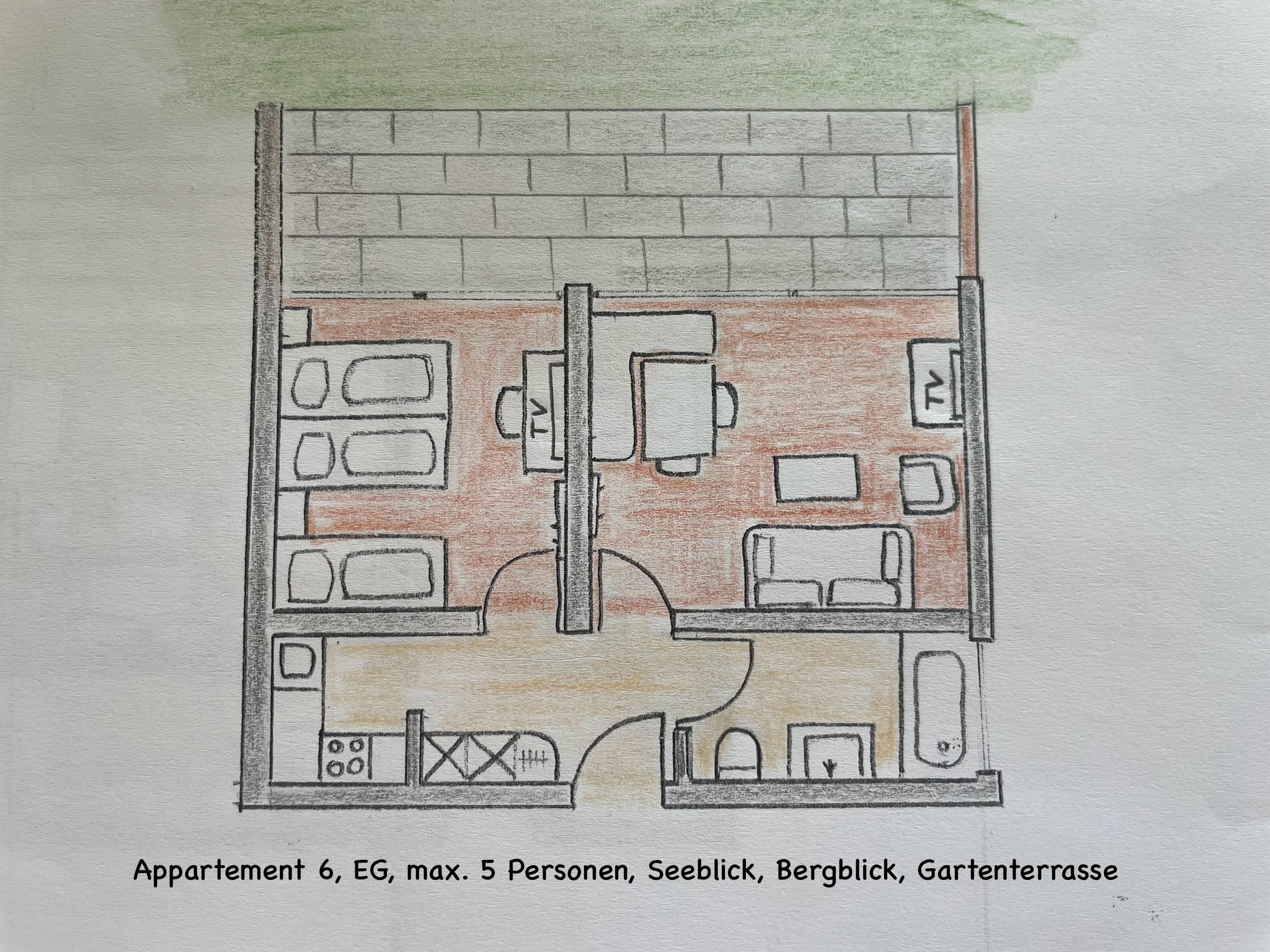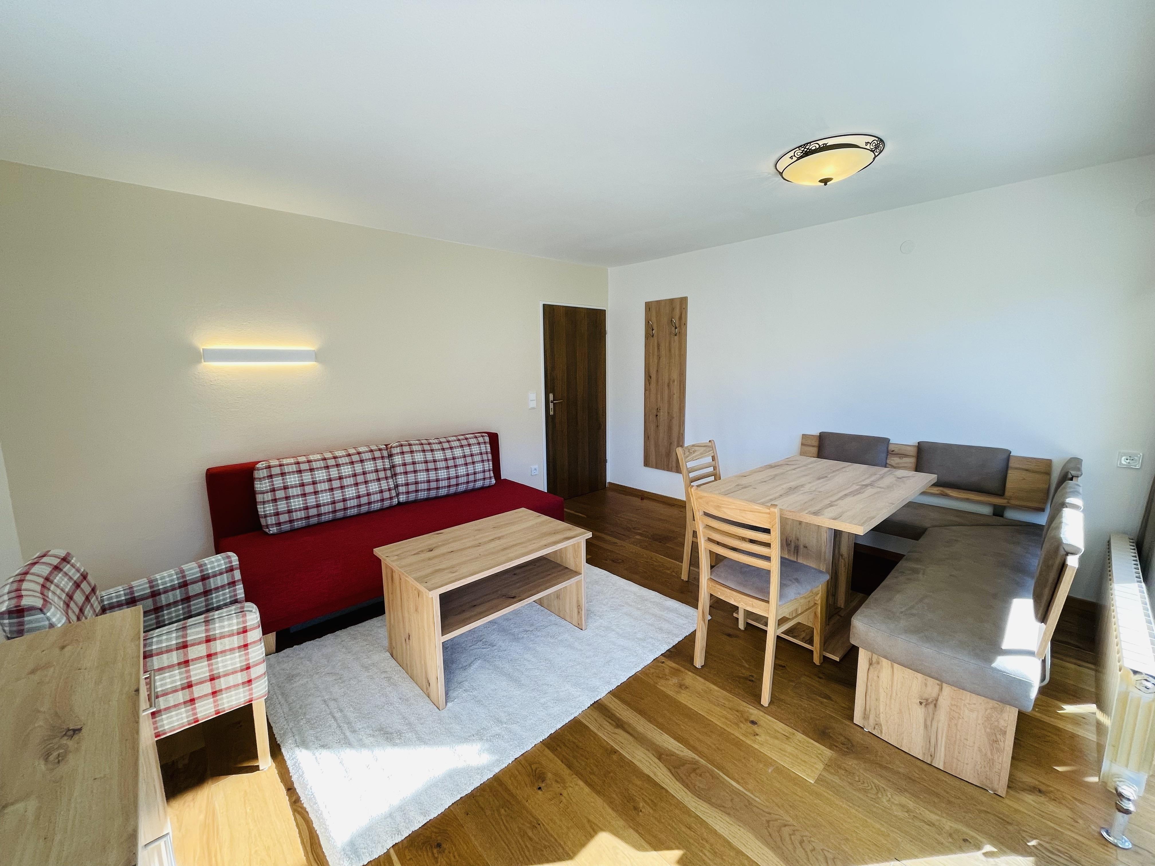 Wohnschlafzimmer mit zwei Couches und Tischchen, gepolsterter Eßecke und Bauernkomode. Dreibettzimmer mit 2 Fauteuils und Tischchen, Wandvertäfelung. Große Schiebetüre zum Liegebalkon bzw. zur Gartenterasse. Vorraum mit Schrank. Badezimmer mit Badewanne, Waschbecken, WC und Heizstrahler. Separate Küche mit 3-Platten-Herd, Kühlschrank, Geschirrspülmaschine, Mikrowellenherd, Dunstabzug, kompl. Geschirr, Kaffeemaschine. Farb-TV, Safe, Internetanschluss. Haustiere sind nicht erlaubt!