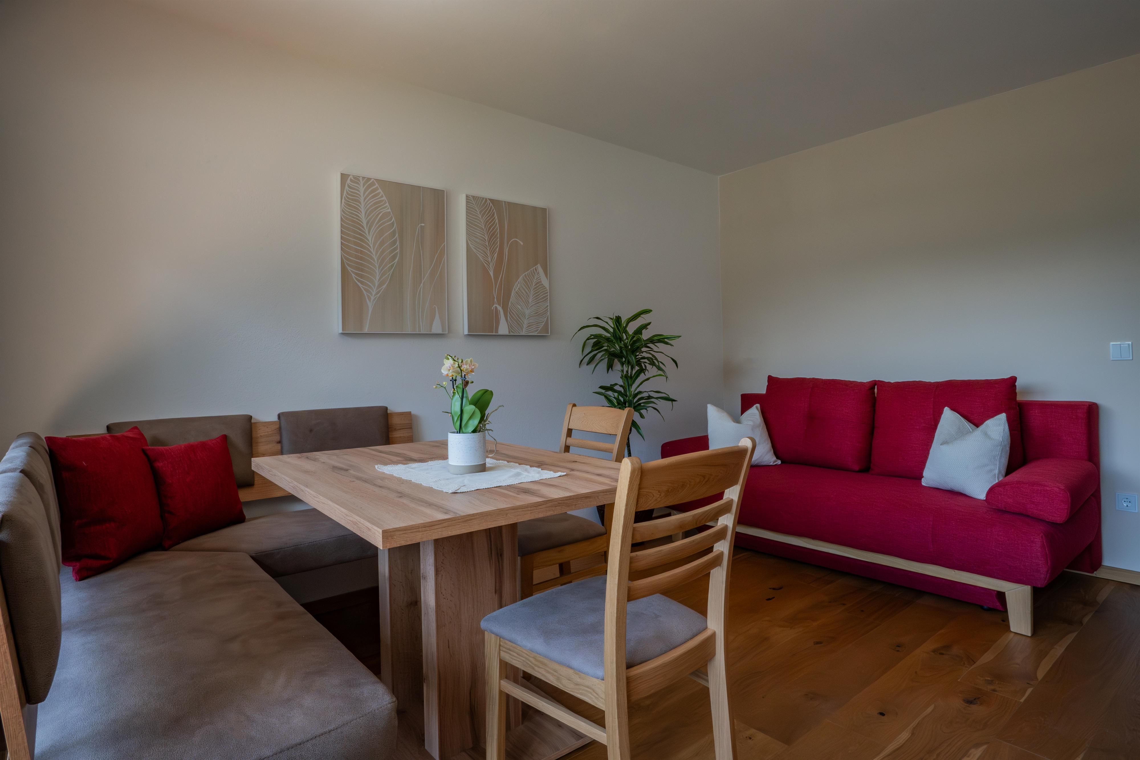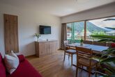 Wohnschlafzimmer mit Doppelcouch, gepolsterter Eßecke und Bauernkomode. Zweibettzimmer mit 2 Fauteuils und Tischchen, Wandvertäfelung. Große Schiebetüre zum Liegebalkon bzw. zur Gartenterasse. Vorraum mit Schrank. Frisch renoviertes Badezimmer mit Dusche, Waschbecken, WC und Heizstrahler. Seperate Küche mit 3-Platten-Herd, Dunstabzug, kompl. Geschirr, Kühlschrank, Geschirrspülmaschine, Mikrowellenherd, Kaffeemaschine. Farb-TV,  Safe, Internetanschluss.