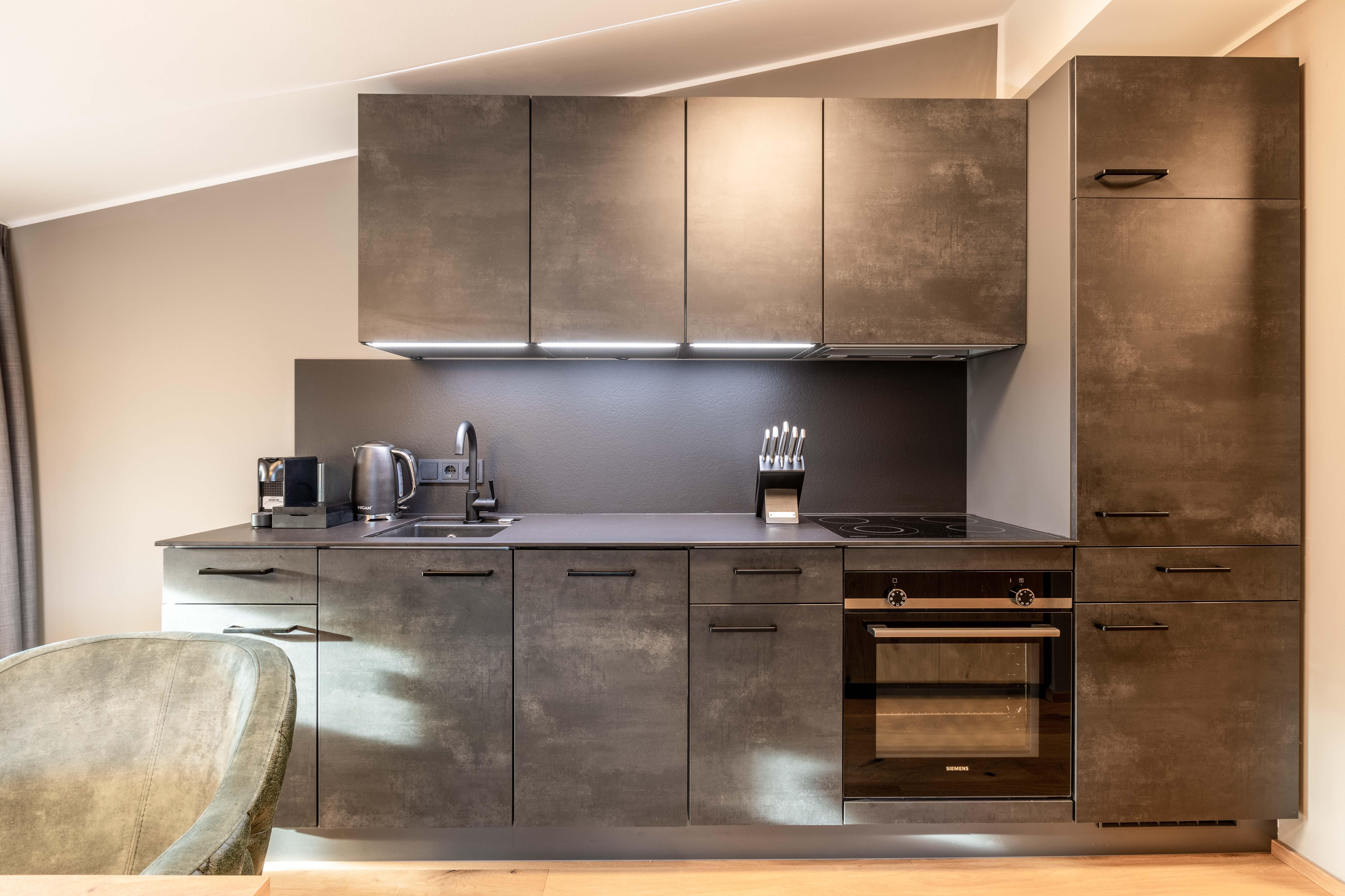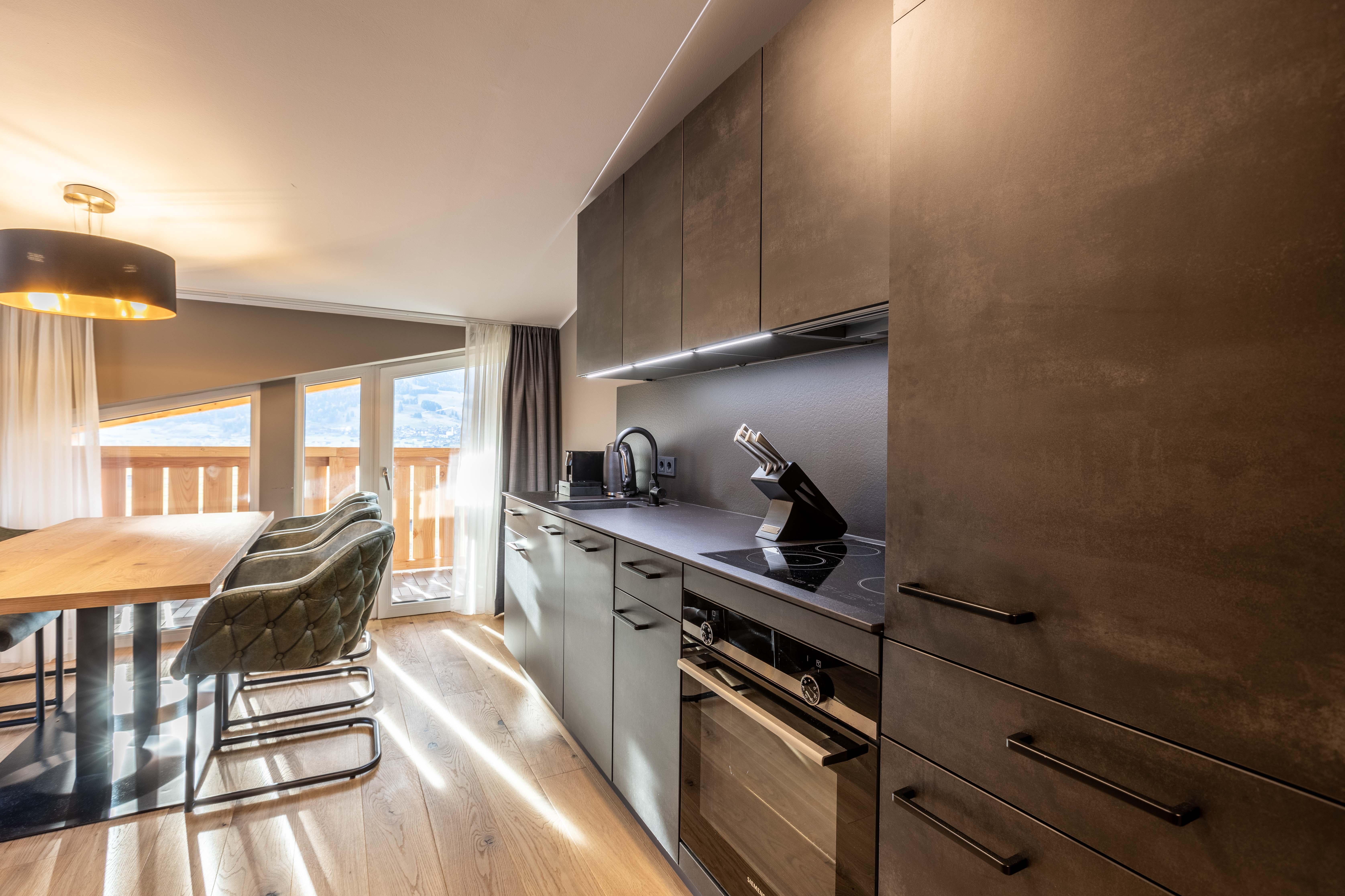Das Apartment für 6 Personen wartet mit Wohnküche, 2 Schlafzimmern (Boxspringbetten, 1x Terrassenzugang+eigenes Bad), 2 Bädern, Terrasse+Balkon auf. Der Eingangsbereich, führt direkt in die Wohnküche, welche mit Küchengeräten, Kühl-Gefrierkombi sowie Nespressomaschine ausgestattet ist. Am Esstisch ist Platz, um ein selbstgekochtes Mahl zu genießen. Im Wohnbereich (Balkonzugang) befinden sich TV, Schrank+Ausziehsofa. Auf Anfrage ist das Apt. mit dem anderen Penthouse buchbar. (für 12 Personen)