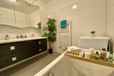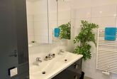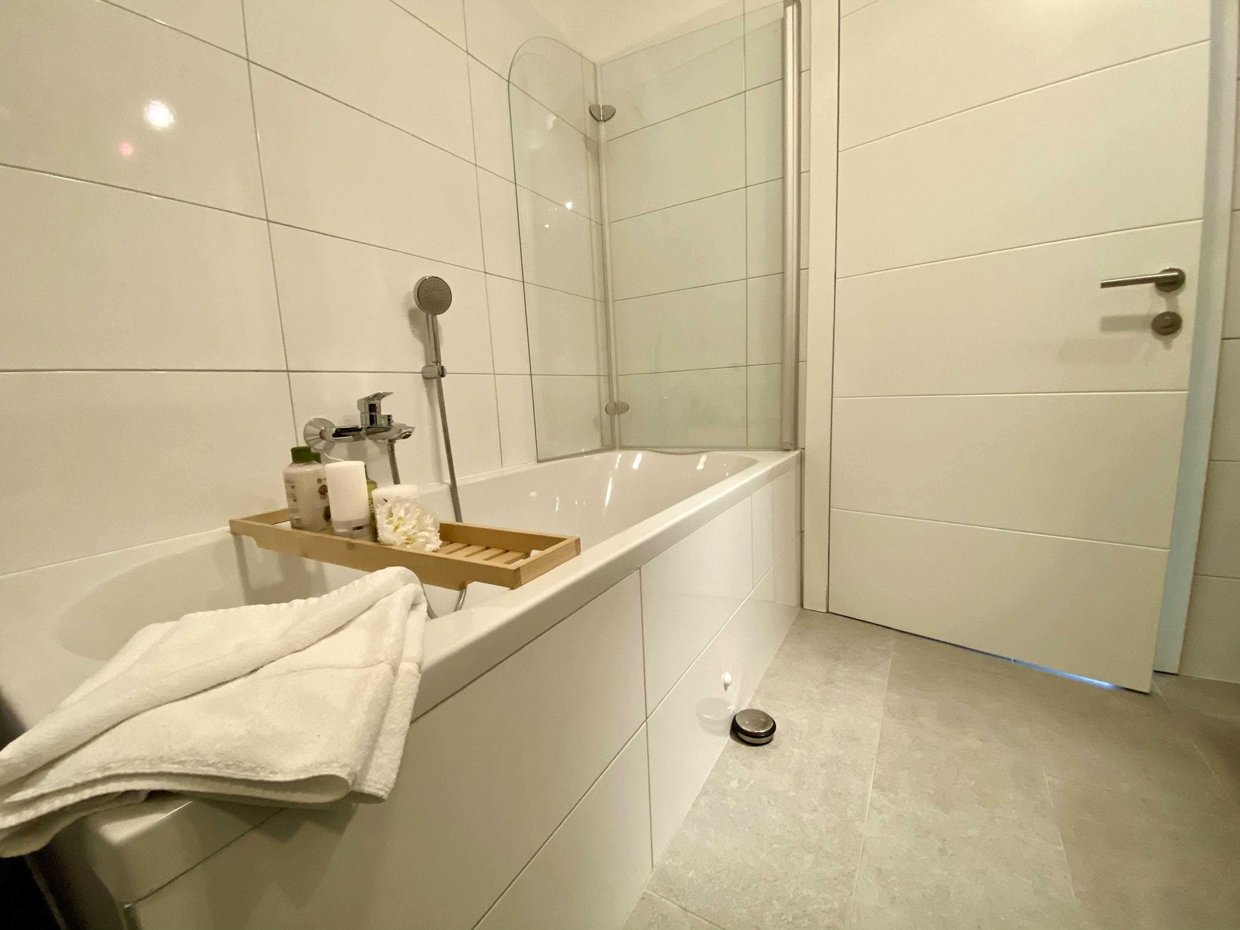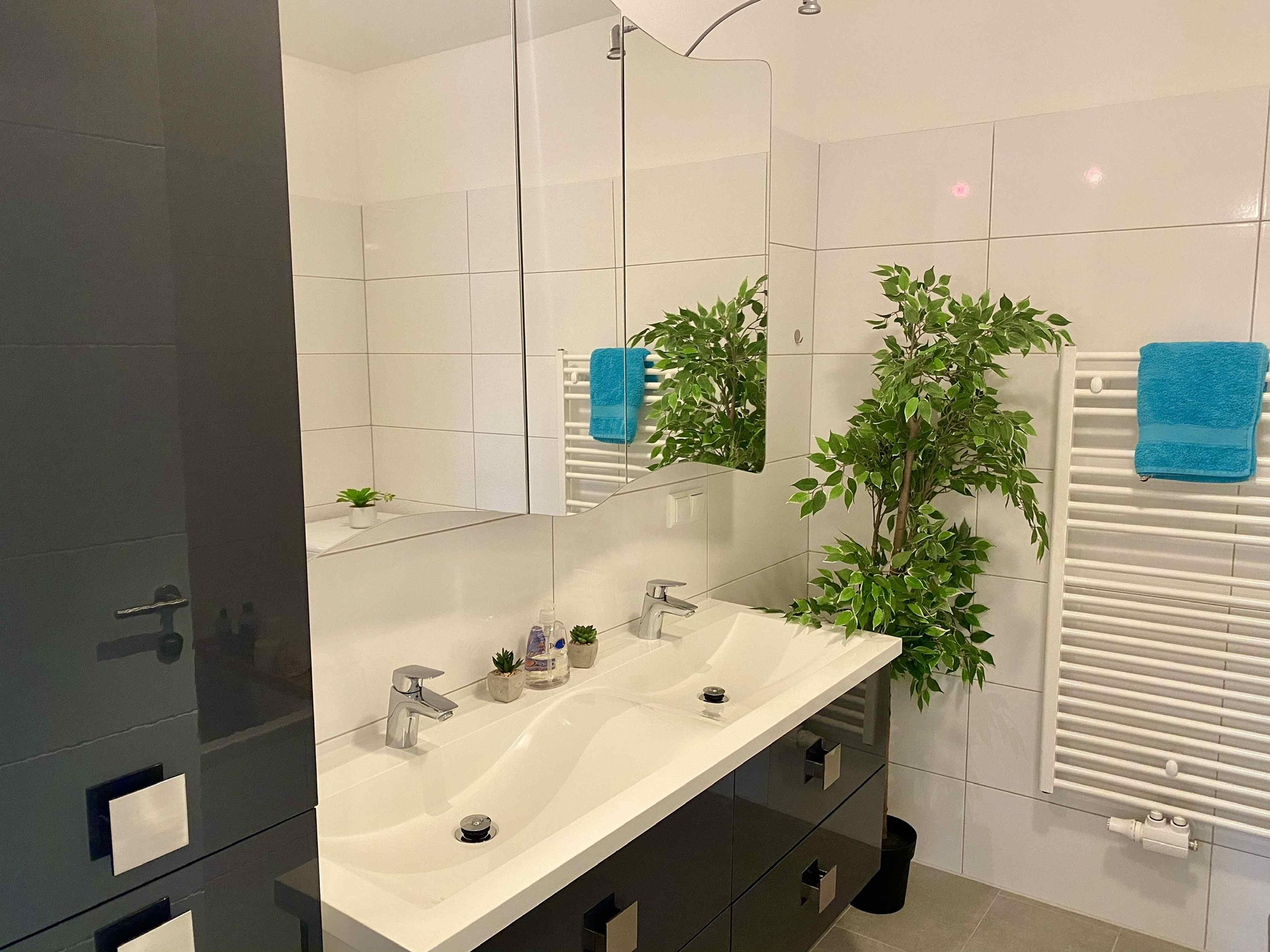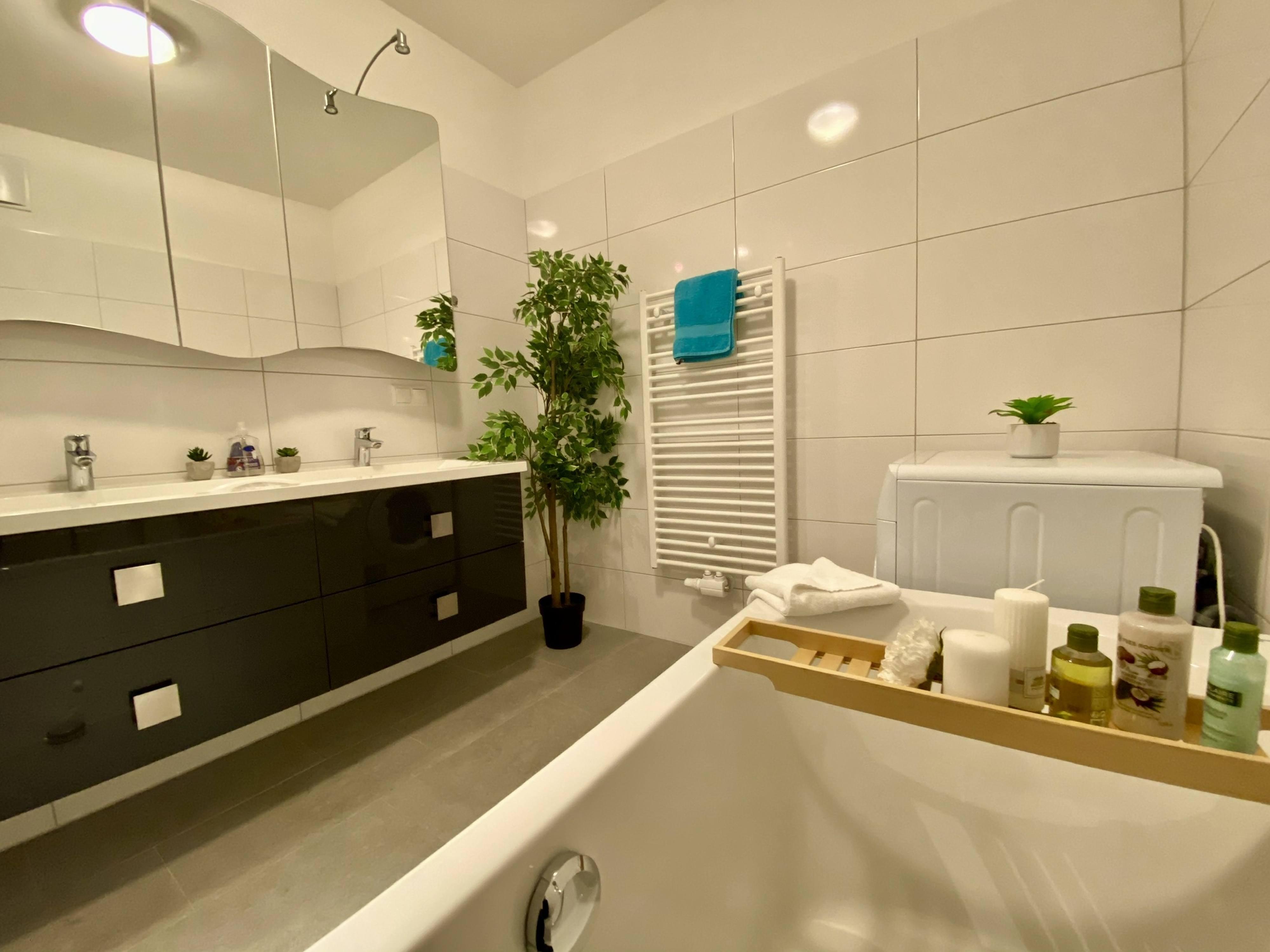 Auf 60 Quadratmetern erwarten Dich 2 Schlafzimmer mit Doppelbetten, eine Wohnküche, 1 Badezimmer mit Doppelwaschbecken und Badewanne sowie ein Extra Gäste-WC.