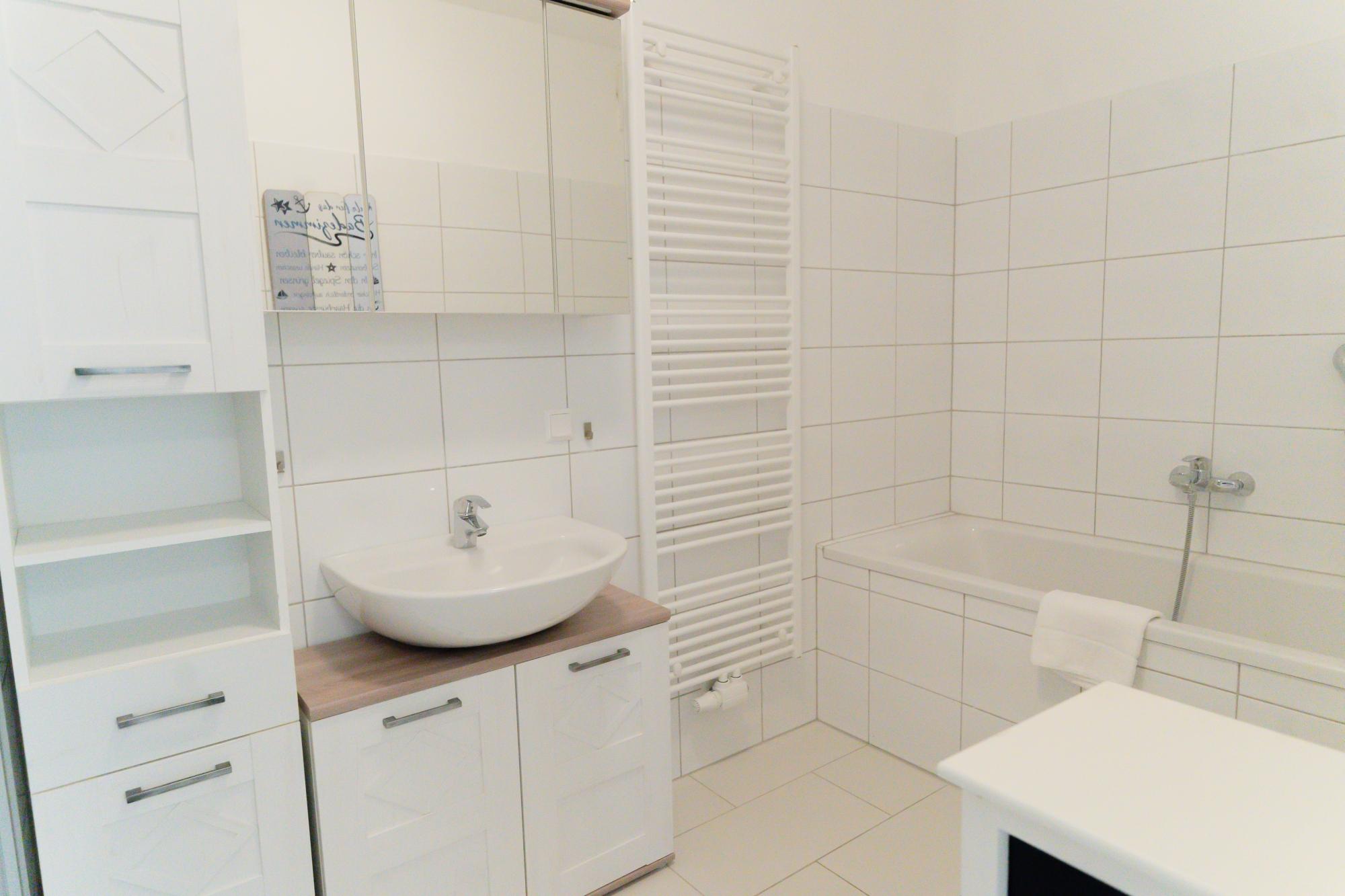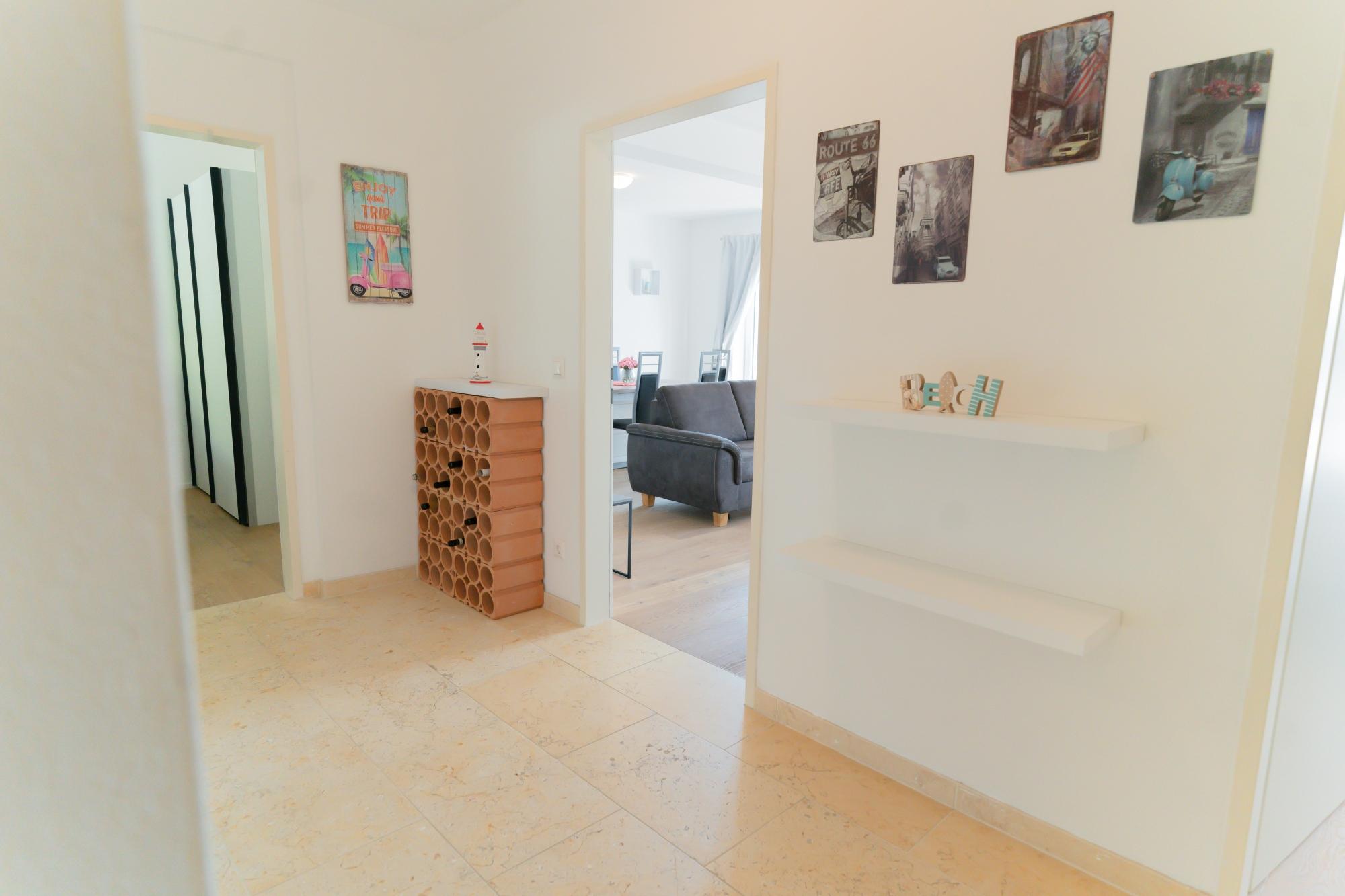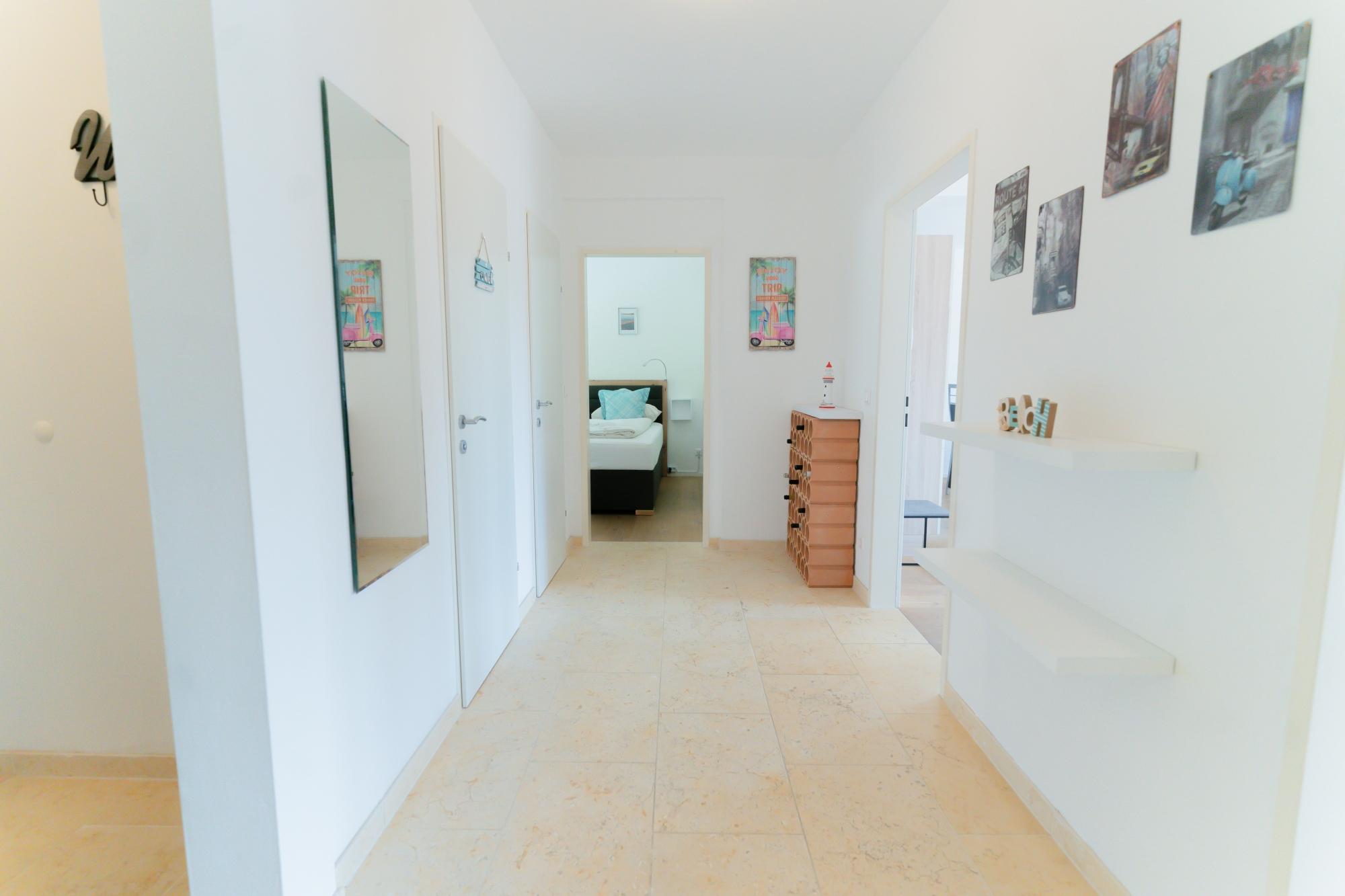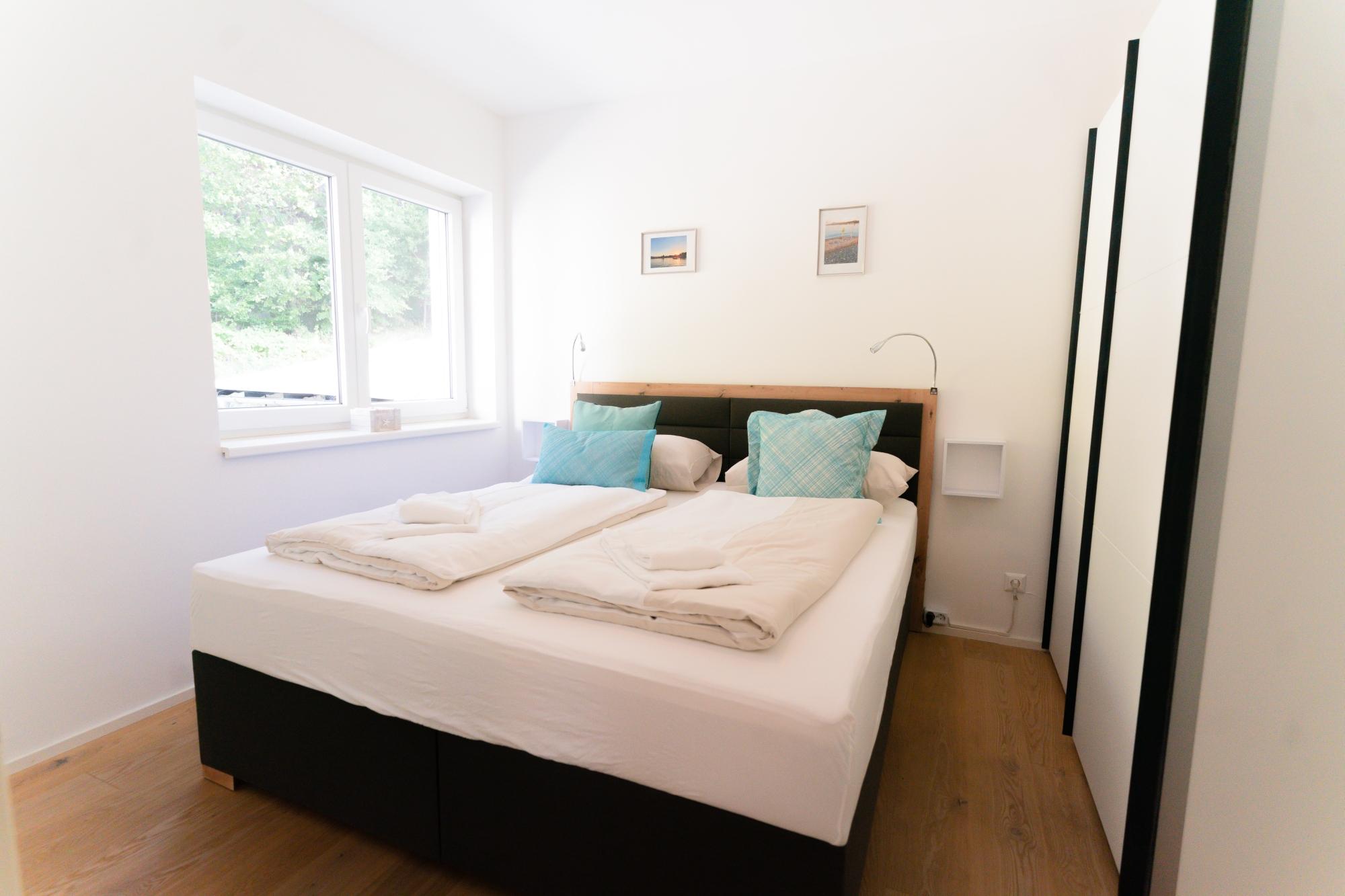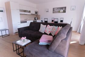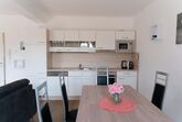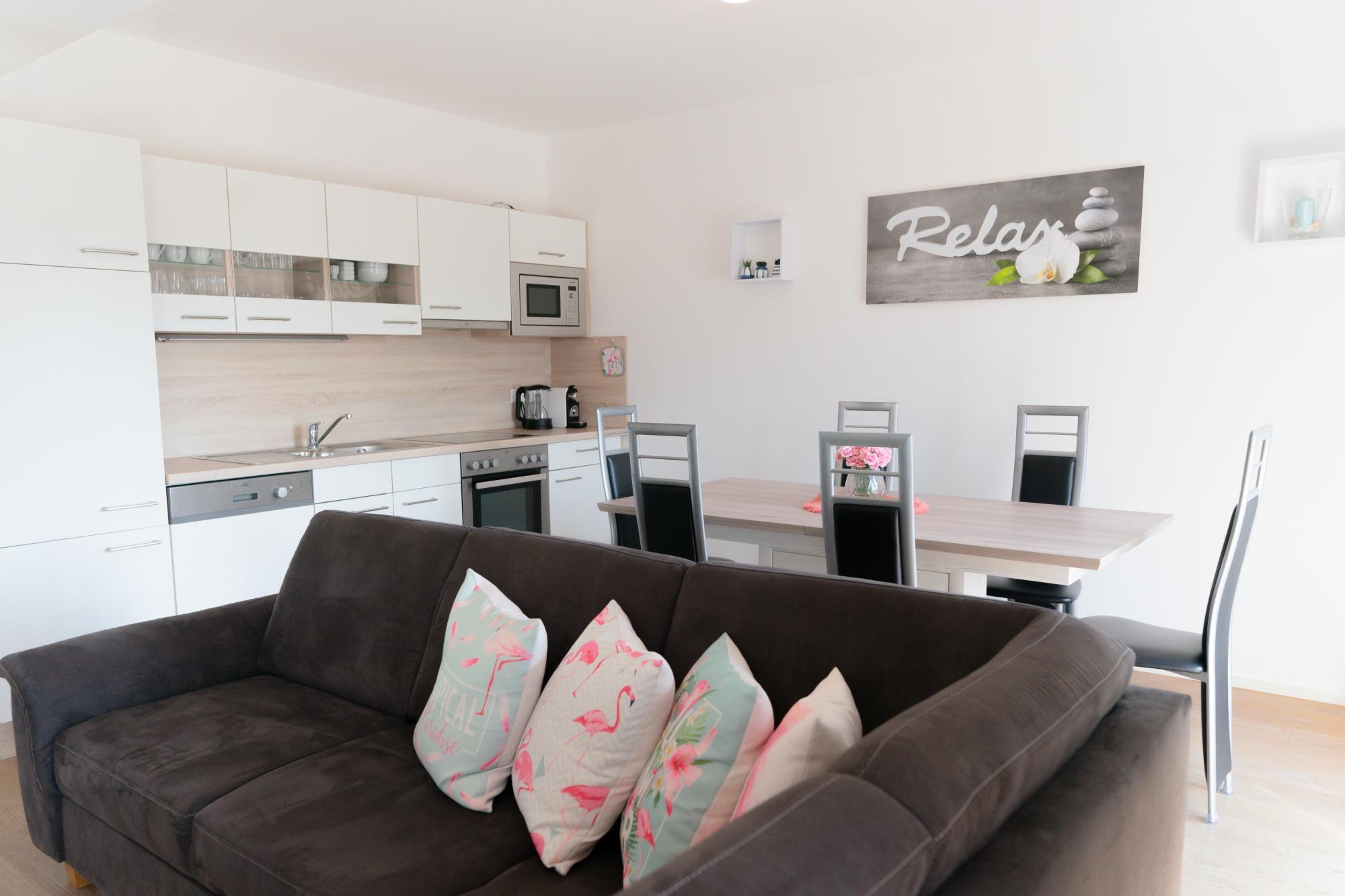 Das Apartment verfügt über 2 Schlafzimmer, eines mit einem gemütlichen Doppelbett und eines mit zwei Einzelbetten, die zu einem Doppelbett zusammengeschoben werden können. Die Lounge im Wohnbereich bietet eine gemütliche Sitz- und Schlafgelegenheit für weitere 2 Personen. In der hellen Wohnküche befindet sich ein (ausziehbarer) Essbereich, der Platz für 6 Personen bietet und eine voll ausgestattete Küche. Der schöne Sonnenbalkon ist vom Wohnzimmer, dem Essbereich und dem Schlafzimmer aus erreichbar. Das Badezimmer ist mit einer Badewanne, einer Dusche, einem WC, einem Waschtrockner und einem Handtuchtrockner ausgestattet. Zusätzlich gibt es noch ein separates WC. Ein Carport- Stellplatz vor dem Haus steht kostenlos zur Verfügung.