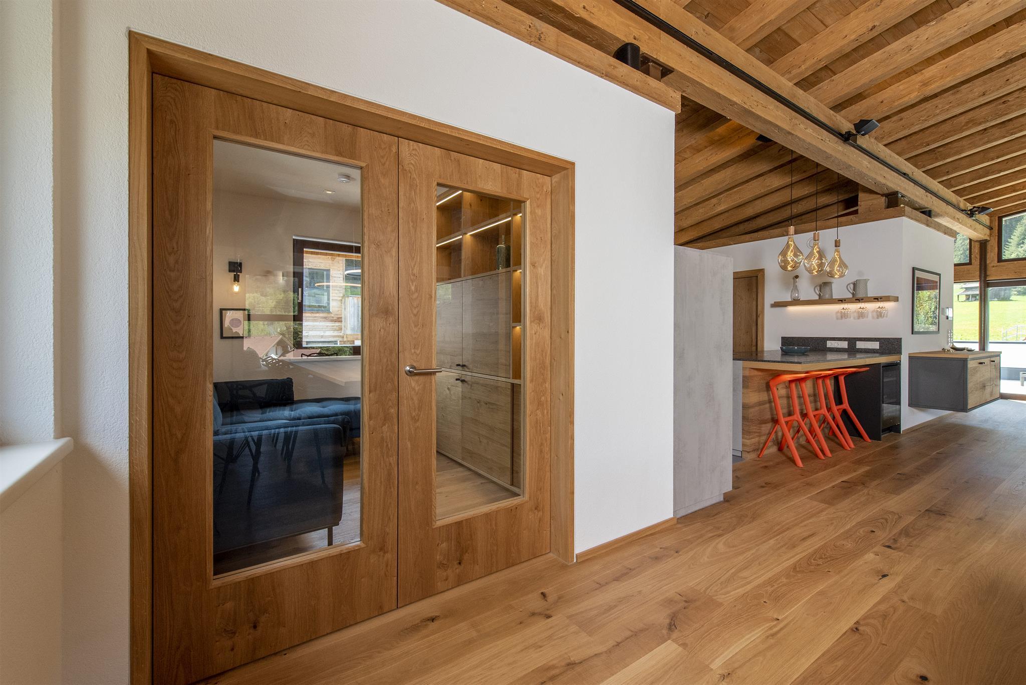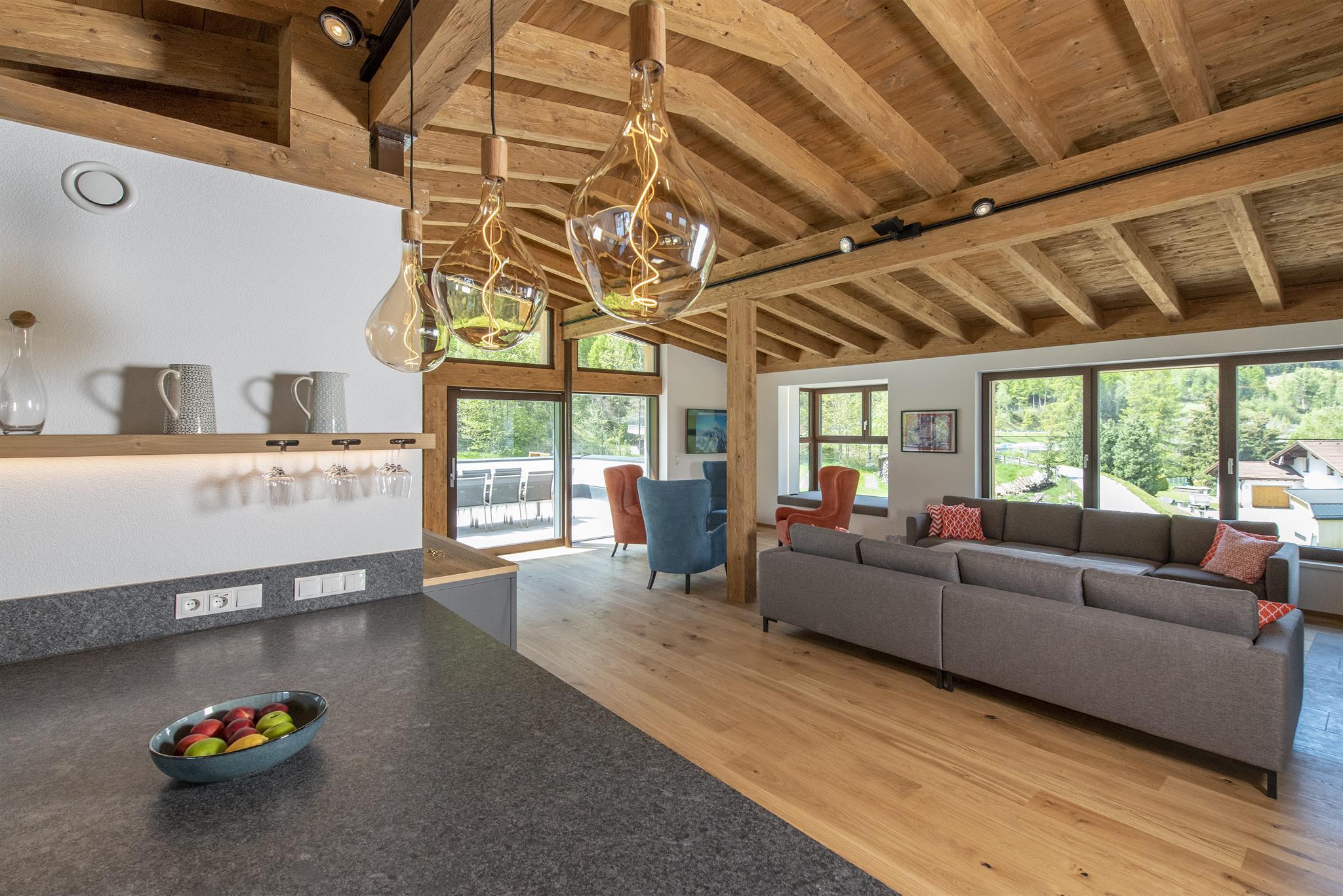 Der spektakuläre offene Wohn- und Essbereich ist schön hell und verfügt über einen offenen Kamin, einen Essbereich für 14 Personen, viele gemütliche Sitzmöglichkeiten, um die Erlebnisse des Tages mit Freunden und Familie zu teilen. Weiters sind hervorstehende Fenstersitze perfekt positioniert, um den atemberaubenden Ausblick zu genießen. Der Wohnbereich schließt an eine große Terrasse an, die einen ungestörten Blick auf den Berg Hoher Riffler bietet. Zusätzlich ist auch eine Bibliothek nebem dem Essbereich angesiedelt, um einen ruhigen und gemütlichen Rückzugsort zu bieten. Die state of the art Küche ist voll ausgestattet mit allem was Sie brauchen. Dazu zählen 2 Geschirrspüler, Induktionsherd, ein großer Kühl- und Gefrierschrank, eine Kaffemaschine, Barhocker und eine Speisekammer mit zusätzlichem Kühlschrank.