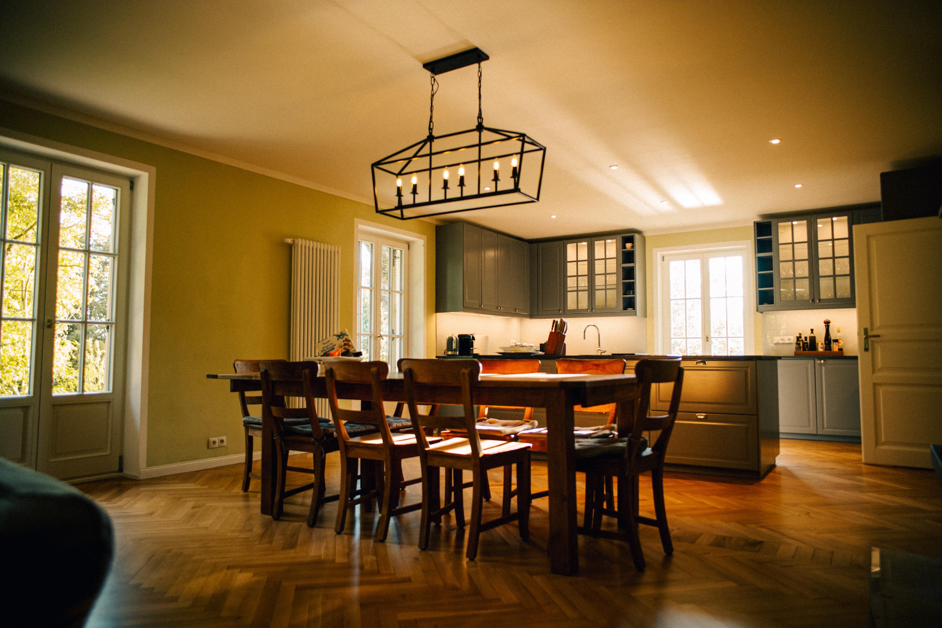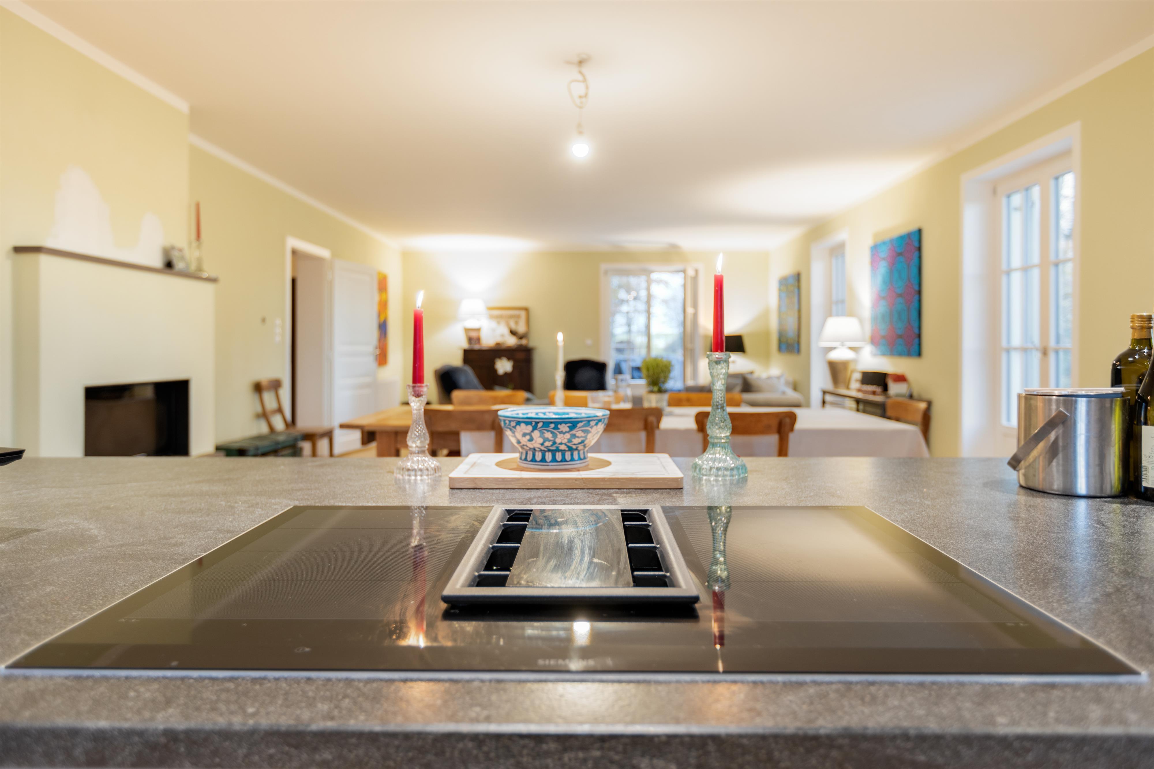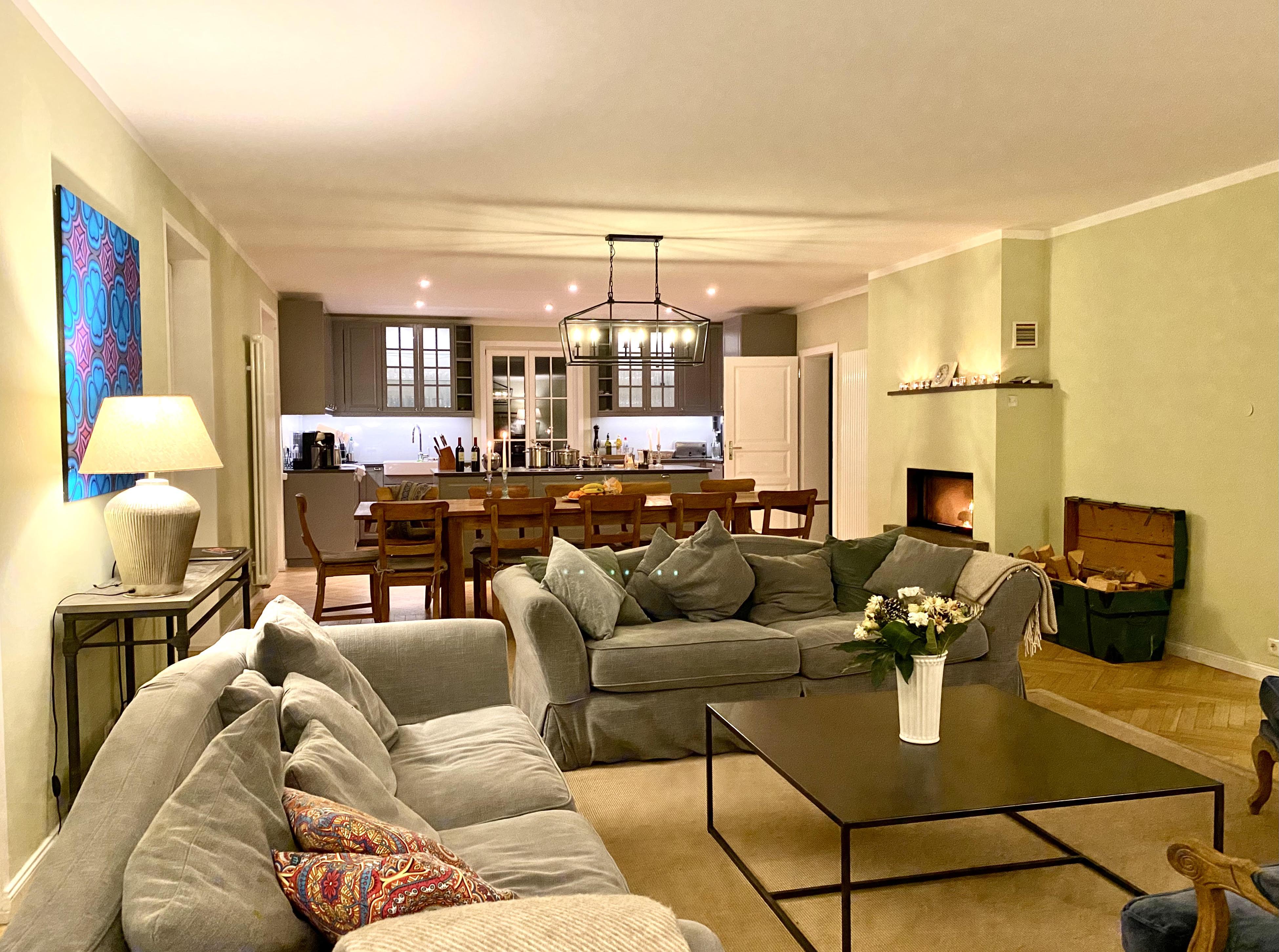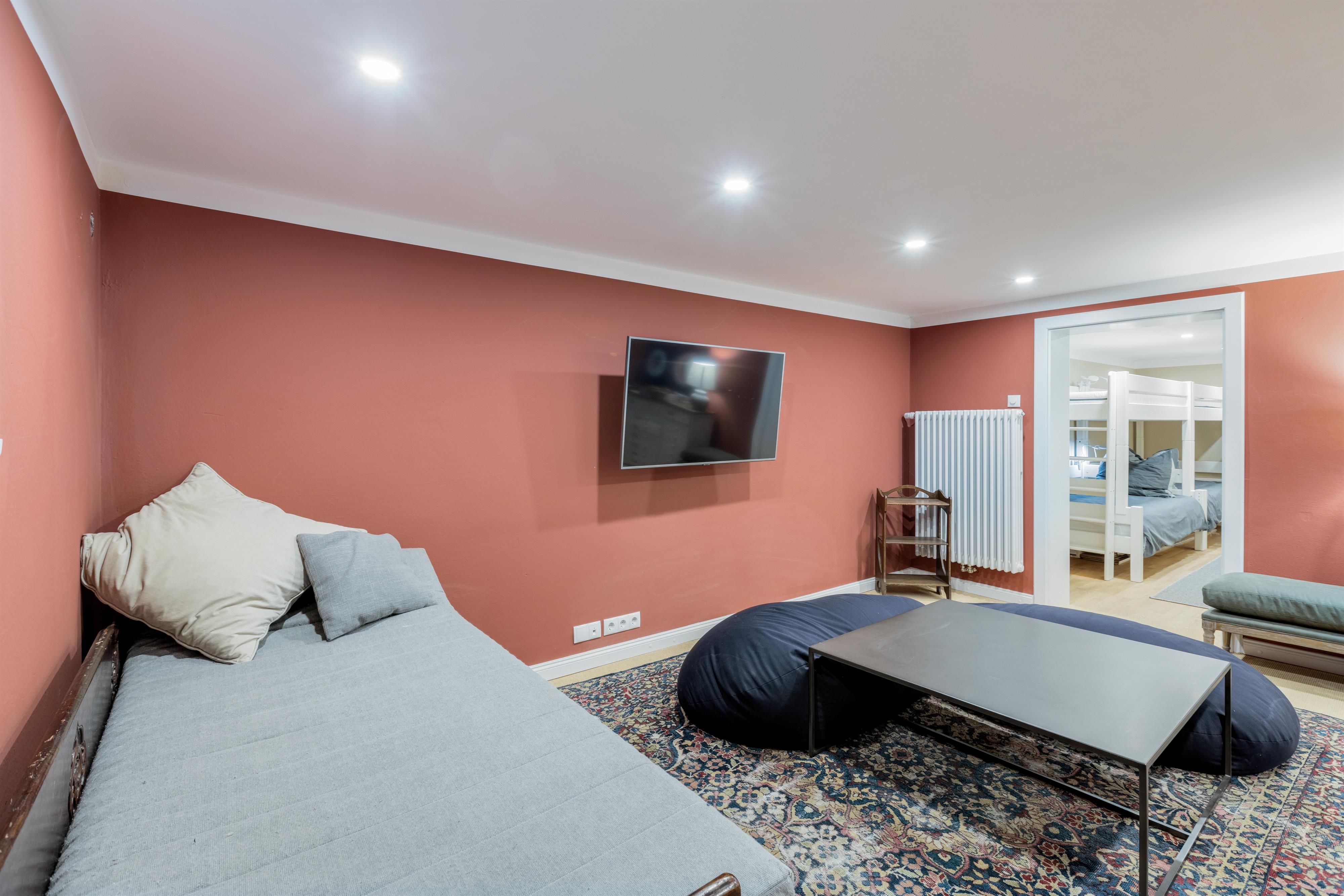 Das hochwertig ausgestattete Haupthaus erstreckt sich über 4 Etagen. Sowohl das Wohnzimmer, wie auch die Küche ist mit Top-Technik ausgestattet. Die Küche verfügt über zwei Öfen, einen Induktionsherd, eine vollautomatische Kaffeemaschine und eine Spülmaschine. Im ersten und zweiten Stock befinden sich 5 Schlafzimmer sowie 2 Bäder. Im Souterrain sind 2 weitere Schlafzimmer, ein Bad und ein zweites Wohnzimmer. Auf der Terrasse lässt sich bei einem gemütlichen Grillabend, der Tag ausklingen.