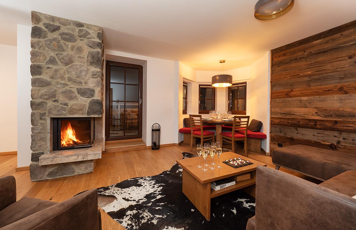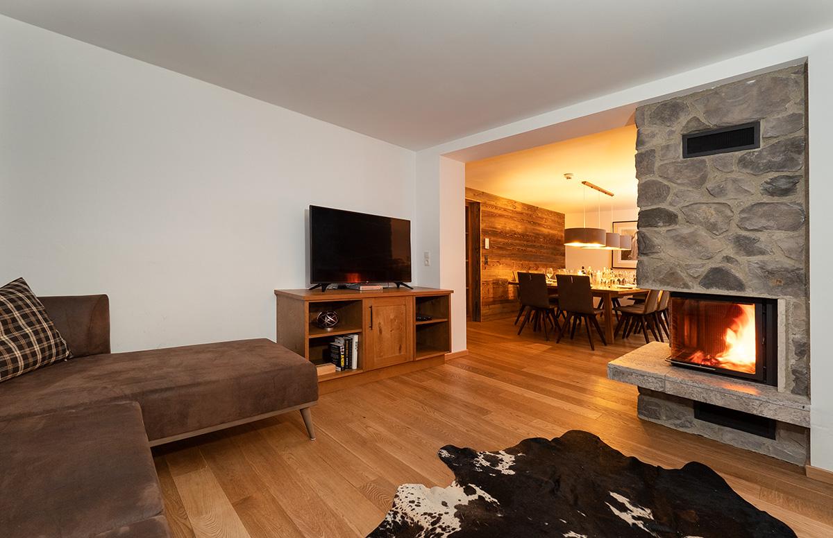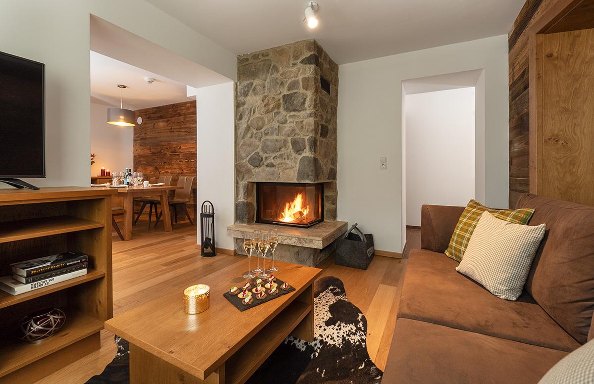 Die romantische Kaminfeuerstelle mit gemütlichen Sitzbereich, lässt Genießerherzen bei einem schönen Film oder einem gemeinsamen Glas Wein höherschlagen.