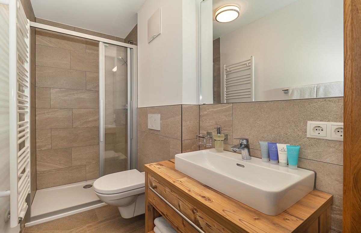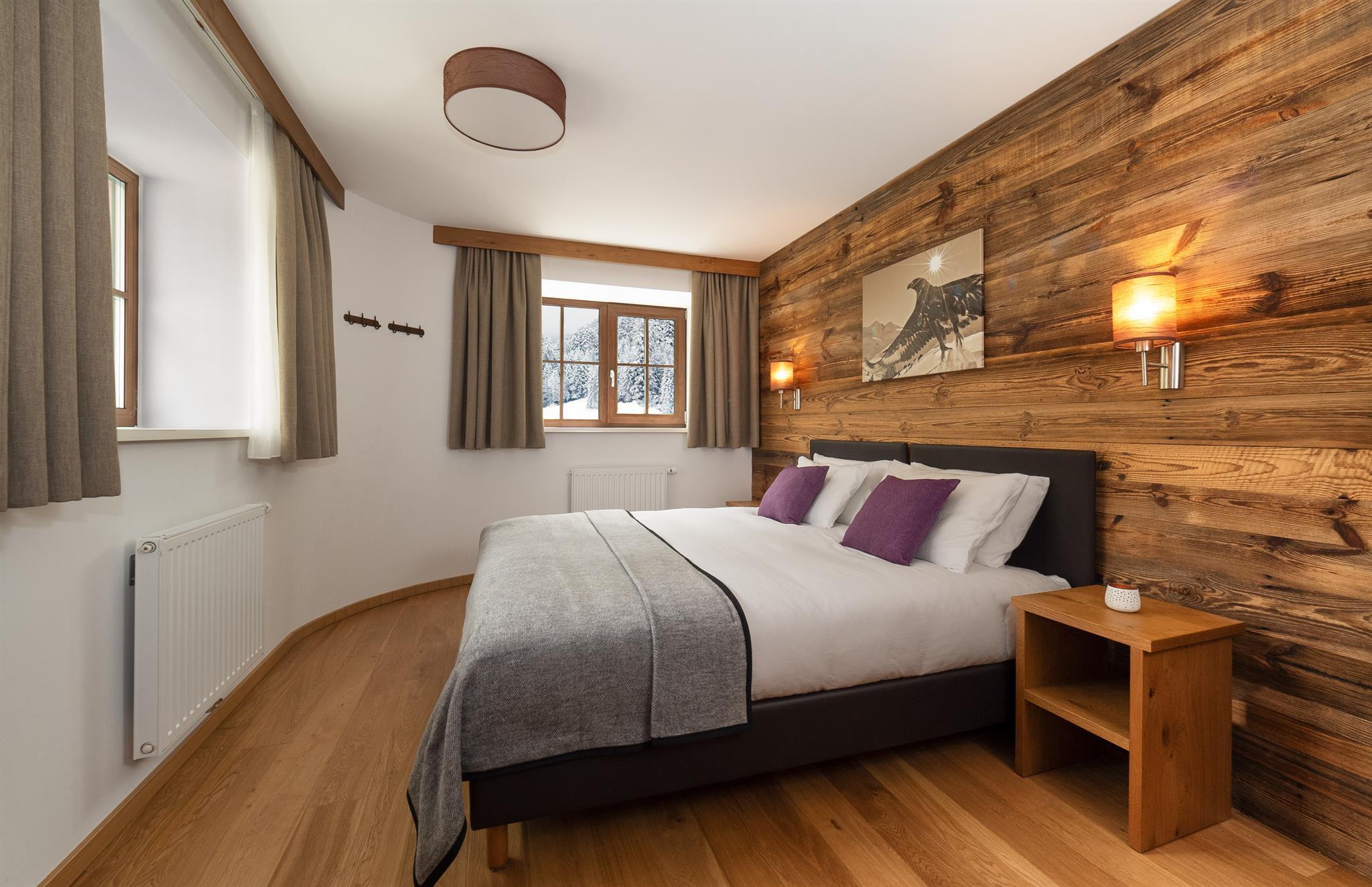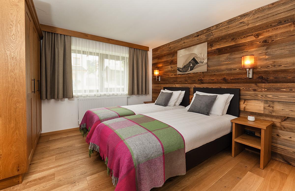 Das Chalet Viridi bietet Platz für bis zu 4 Personen auf einer Wohnfläche von 75m². Die zwei großzügigen, rustikalen Schlafzimmer sind mit einem bequemen, teilbaren Boxspring-Doppelbett, einem geräumigen Kleiderschrank und einem Nachttischchen ausgestattet. Jedes Schlafzimmer verfügt über ein eigenes modernes Badezimmer mit Waschbecken, Dusche oder Badewanne, WC, Haarföhn und einem Handtuchtrockner.