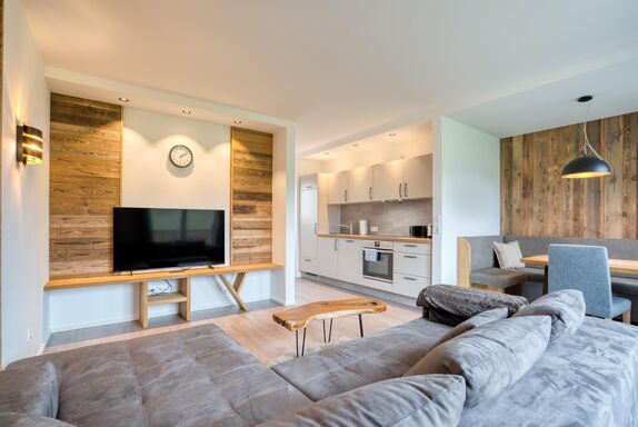 Das Apartment 3 ist Dein zu Hause auf Zeit im malerischen Bad Häring. Großzügige 60m² warten darauf von dir bewohnt zu werden. Das Apartment 1 überstreckt sich über zwei Etagen. Im Erdgeschoß befinden sich insgesamt zwei Schlafzimmer. Eines der Schlafzimmer verfügt über ein Doppelbett während im anderen Schlafzimmer ein Stockbett sowie ein Einzelbett vorzufinden sind. Das Doppelzimmer ist dabei sehr gemütlich und besonders, da Altholzelemente liebevoll an der Wand positioniert wurden. Neben den beiden Schlafzimmern befindet sich im Erdgeschoß zudem eine separate Toilette. Der erste Stock kann über eine schöne, beleuchtete Treppe erreicht werden. Oben, im ersten Stock angekommen, wartet das Highlight der Wohnung auf Dich: es ist der stilvolle Wohn- und Essbereich. Die Küchenzeile lädt zu Kochabenden aller Art ein und die zuvor zubereiteten Speisen können dann auf der gemütlichen Eckbank verzehrt werden. Weiters verfügt der Wohnraum über eine komfortable Couch auf welcher man entspannen und auf dem großen Smart-TV fernsehen kann. Einfach zurücklehnen und das herrliche Ambiente genießen, eine warme Dusche im angrenzenden Badezimmer nehmen oder auf dem ebenfalls angrenzenden Balkon die letzten Sonnenstrahlen des Tages einfangen. Das alles ist möglich in Deiner Natur Residenz Bad Häring. Das - und noch vieles mehr - also nichts wie los und ab in die Berge Tirols!