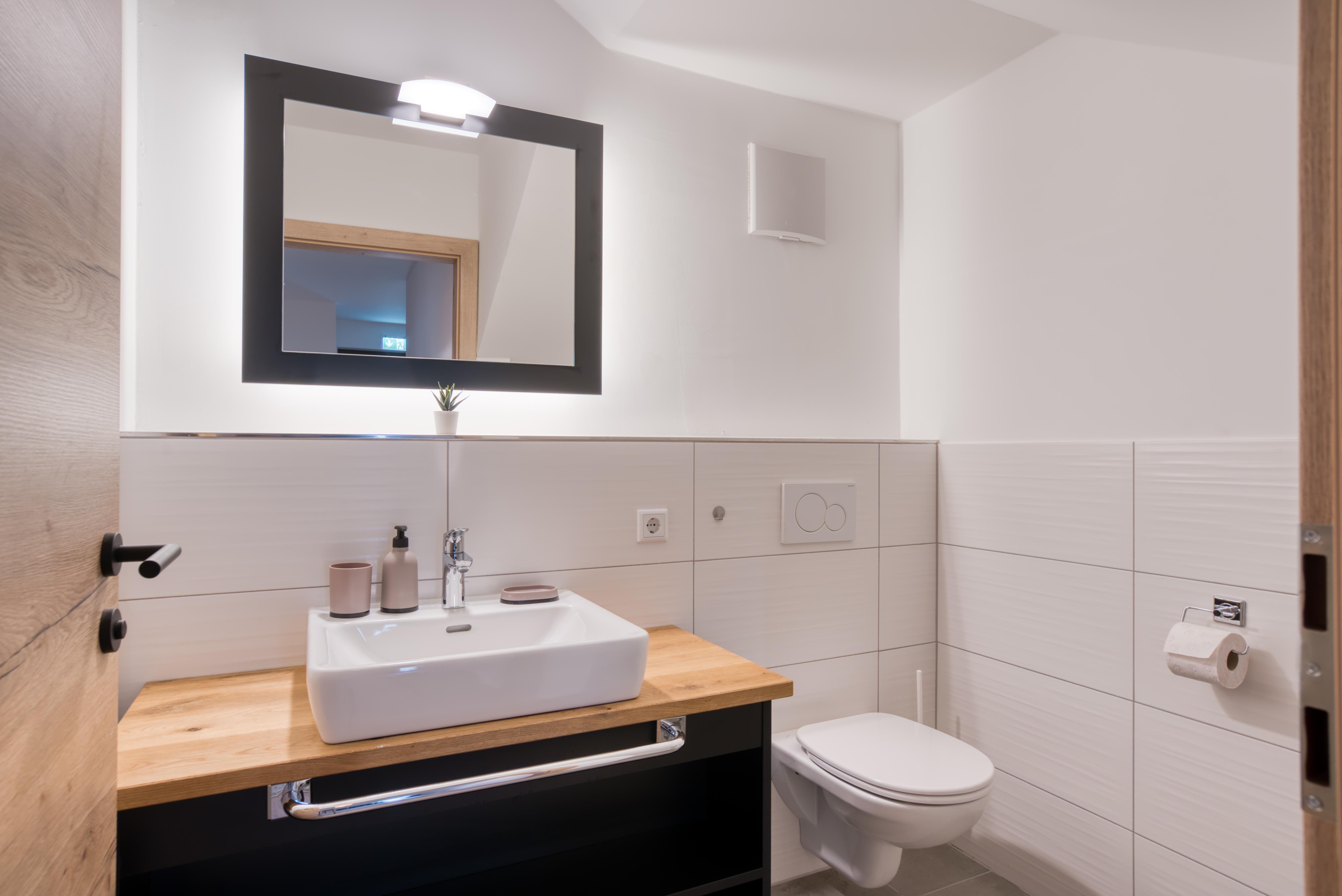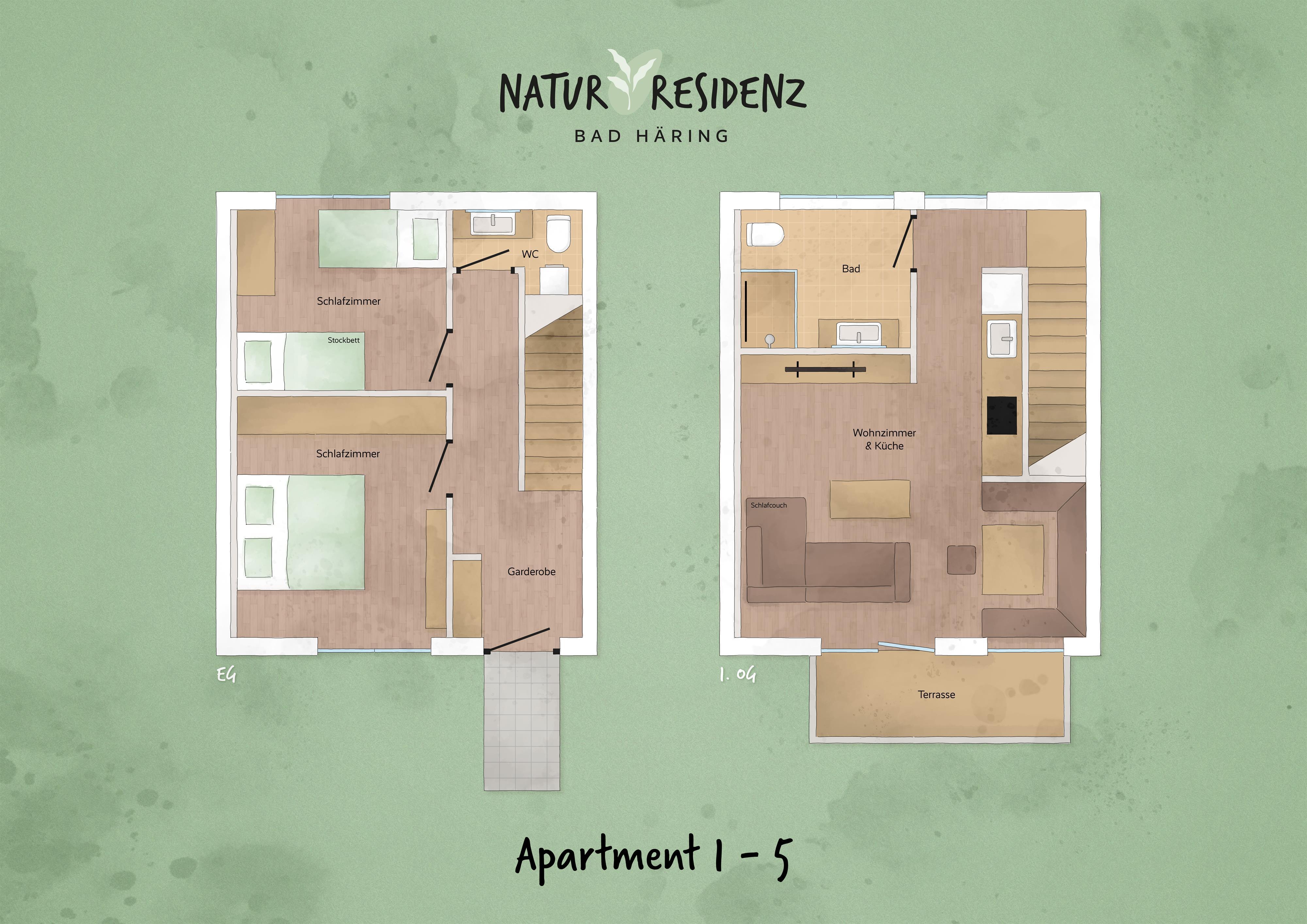 Das Apartment 5 ist Dein zu Hause auf Zeit im malerischen Bad Häring. Großzügige 60m² warten darauf von dir bewohnt zu werden. Das Apartment 5 überstreckt sich über zwei Etagen. Im Erdgeschoß befinden sich insgesamt zwei Schlafzimmer. Eines der Schlafzimmer verfügt über ein Doppelbett während im anderen Schlafzimmer ein Stockbett sowie ein Einzelbett vorzufinden sind. Das Doppelzimmer ist dabei sehr gemütlich und besonders, da Altholzelemente liebevoll an der Wand positioniert wurden. Neben den beiden Schlafzimmern befindet sich im Erdgeschoß zudem eine separate Toilette. Der erste Stock kann über eine schöne, beleuchtete Treppe erreicht werden. Oben, im ersten Stock angekommen, wartet das Highlight der Wohnung auf Dich: es ist der stilvolle Wohn- und Essbereich. Die Küchenzeile lädt zu Kochabenden aller Art ein und die zuvor zubereiteten Speisen können dann auf der gemütlichen Eckbank verzehrt werden. Weiters verfügt der Wohnraum über eine komfortable Couch auf welcher man entspannen und auf dem großen Smart-TV fernsehen kann. Einfach zurücklehnen und das herrliche Ambiente genießen, eine warme Dusche im angrenzenden Badezimmer nehmen oder auf dem ebenfalls angrenzenden Balkon die letzten Sonnenstrahlen des Tages einfangen. Das alles ist möglich in Deiner Natur Residenz Bad Häring. Das - und noch vieles mehr - also nichts wie los und ab in die Berge Tirols!