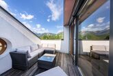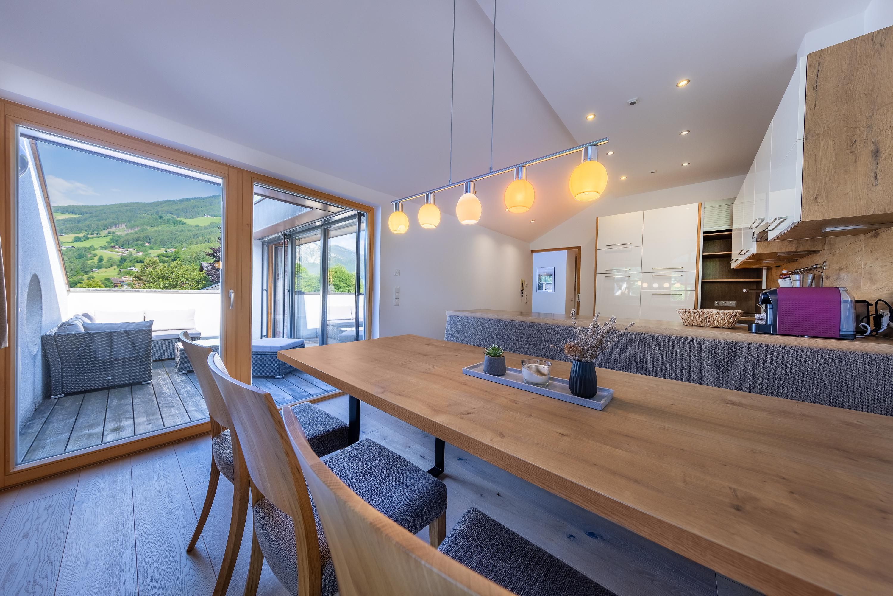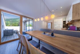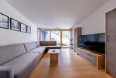 Unsere 115 m² große Ferienwohnung verfügt über eine geräumige Terrasse und einen Balkon mit atemberaubendem Bergblick. Entspanne vor dem Holzofen oder nutze die Doppelschlafcouch und den Fernseher für gemütliche Abende.