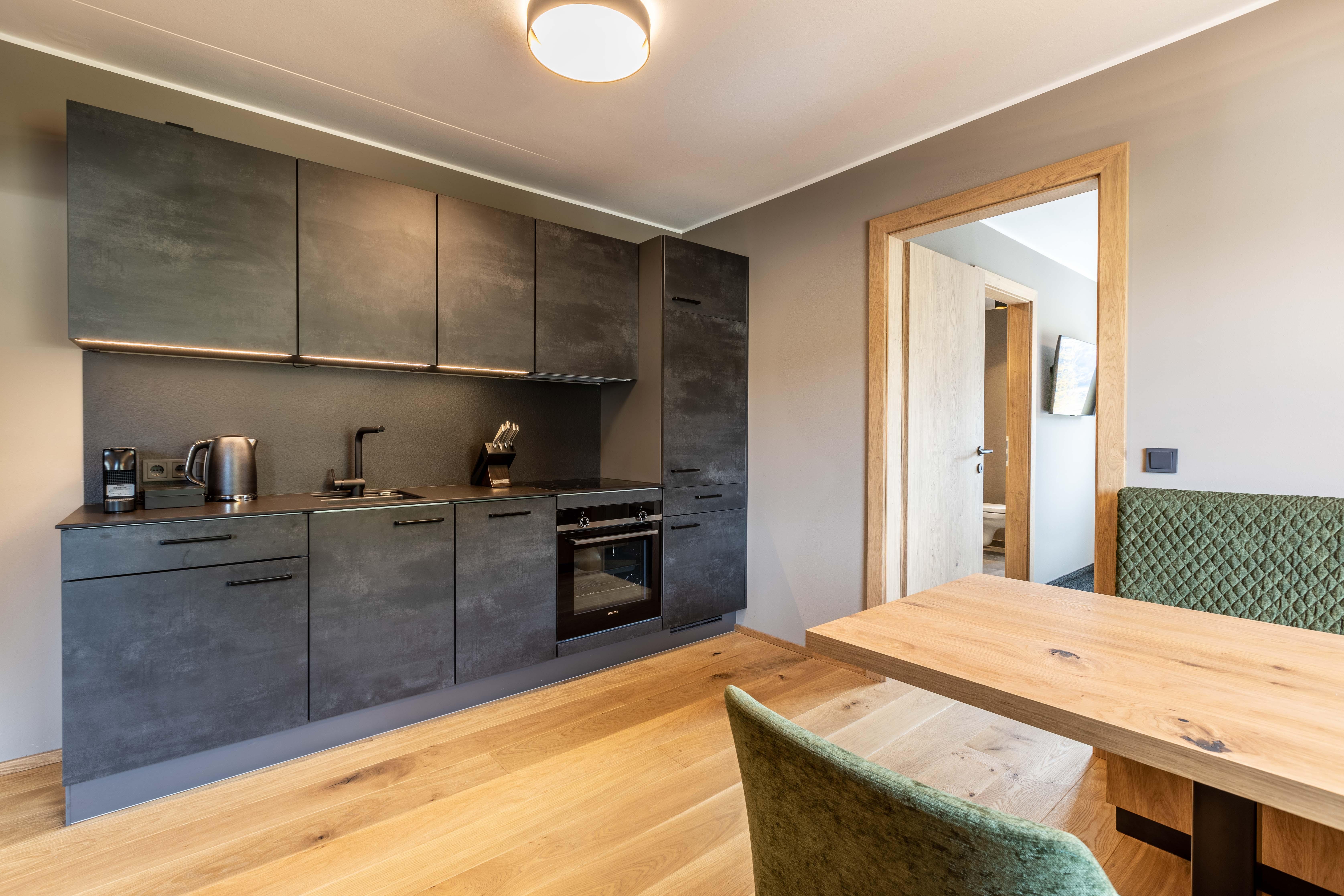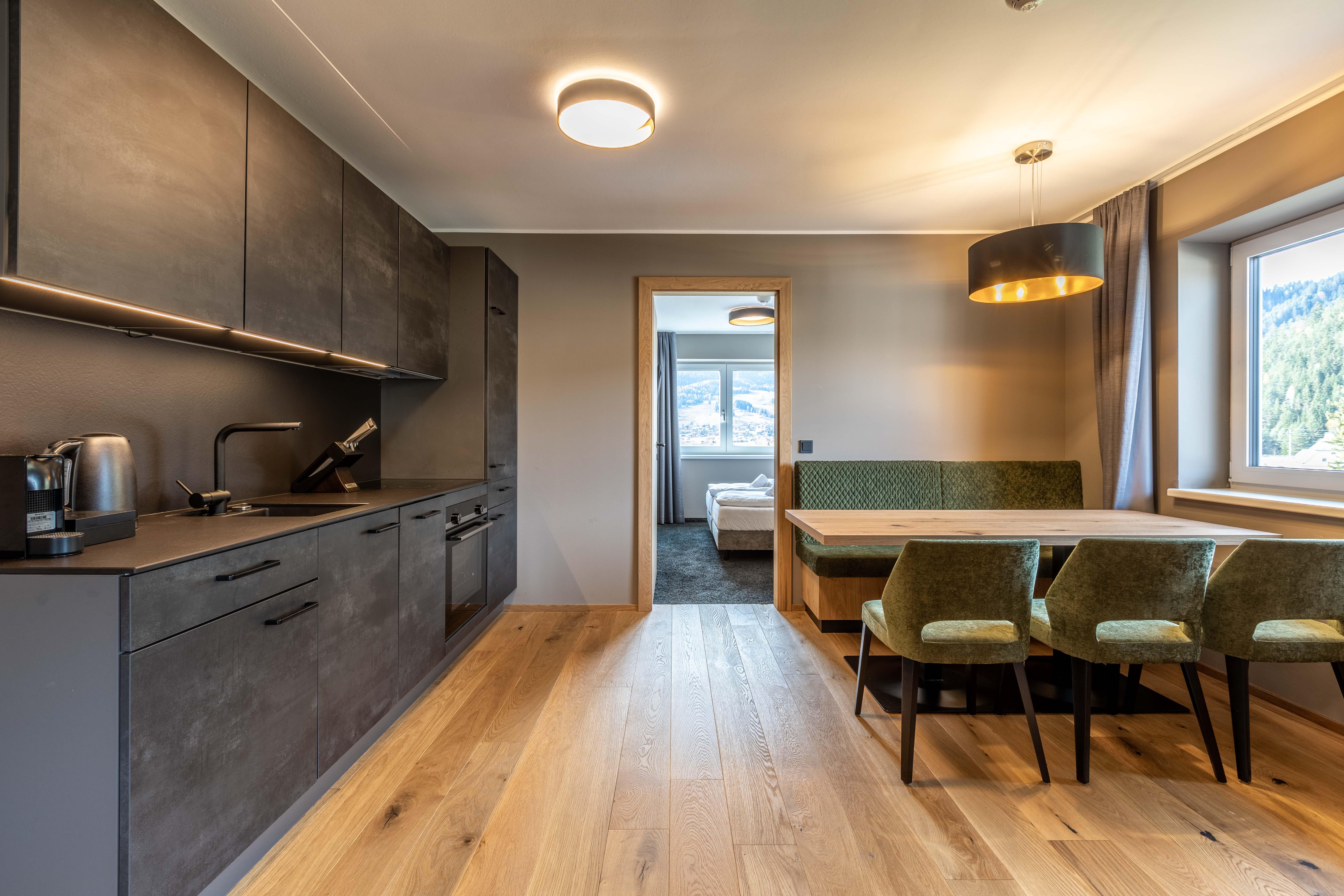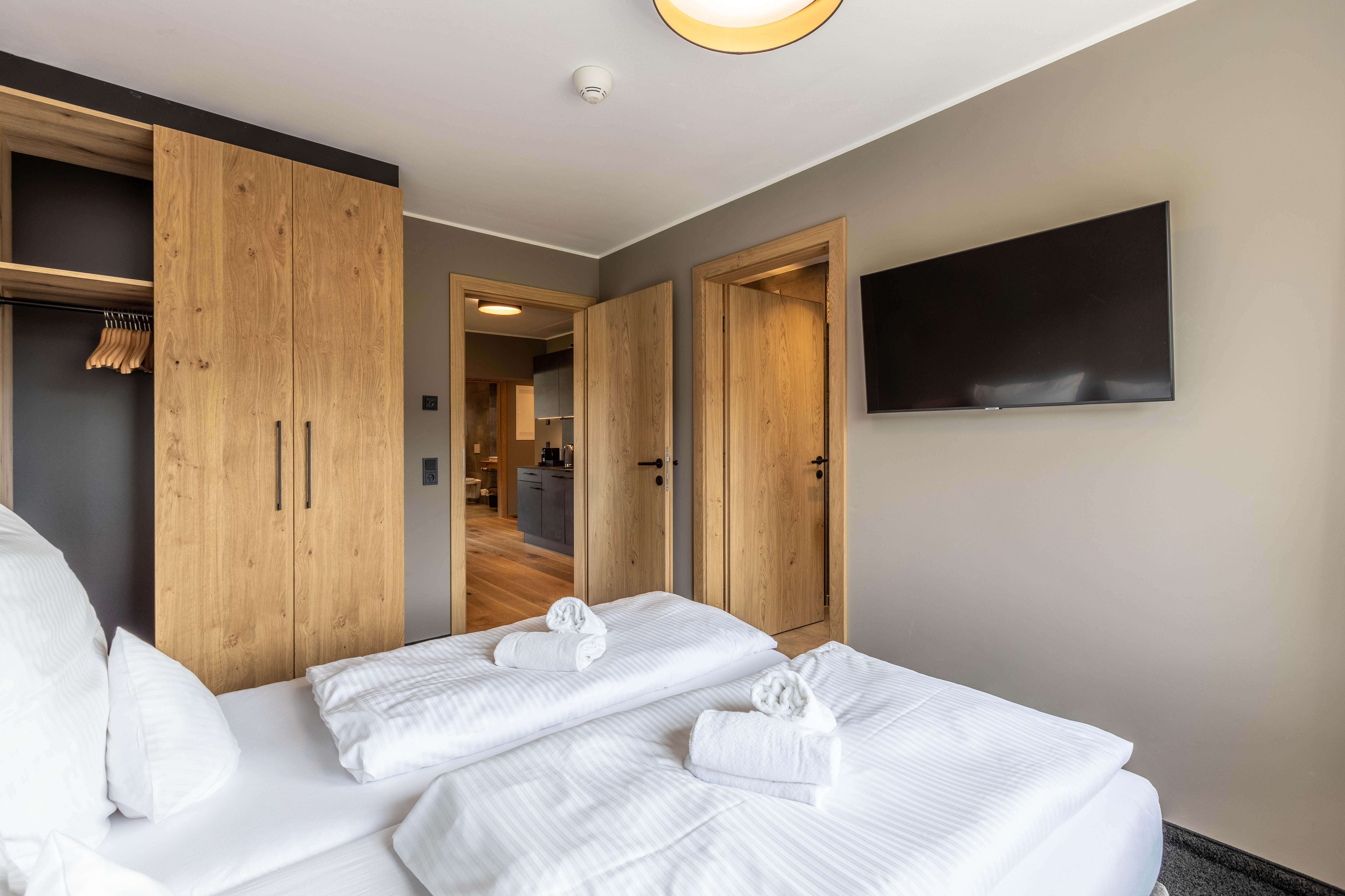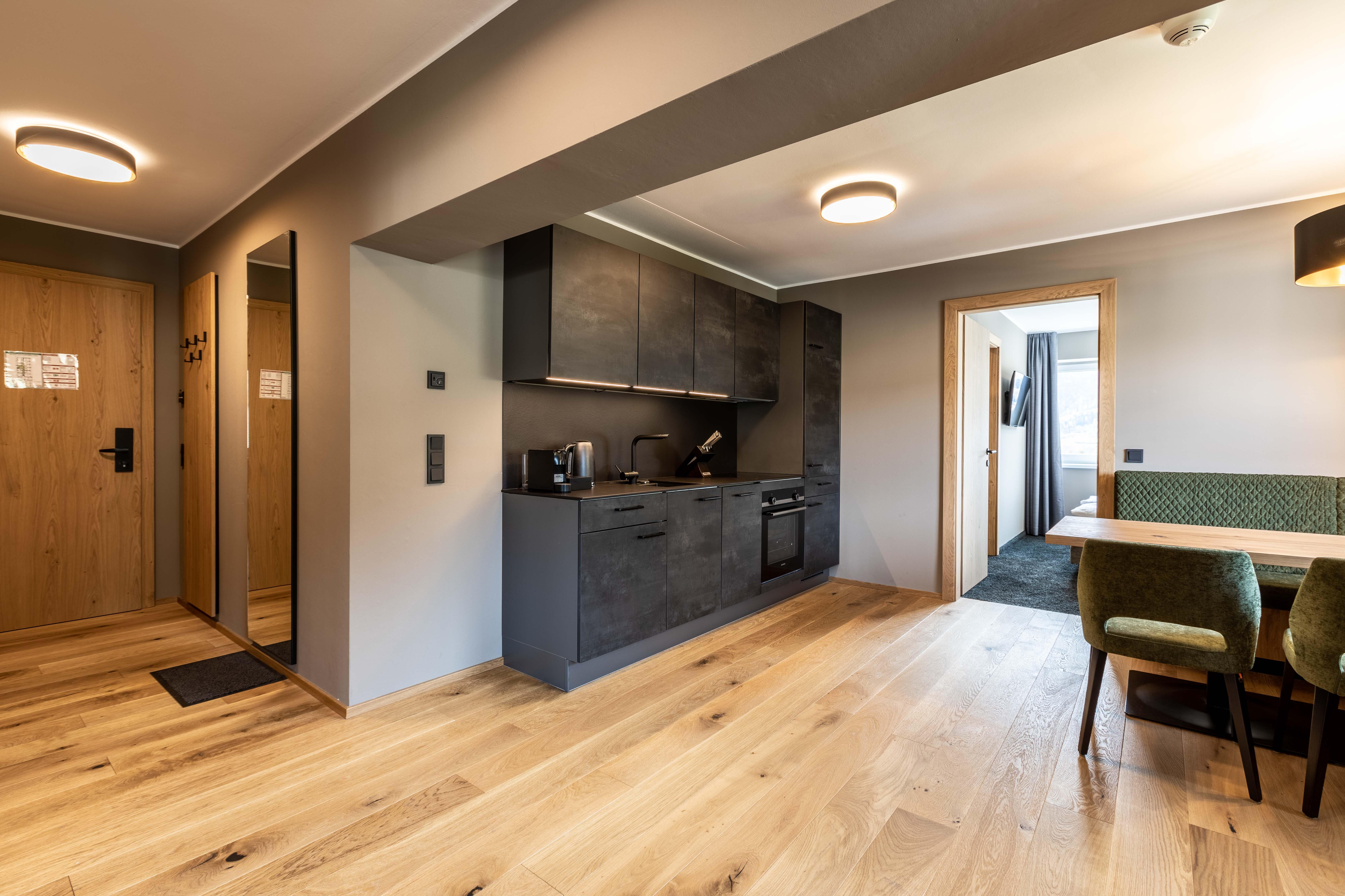 Das Apartment für 6 Personen bietet Wohnküche, 2 Schlafzimmer (Boxspringbetten, 1xeigenes Bad, 1x Balkonzugang), 2 Badezimmer und Balkon. Der Eingangsbereich, mit Garderobe, führt direkt in die Wohnküche, welche mit Küchengeräten, Kühl-Gefrierkombi sowie Nespresso Kaffeemaschine ausgestattet ist. Die Küche verfügt außerdem über Küchengeschirr. Der Esstisch bietet Platz, um ein selbstgekochtes Mahl zu genießen. Im Wohnbereich befindet sich TV, Kleiderschrank und Ausziehsofa. .