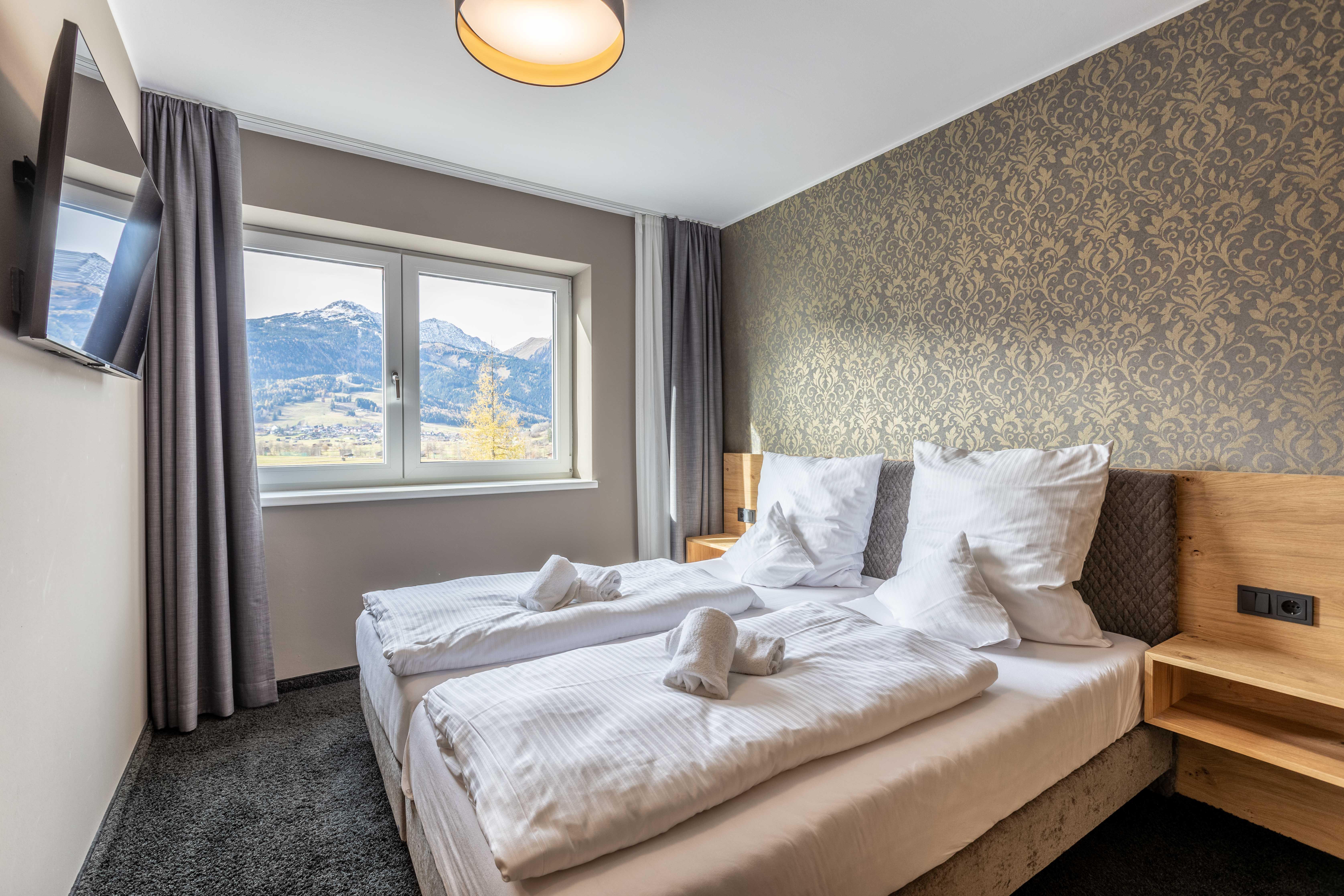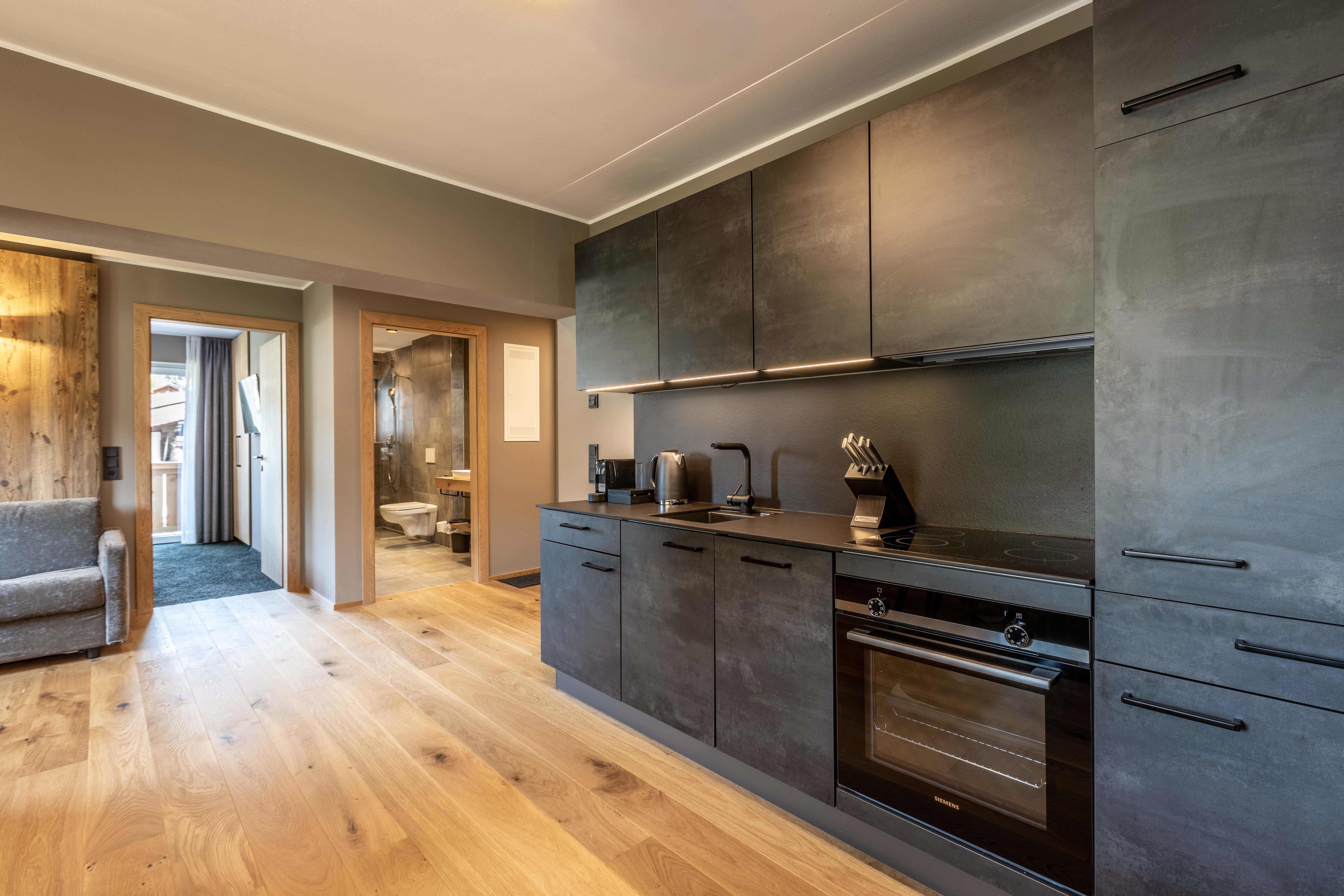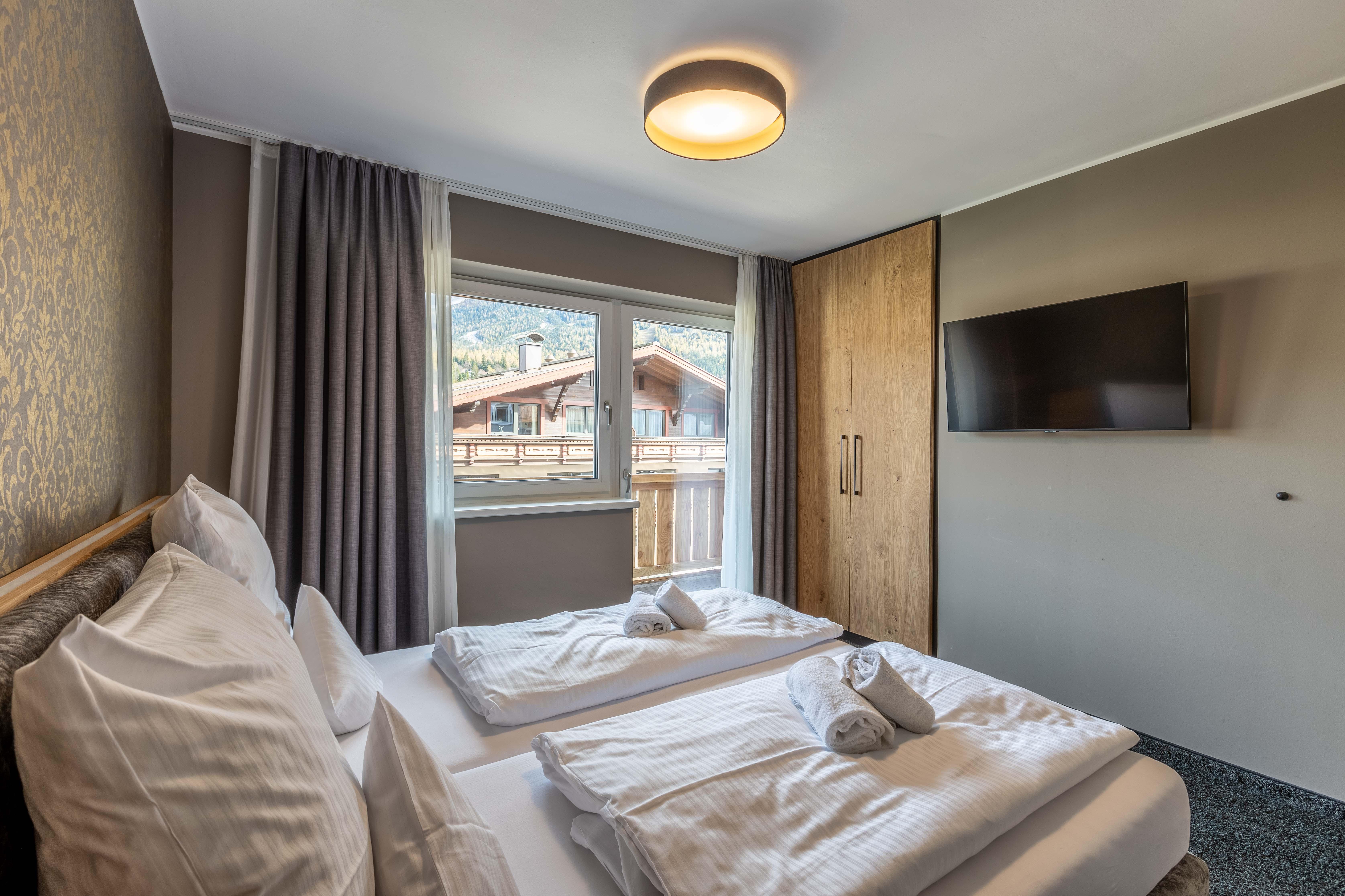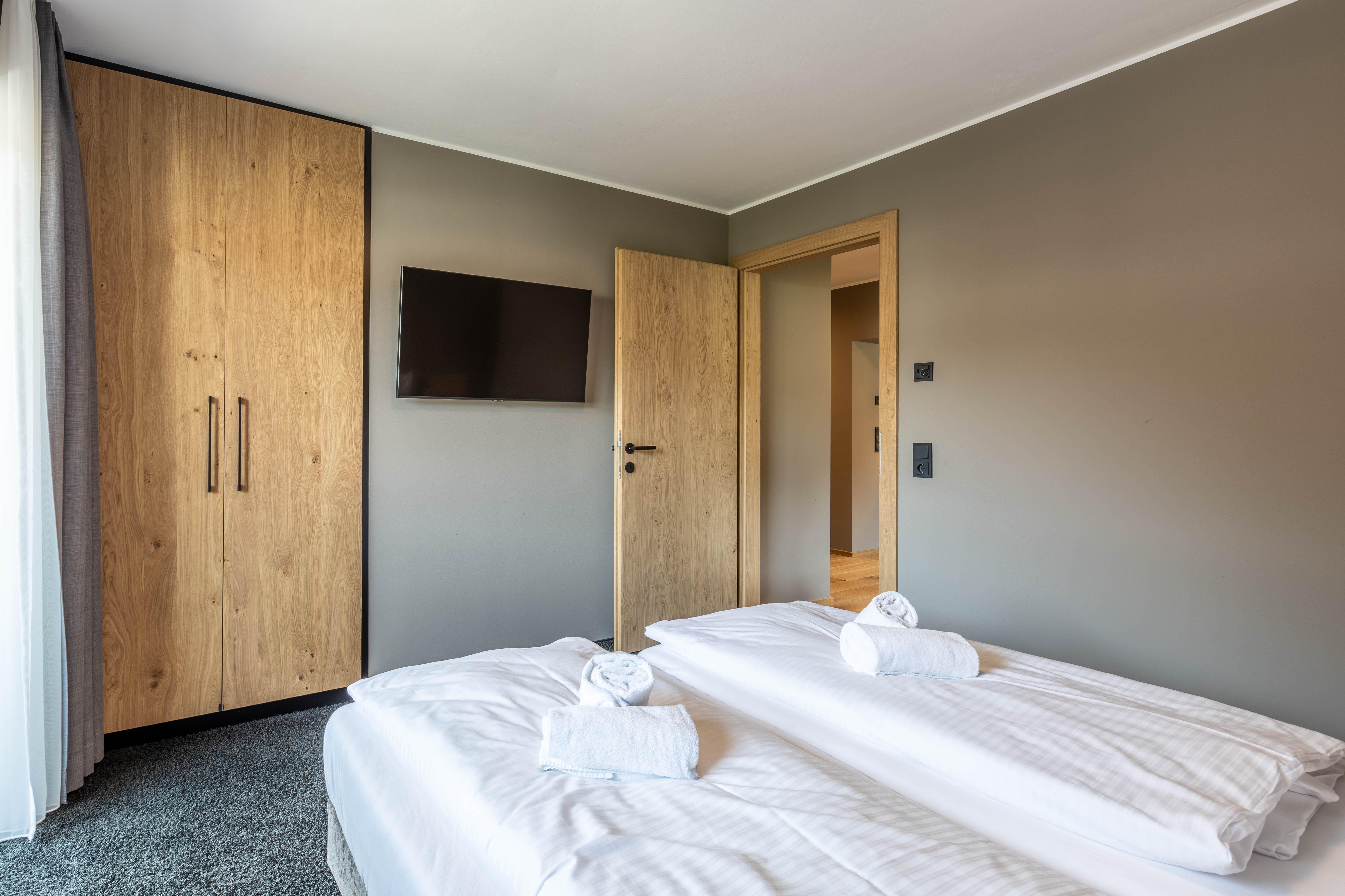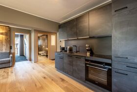Das Apartment für 6 Personen bietet Wohnküche, 2 Schlafzimmer (Boxspringbetten, 1xeigenes Bad, 1x Balkonzugang), 2 Badezimmer und Balkon. Der Eingangsbereich, mit Garderobe, führt direkt in die Wohnküche, welche mit Küchengeräten, Kühl-Gefrierkombi sowie Nespresso Kaffeemaschine ausgestattet ist. Die Küche verfügt außerdem über Küchengeschirr. Der Esstisch bietet Platz, um ein selbstgekochtes Mahl zu genießen. Im Wohnbereich befindet sich TV, Kleiderschrank und Ausziehsofa. .