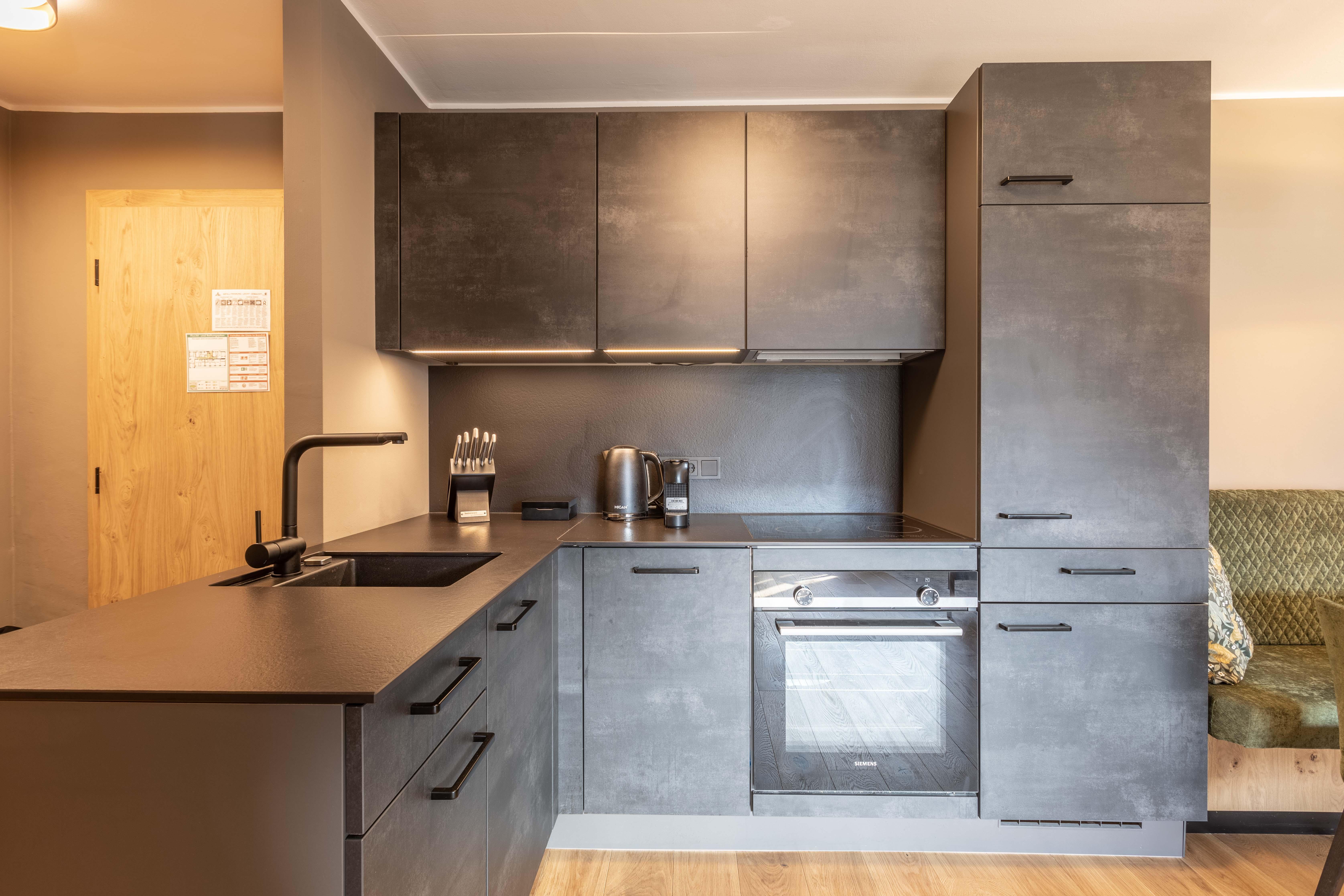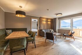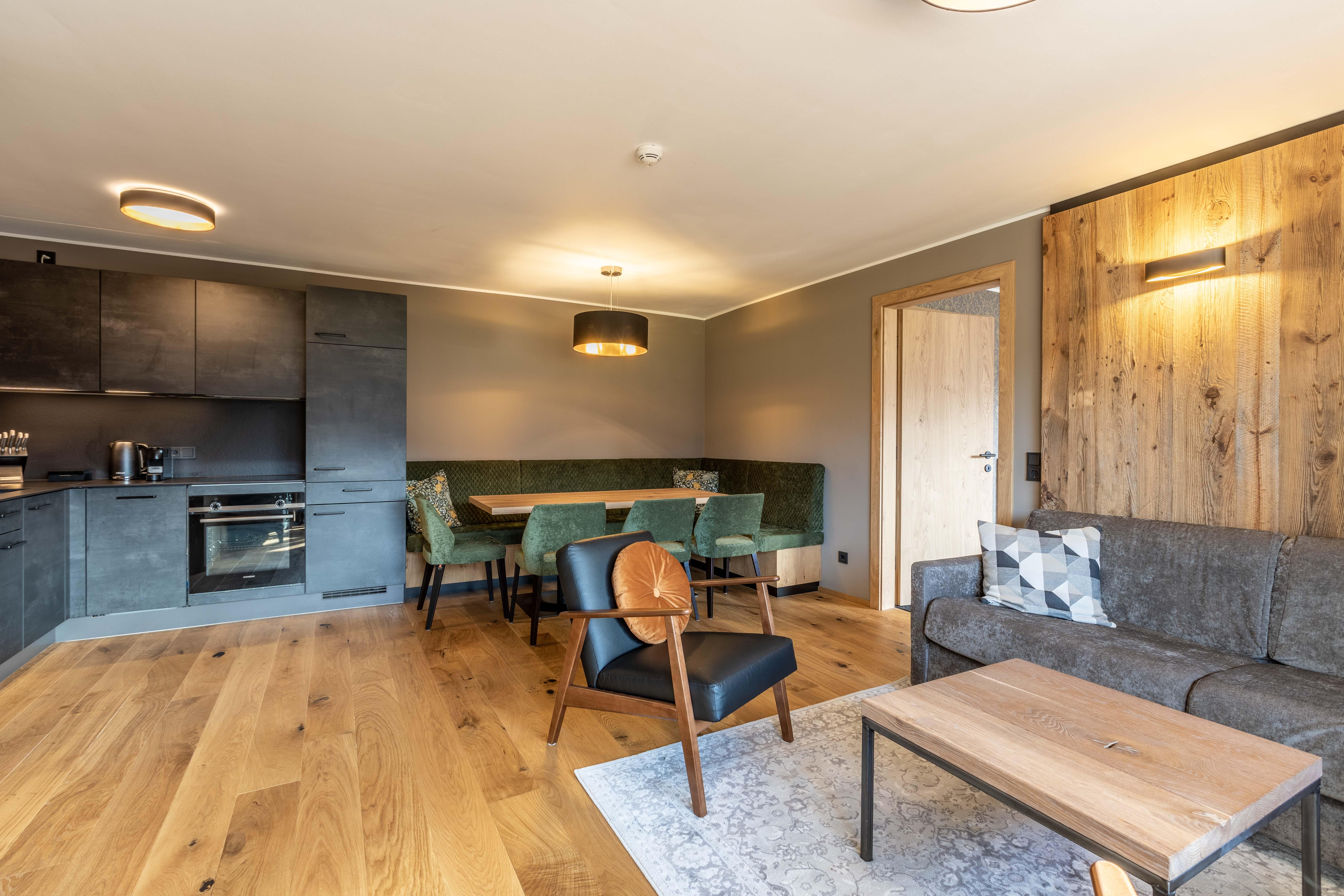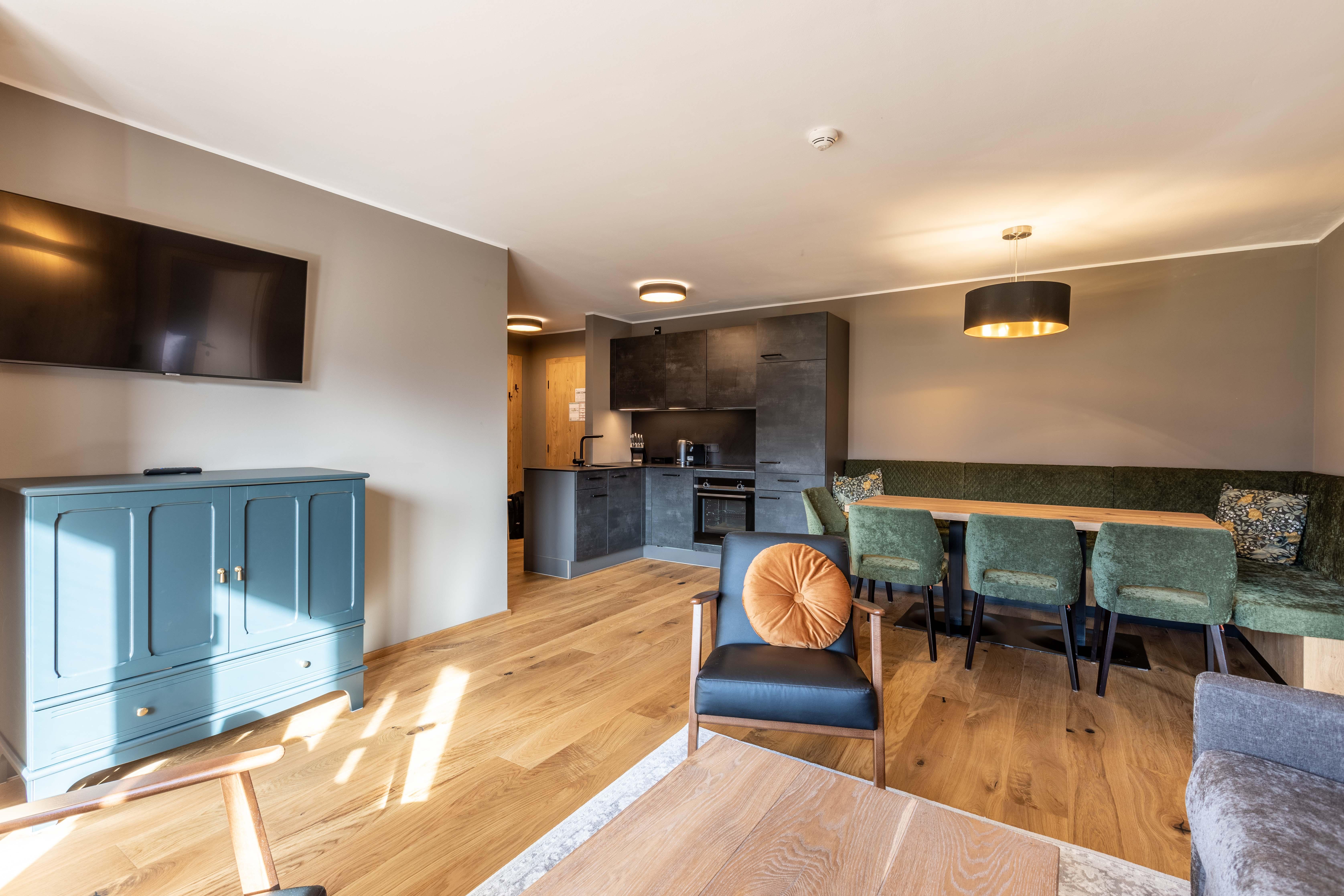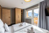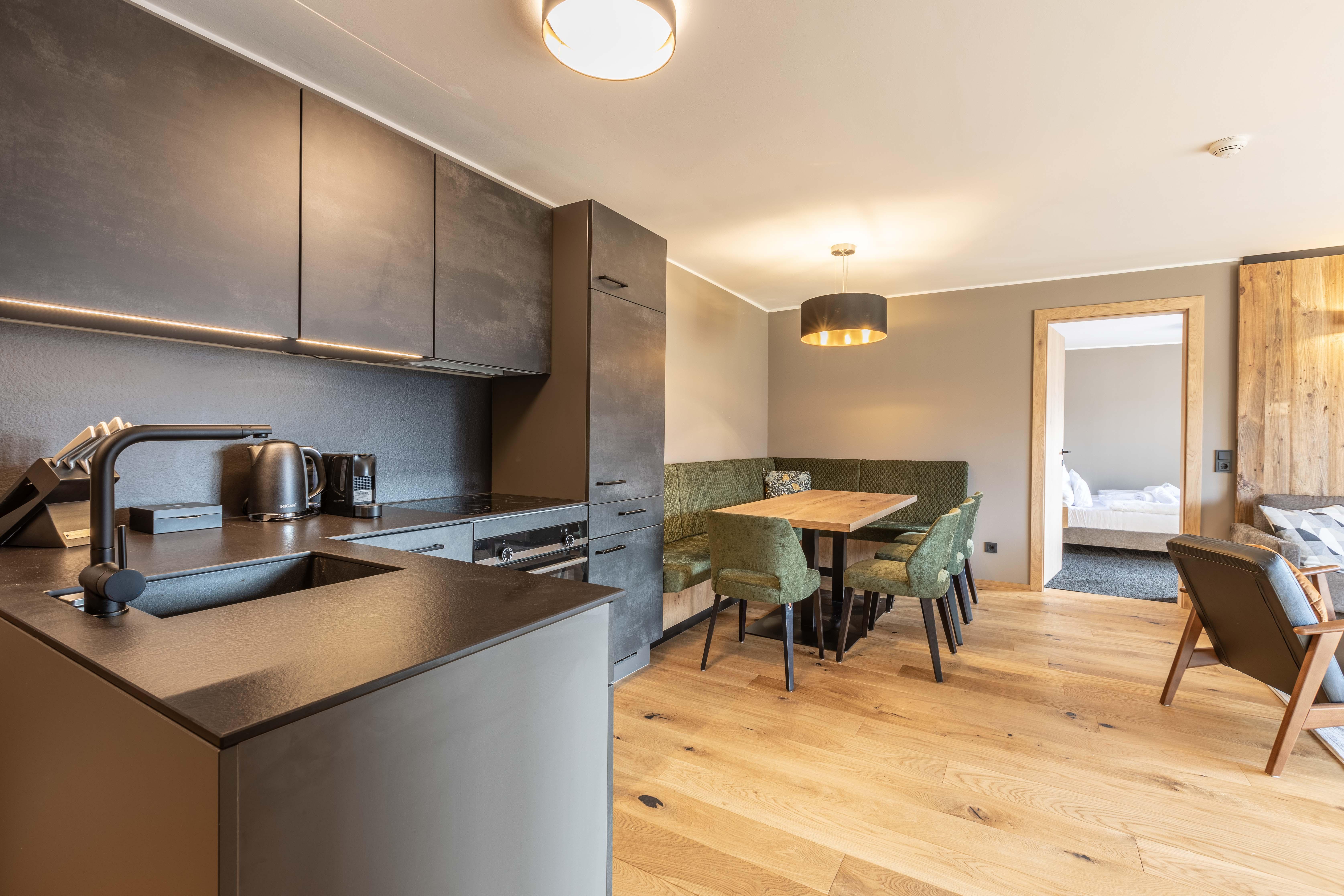 Das Apartment für 8 Personen bietet 2 Schlafzimmer (jeweils Boxspringbett und Balkonzugang), 2 Wohn/Esszimmern (jeweils Ausziehcouch) und 2 Bäder (je ein zusätzliches separates WC) und Balkon. Der Eingangsbereich, mit Garderobe, führt direkt in die Wohnküche (Balkonzugang), welche mit Esstisch, TV, Kleiderschrank und einem Ausziehsofa ausgestattet ist. Die Küche ist mit Küchengeräten, Kühl-Gefrierkombi sowie Nespresso Kaffeemaschine ausgestattet und verfügt außerdem über Küchengeschirr.