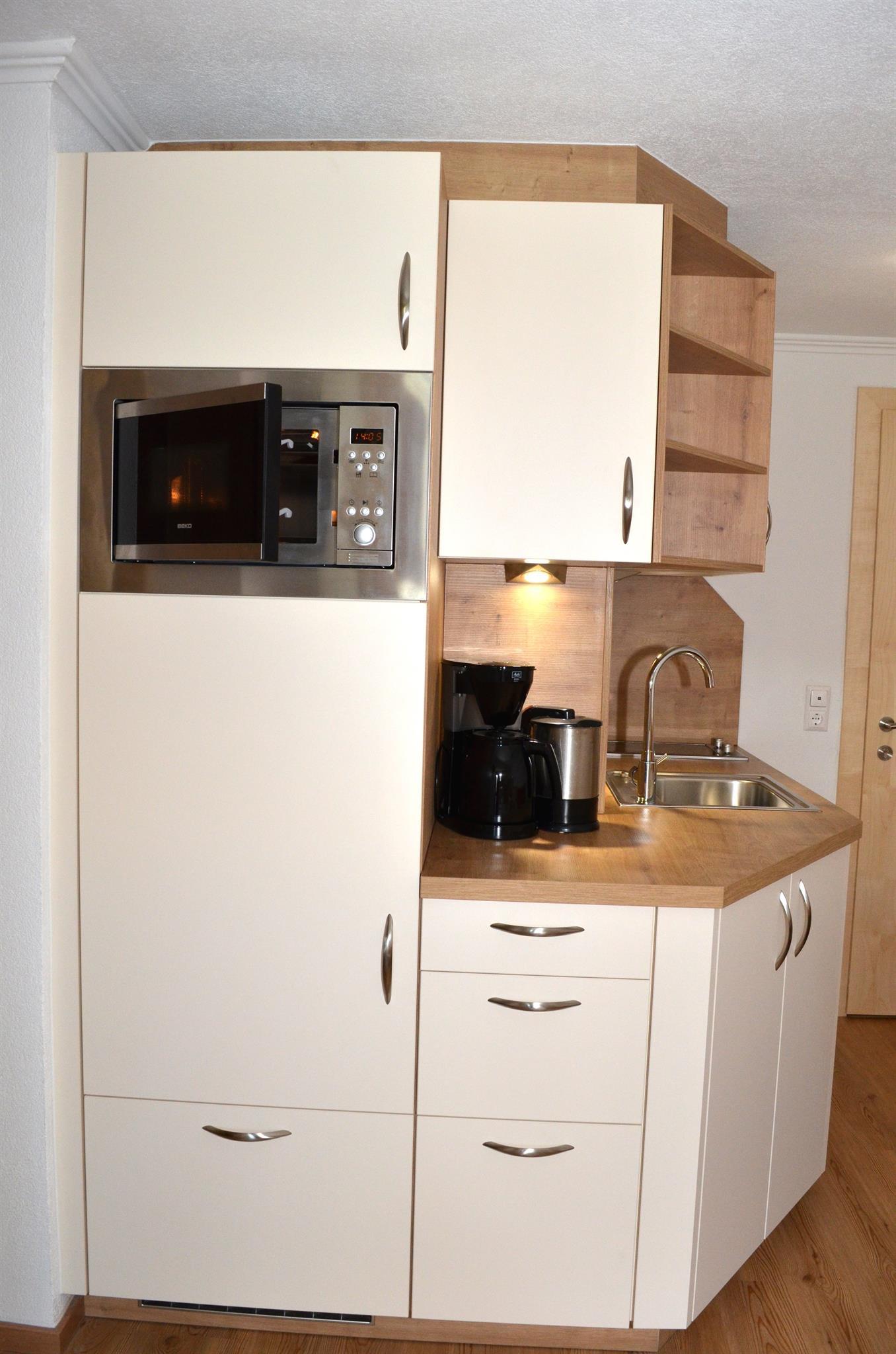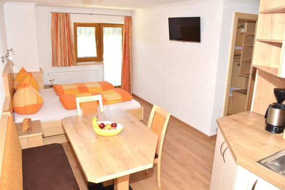 Im Wohnraumschlafraum ist ein Tisch mit Sitzbank und 2 Sesseln, ein Doppelbett, TV, und eine Küche mit Kühlschrank, Wasserkocher, Kaffeemaschine, 2 Herdplatten, Mikrowelle und Minibackofen.