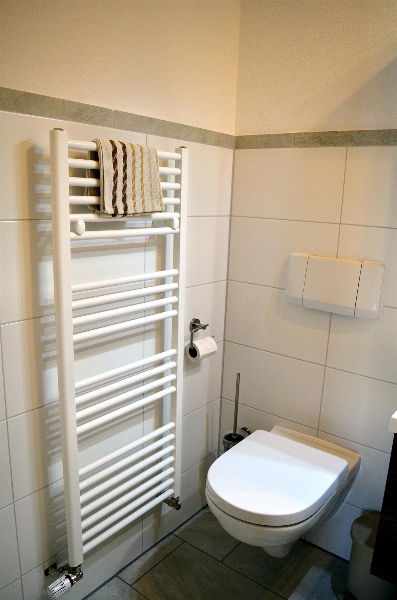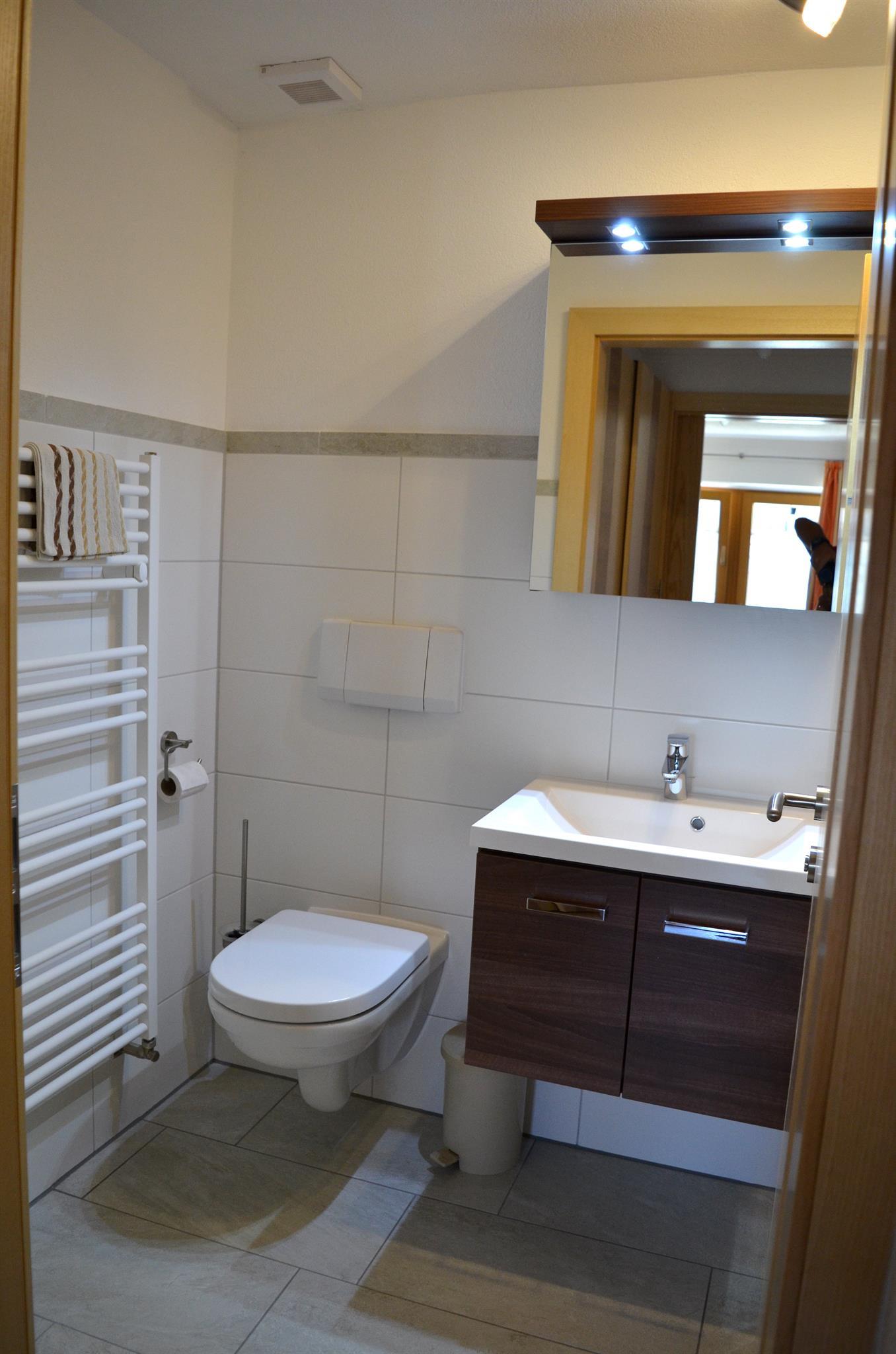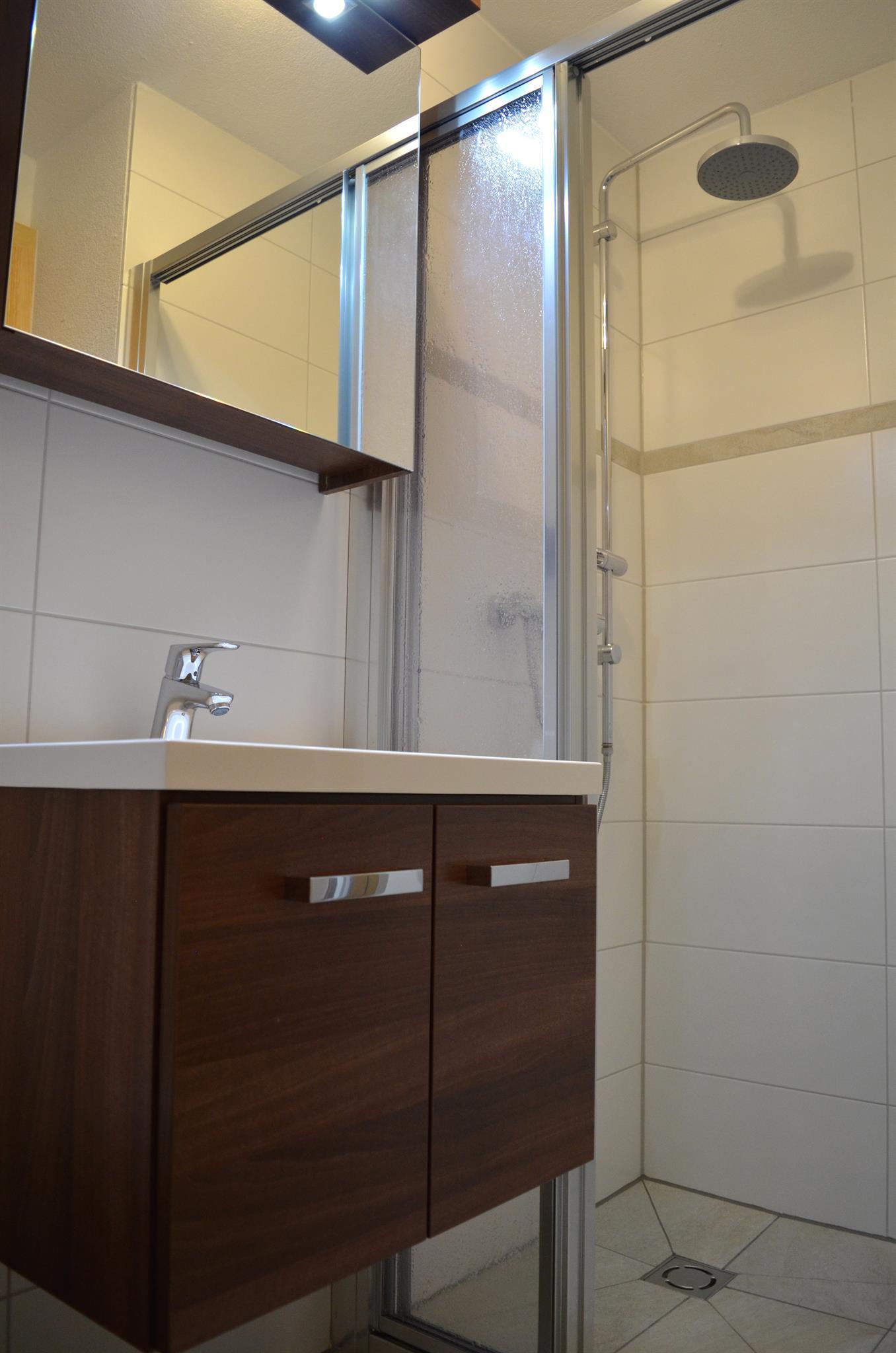 Im Bad befindet sich eine Dusche, Waschbecken und WC.