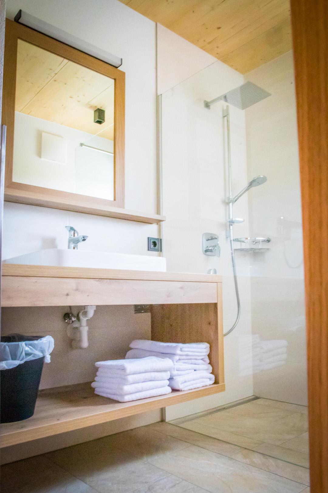 schönes großes Wohlfühl-Badezimmer mit Dusche, Handtücher und Föhn, getrenntes WC