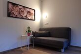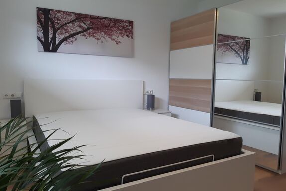 Die Wohnung (45 qm) eignet sich für 2 - 4 Personen, hat ein Schlafzimmer mit Doppelbett, einen Wohnraum mit einer Küche / einem Esstisch und einer ausziehbaren Couch. Das Bad ist mit einer Dusche und einem WC ausgestattet.