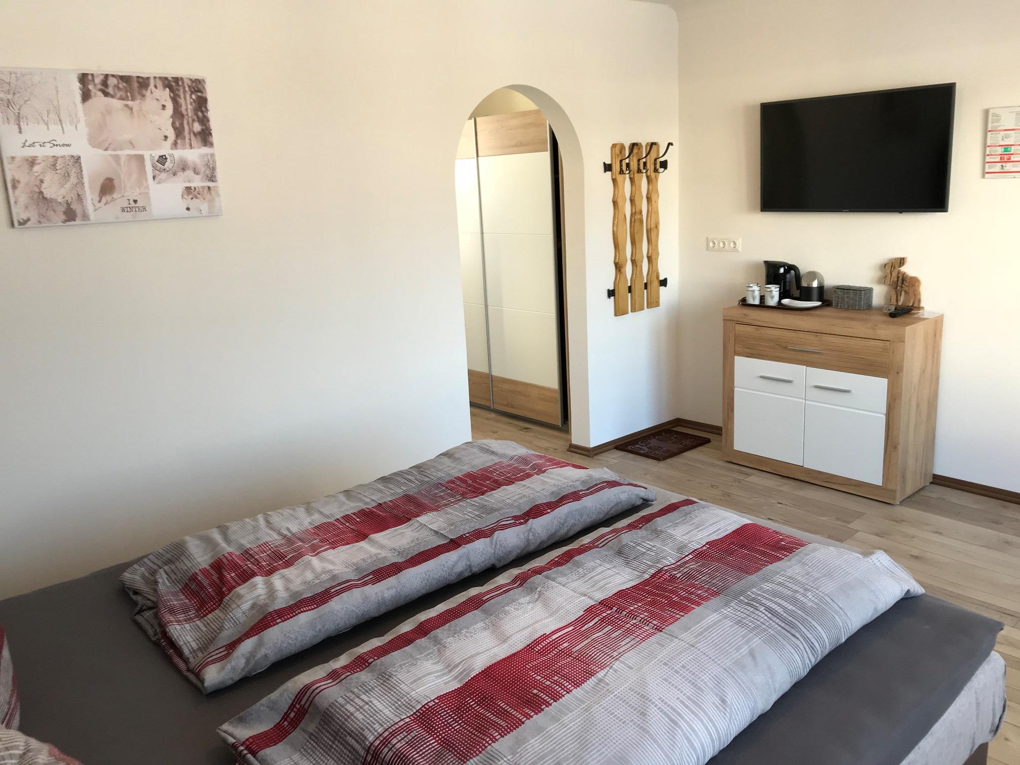 Es verfügt auch über ein neues Boxspringbett. Zusätzlich ist das Zimmer mit TV und Wasserkocher ausgestattet.