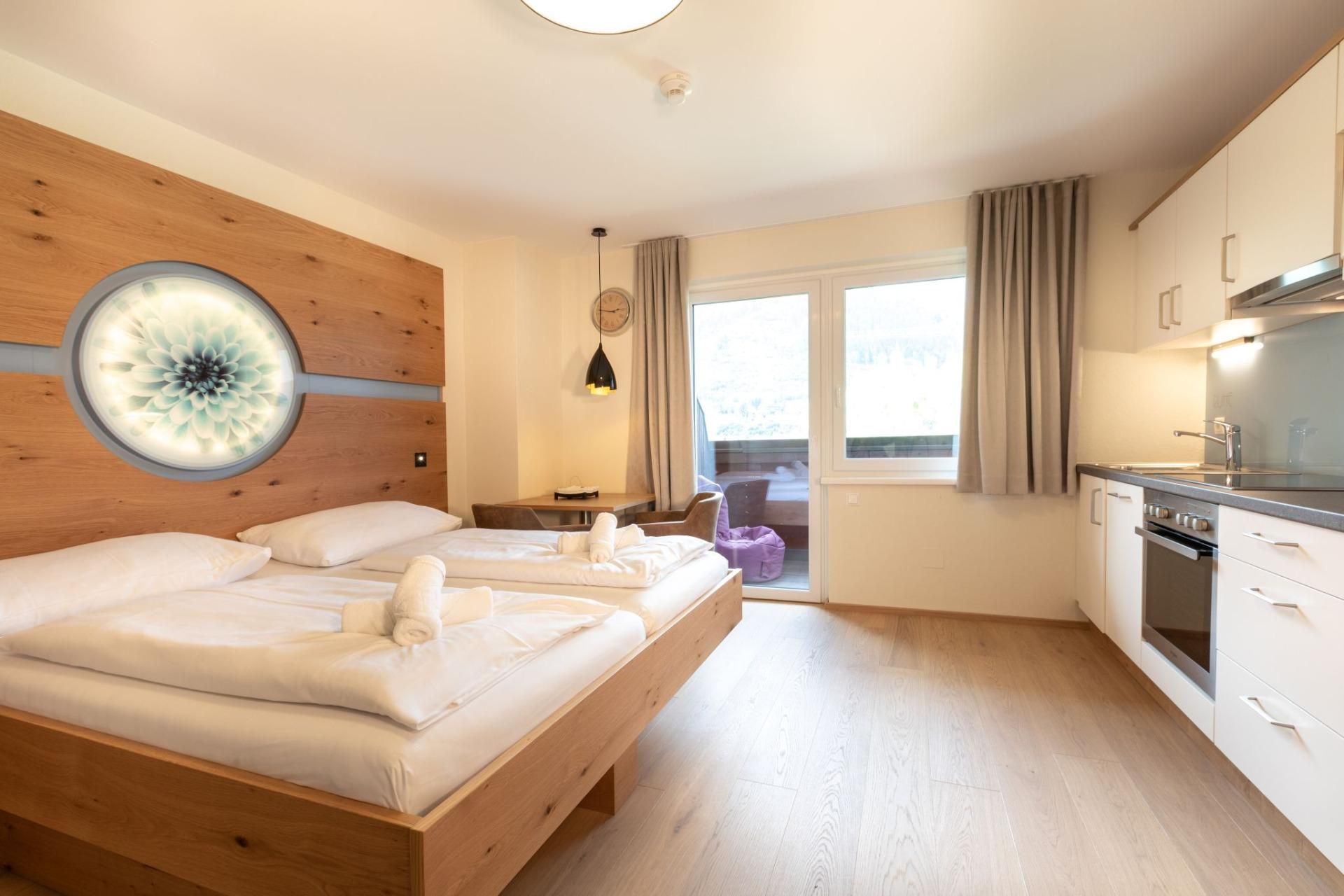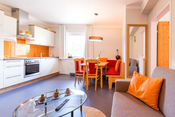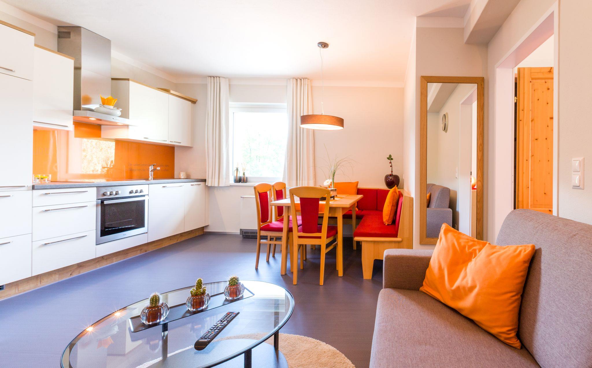 In der Kategorie Appartement Family 1 Schlafzimmer mit Balkonsteht Ihnen ein besonders familienfreundliches Zweiraumappartement im zweiten Stock zur Verfügung, in dem 3 – 6 Personen auf ca. 48 m² Wohnfläche urlauben. Erholung und angenehme Träume finden Sie im Familienschlafzimmer mit King-Size-Bett, Doppelcouch und Dusche mit WC. Die Küche ist voll ausgestattet und bietet einen einladenden Wohn- und Essbereich mit großem Esstisch und Doppelcouch. Bettwäsche und Handtücher sind inklusive. Vom großzügigen Balkon aus blicken Sie zum eindrucksvollen Dachstein-Massiv.