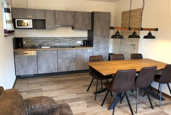 Küche mit Mikrowelle, Geschirrspüler, Kaffeemaschine und Wasserkocher.