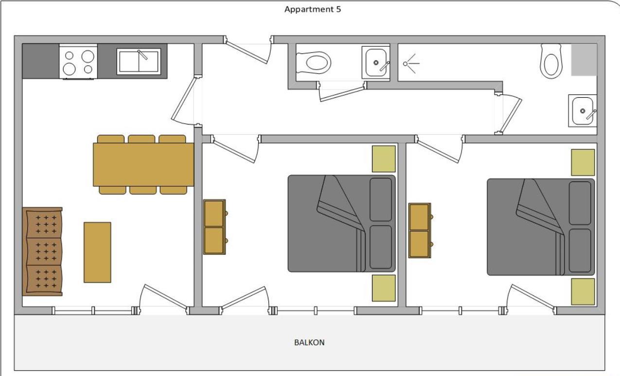 Das neu renovierte Appartement für 1 bis 6 Personen ist mit Küche, Wohnzimmer mit Sofa und Esstisch sowie 2 Schlafzimmer ausgestattet. Es verfügt auch über 1 Badezimmer mit Dusche/WC und ein separates WC mit Waschbecken.