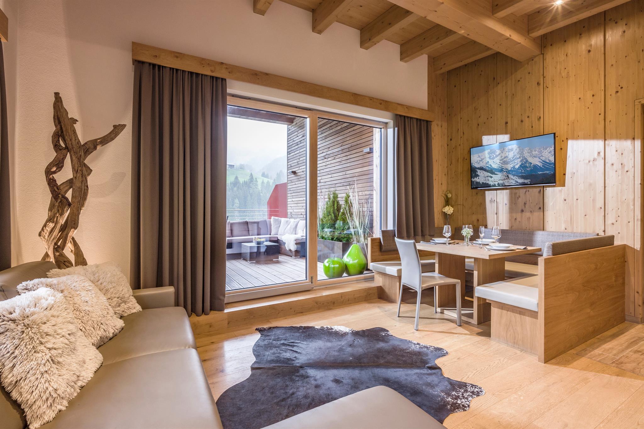 Unser Appartementhaus ist luxuriös und mit höchstem Wohnkomfort und viel Liebe zum Holz ausgestattet, liegt zentral, sonnig und doch ruhig auf 900m Seehöhe in Auffach