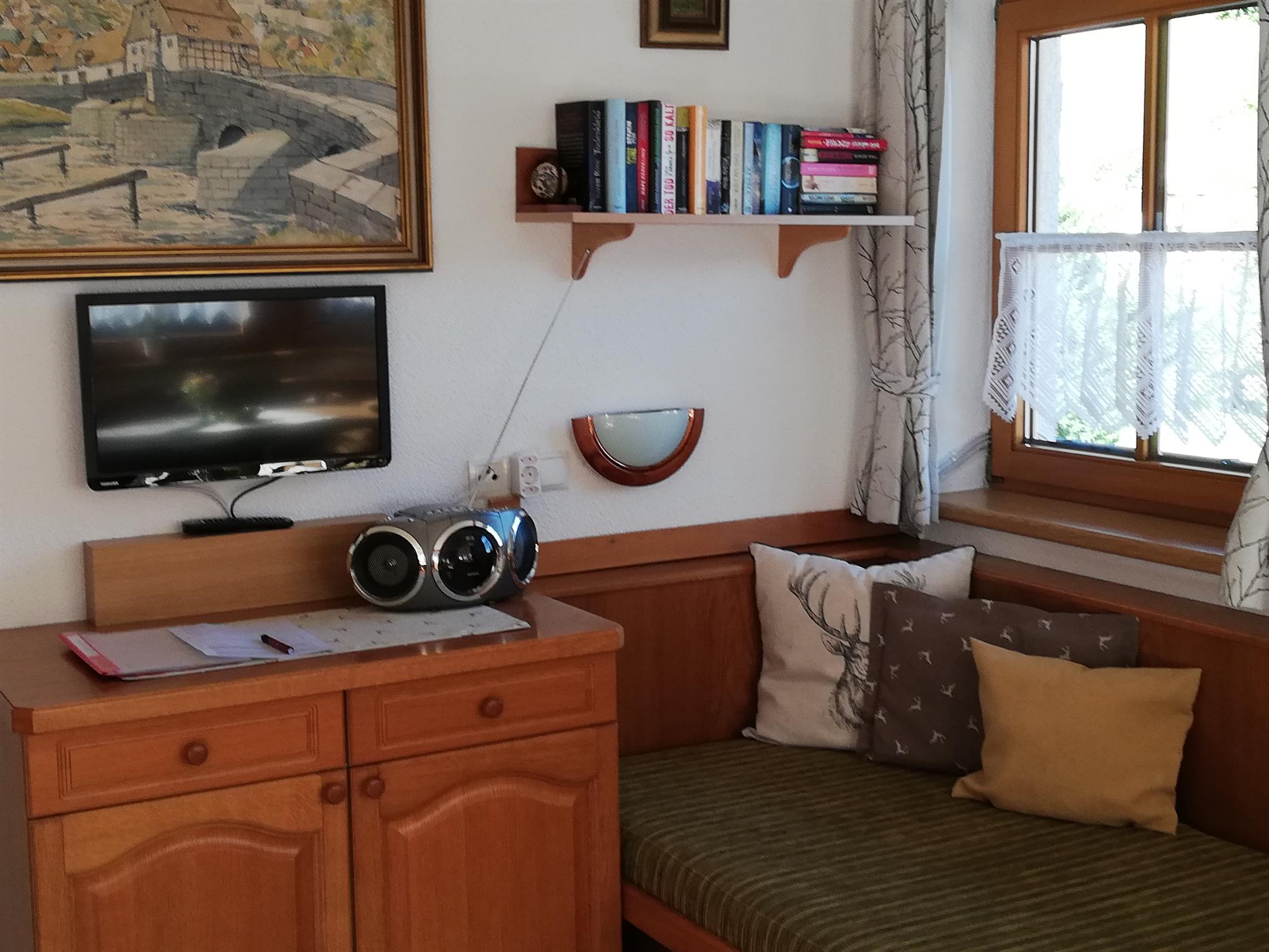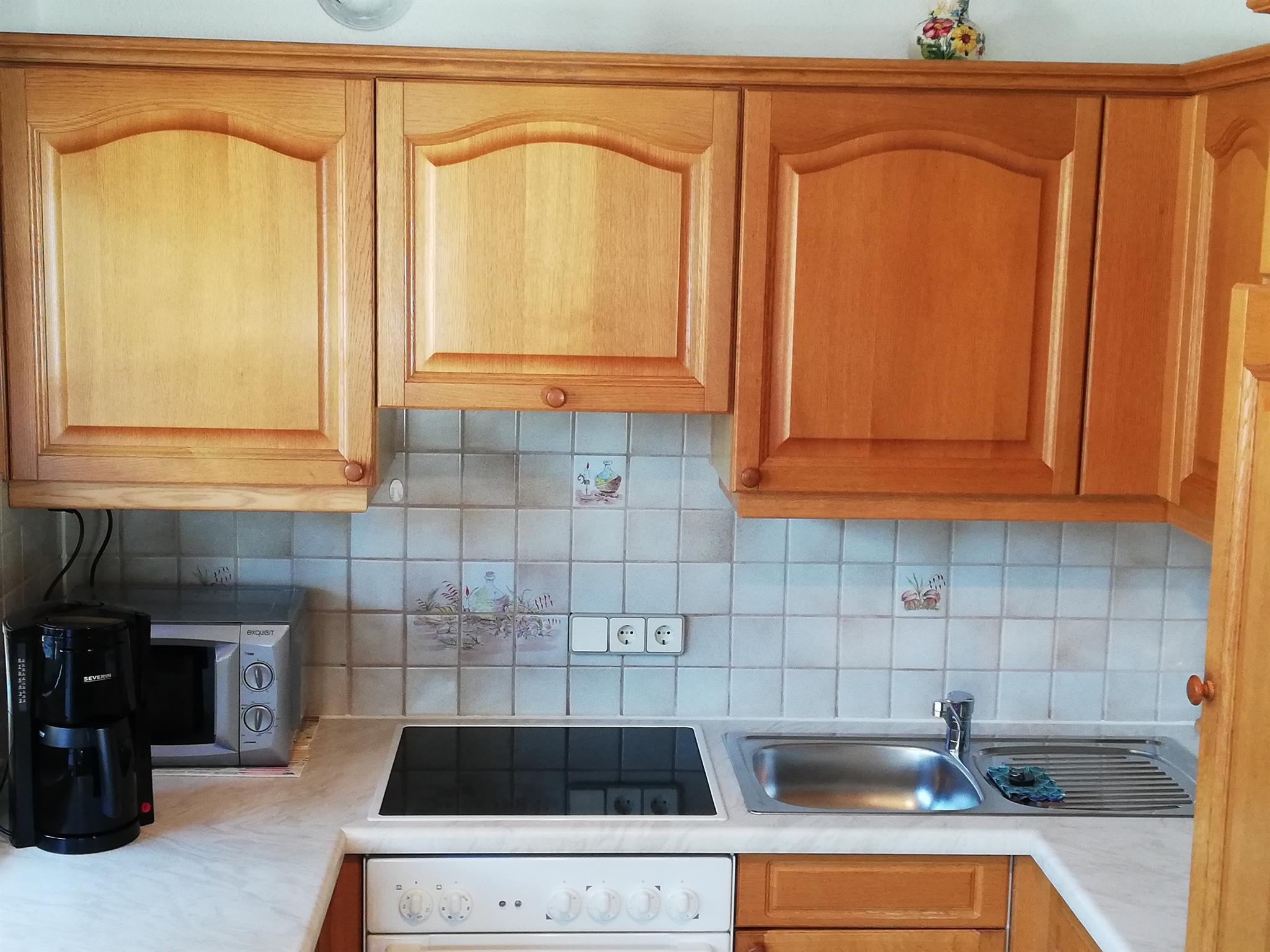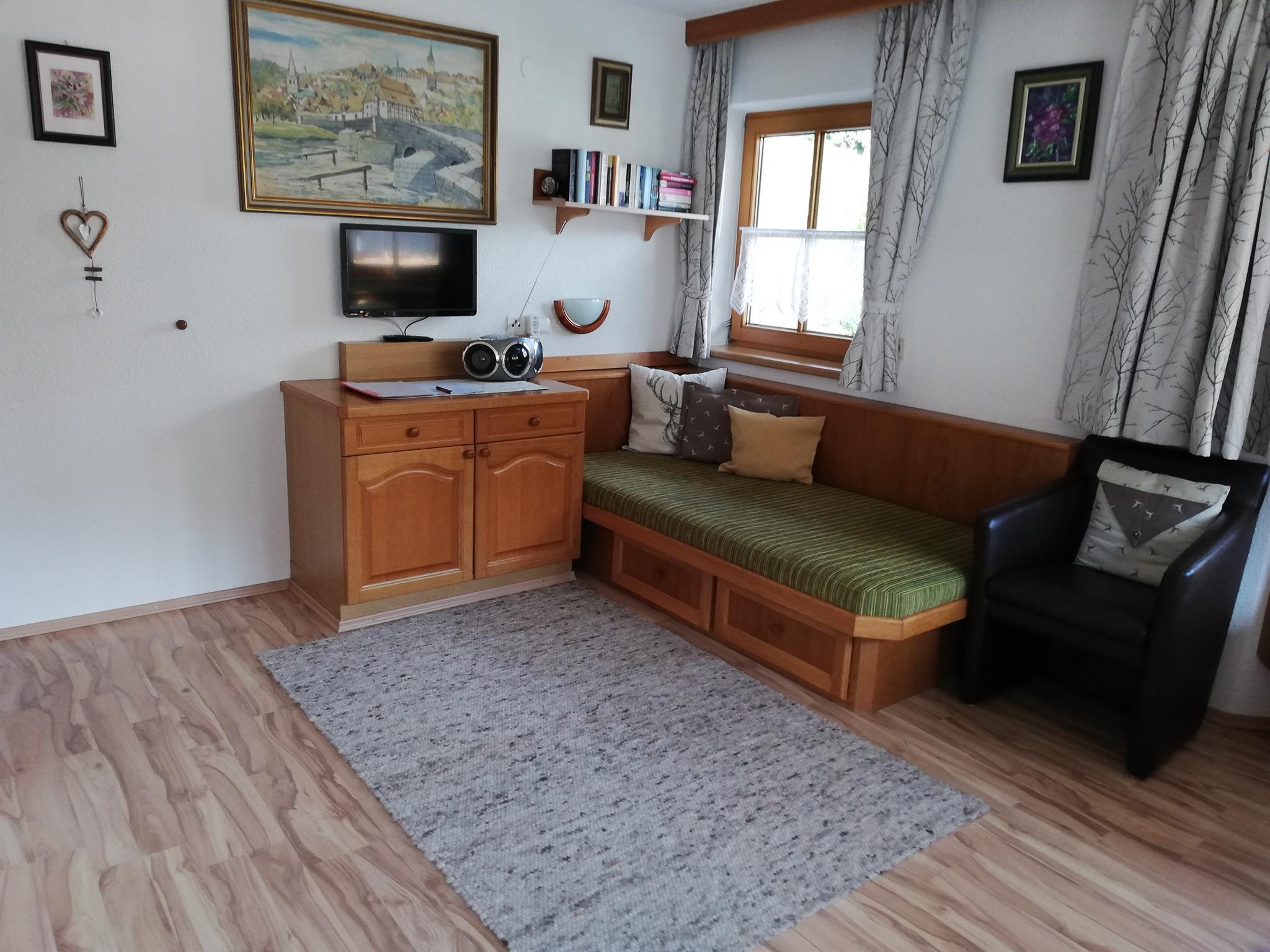 50 m², komplett eingerichtete Wohnküche mit Kochecke , gemütlicher Erker mit Essbereich, Einbauliege, SAT- Flach-TV und Radio/CD-Spieler, Schlafzimmer ( 3 Betten) ( Vollholzmöbel, allergikergeeignete Bettwäsche, Baby- Reisebett gratis auf Anfrage, Dusche/WC mit Haarfön, Hand- u. Duschtücher, Kosmetikspiegel, Vorraum , Garderobe, möblierter u. überdachter Balkon.