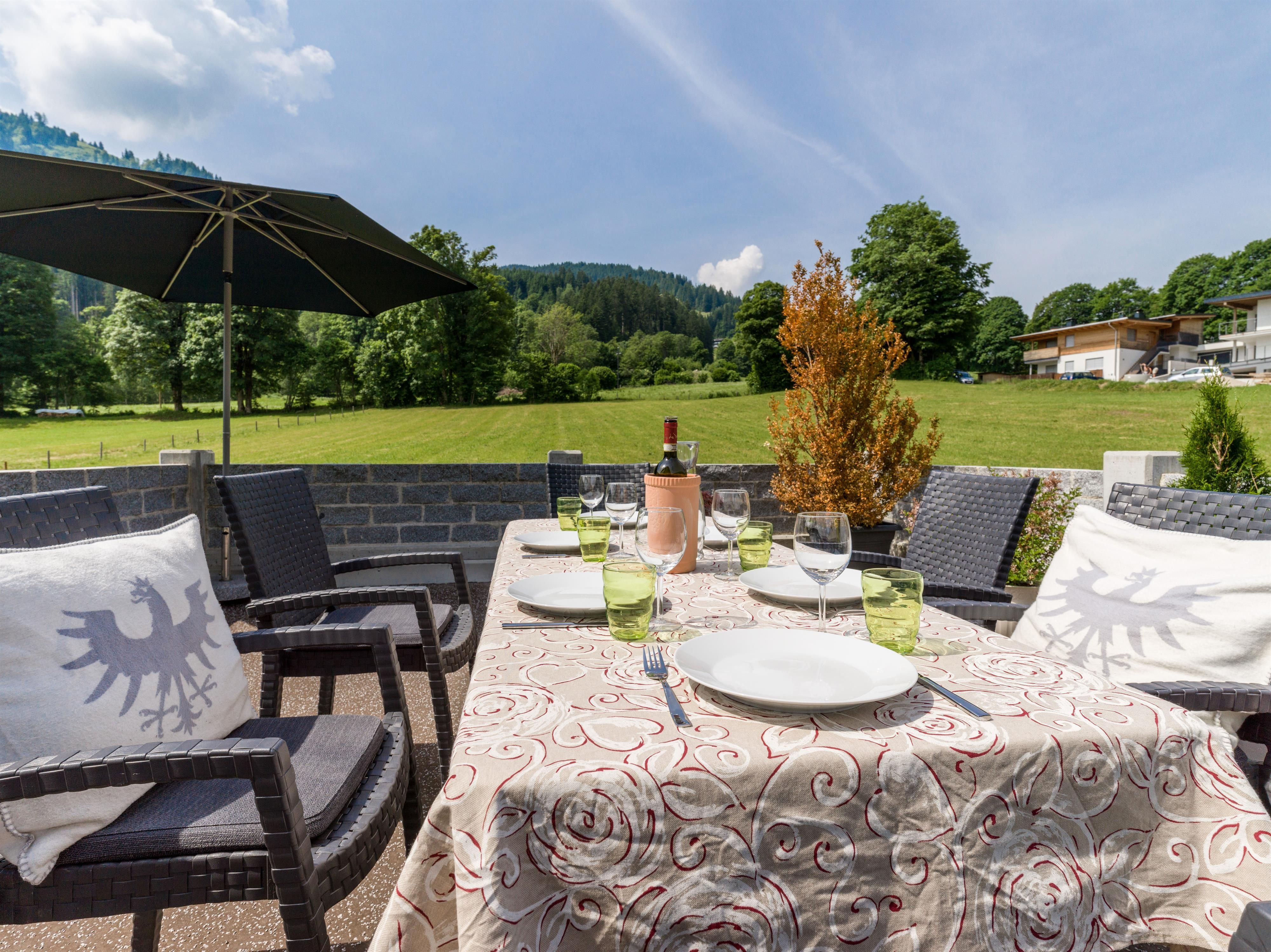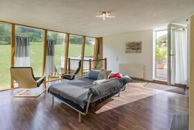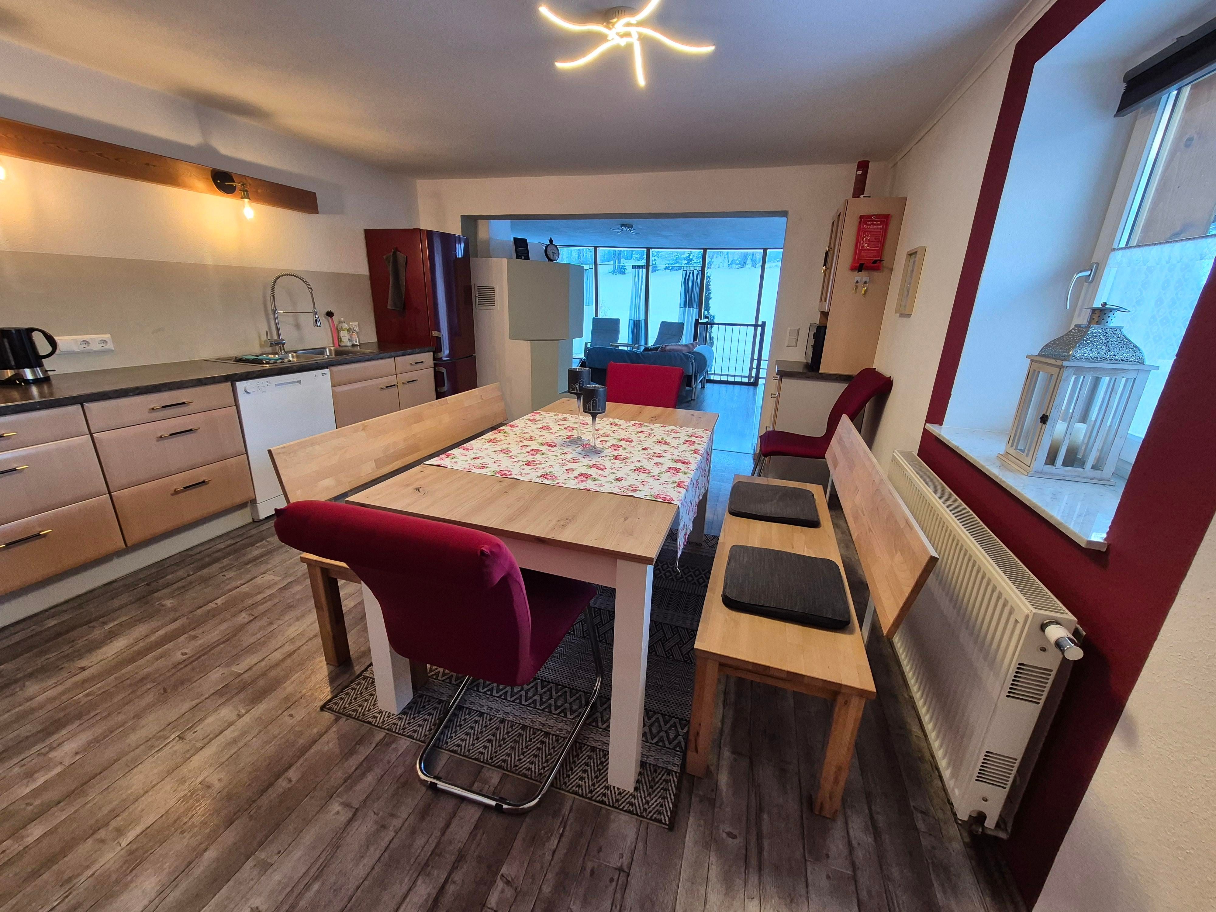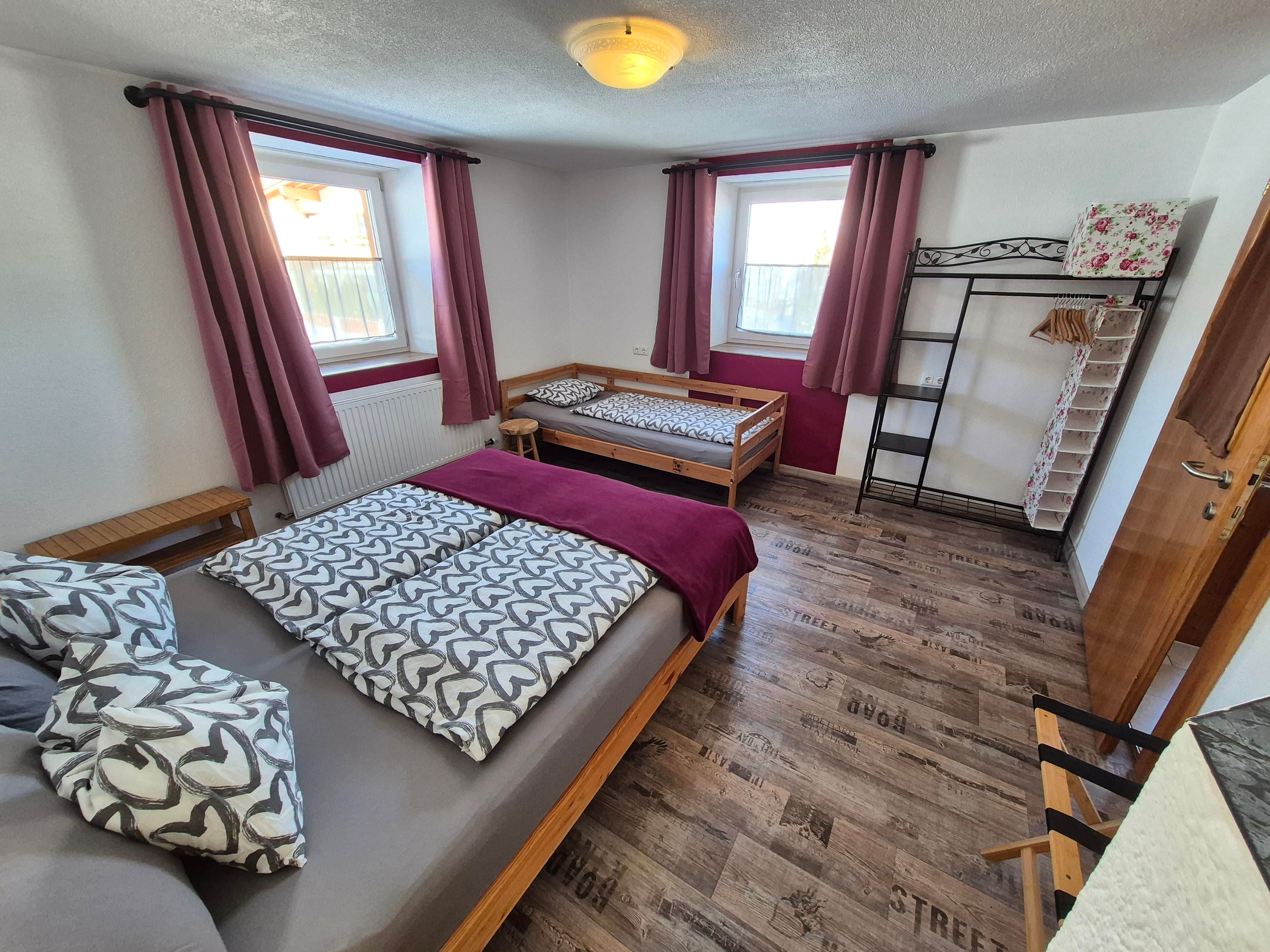 Charmante Ferienwohnung auf großzügigen 114 m², mit herrlichem Blick auf Wiesen und Berge. Küche mit allem was man braucht und großem Tisch zum gemütlichen zusammen sitzen . Sehr großes Bad mit Dusche, Badewanne, Doppelwaschbecken, Waschmaschine. Eine extra Toilette ( im Eingangsbereich). 2 Schlafzimmer mit je einem Doppelbett und einem Einzelbett. Bei Bedarf Babybett und Zusatzbett.